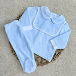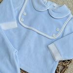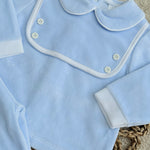 Keep your little one cozy and stylish with this luxurious 2-piece velour baby set, available in sizes 3, 6, and 9 months. This charming outfit includes a soft long-sleeved top with a Peter Pan collar and button detail on the chest, paired with matching footed pants for all-day comfort.