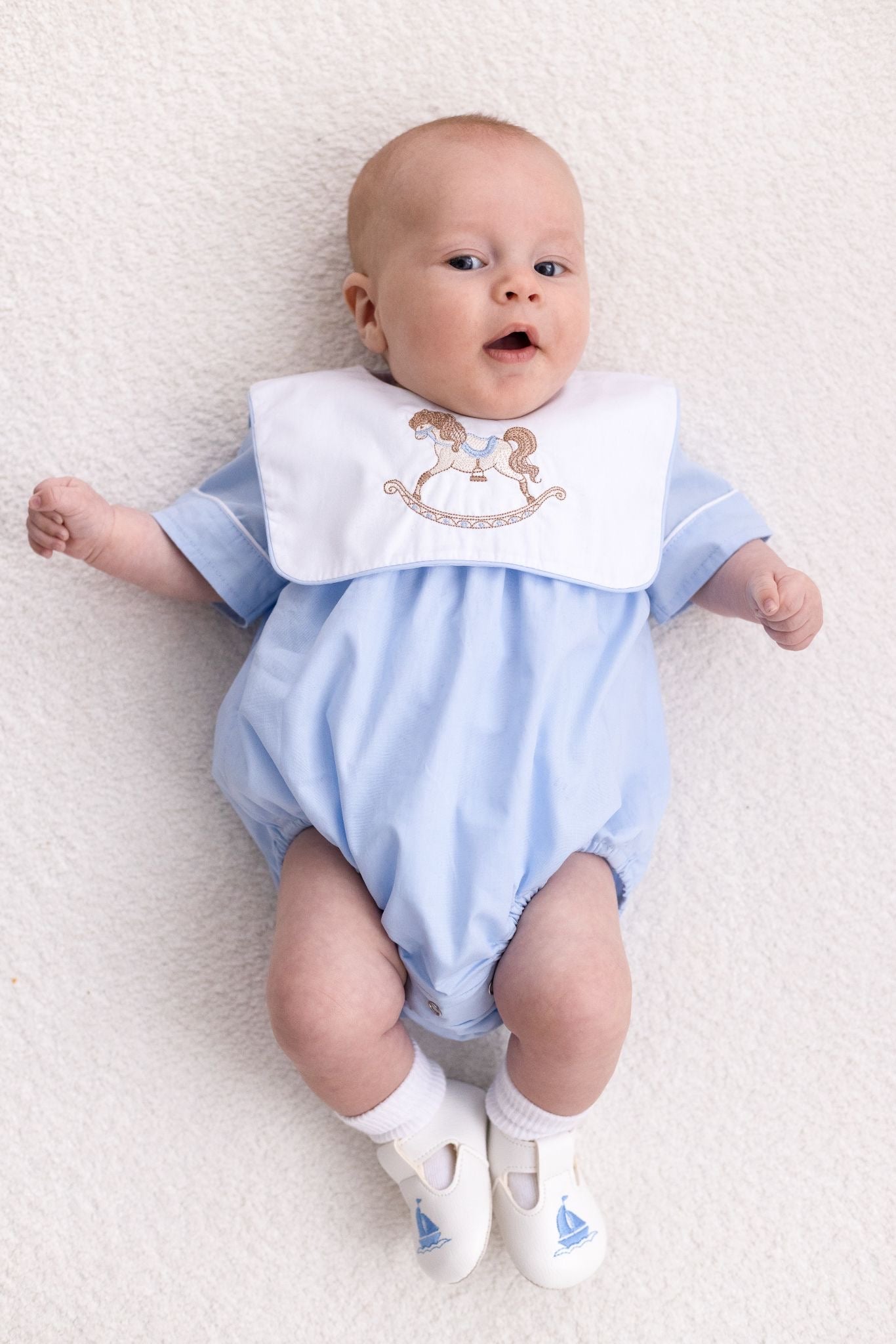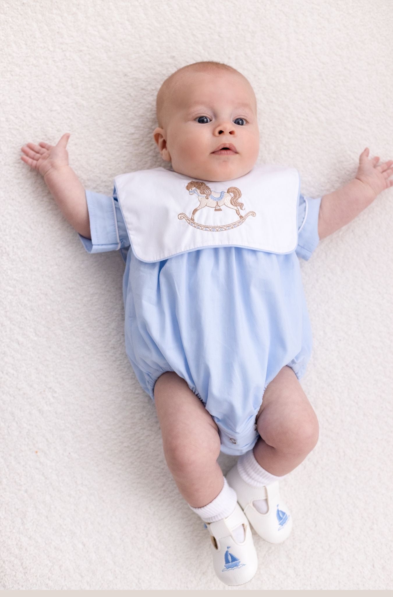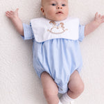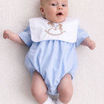 baby boy romper,traditional baby romper,bib collar baby romper,sleeveless baby boy romper,embroidered baby romper,classic baby boy outfit,heirloom baby clothing,baby boy summer romper,luxury baby boy clothing,traditional baby clothes UK,hot air balloon baby romper,rocking horse baby romper