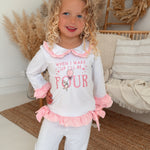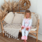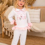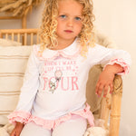 These charming little girls' white cotton PJs are a perfect blend of comfort and elegance. The top features delicate pink double frill cuffs and a pretty pink frill collar, adding a touch of sweetness. Two beautiful bows adorn the front, giving it an extra special detail. The matching pants are finished with a double frill at the bottom of the legs for a playful and feminine touch. These PJs can also be personalized with pink embroidery on the front, making them an ideal gift or keepsake. Soft, stylish, and customizable, they’re sure to be a favourite for your little one.