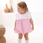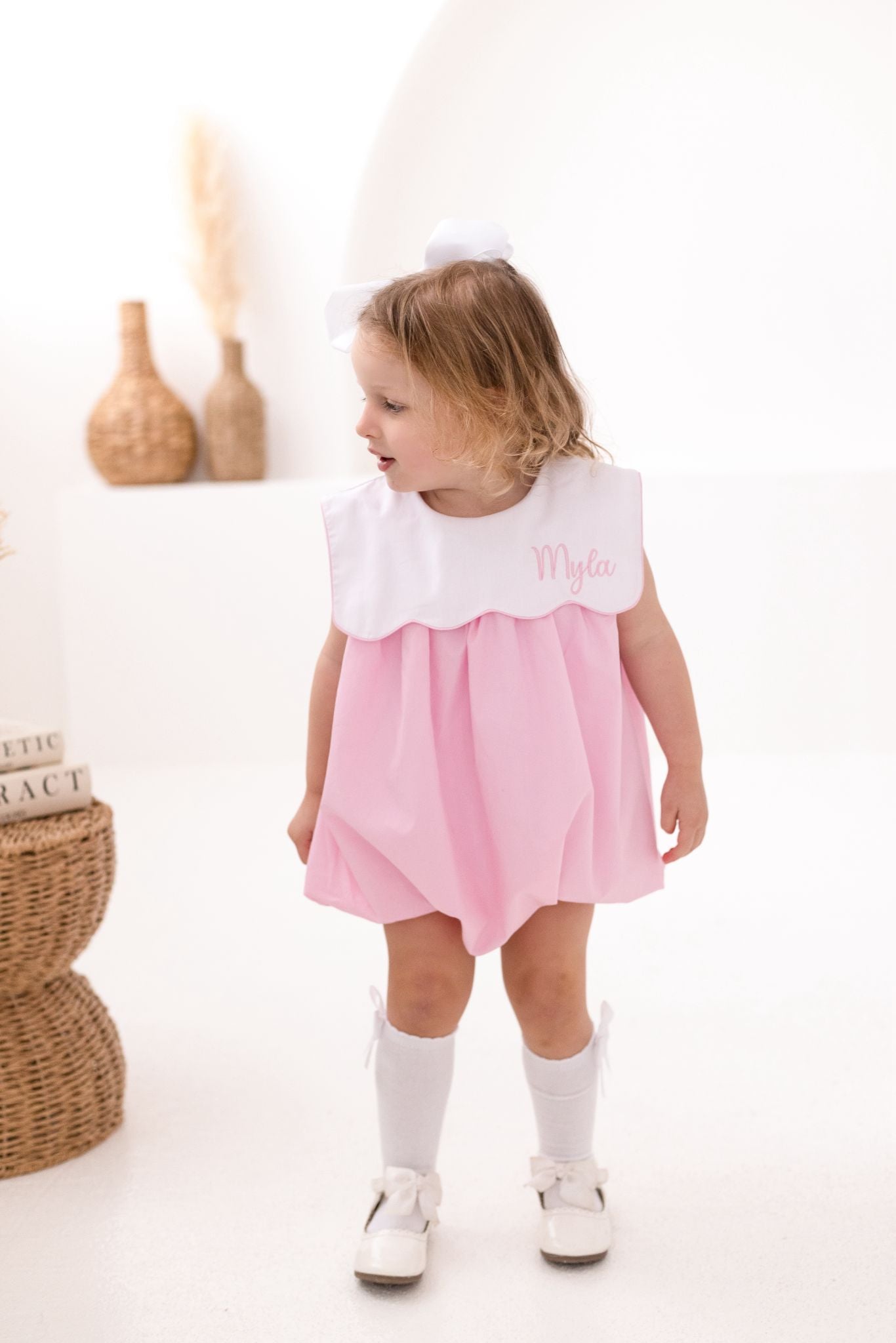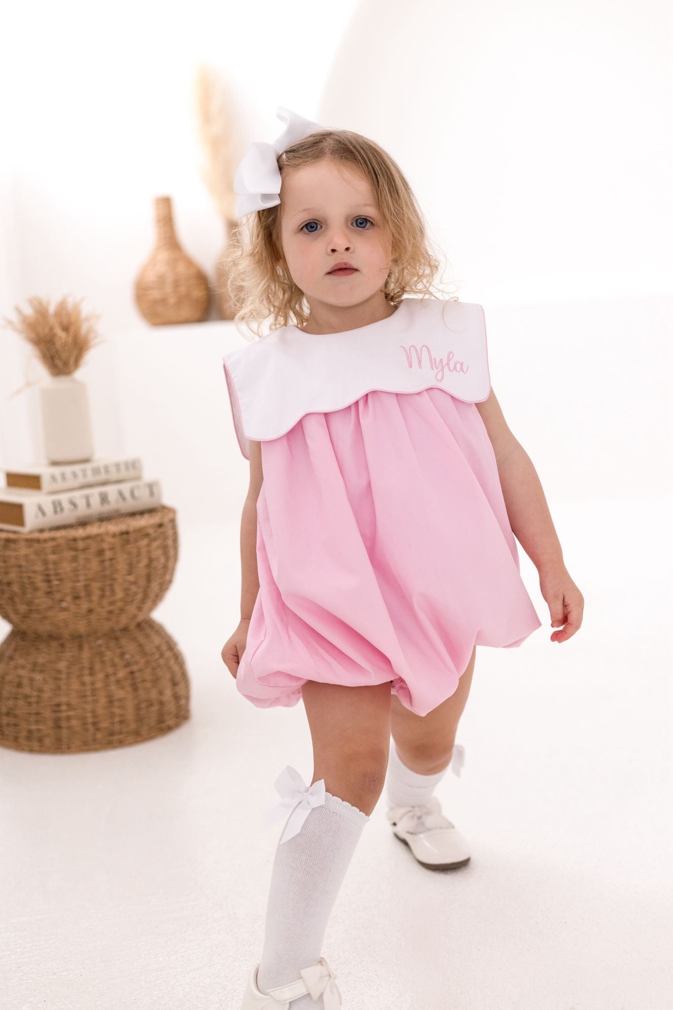 Our Luxury Pink Baby Girl Bubble romper with Personalised Bib Collar is a timeless and elegant piece designed for little girls. Crafted from premium woven cotton, this beautiful dress features a classic bubble silhouette and an oversized white bib collar, delicately personalised to create a truly bespoke finish.