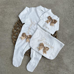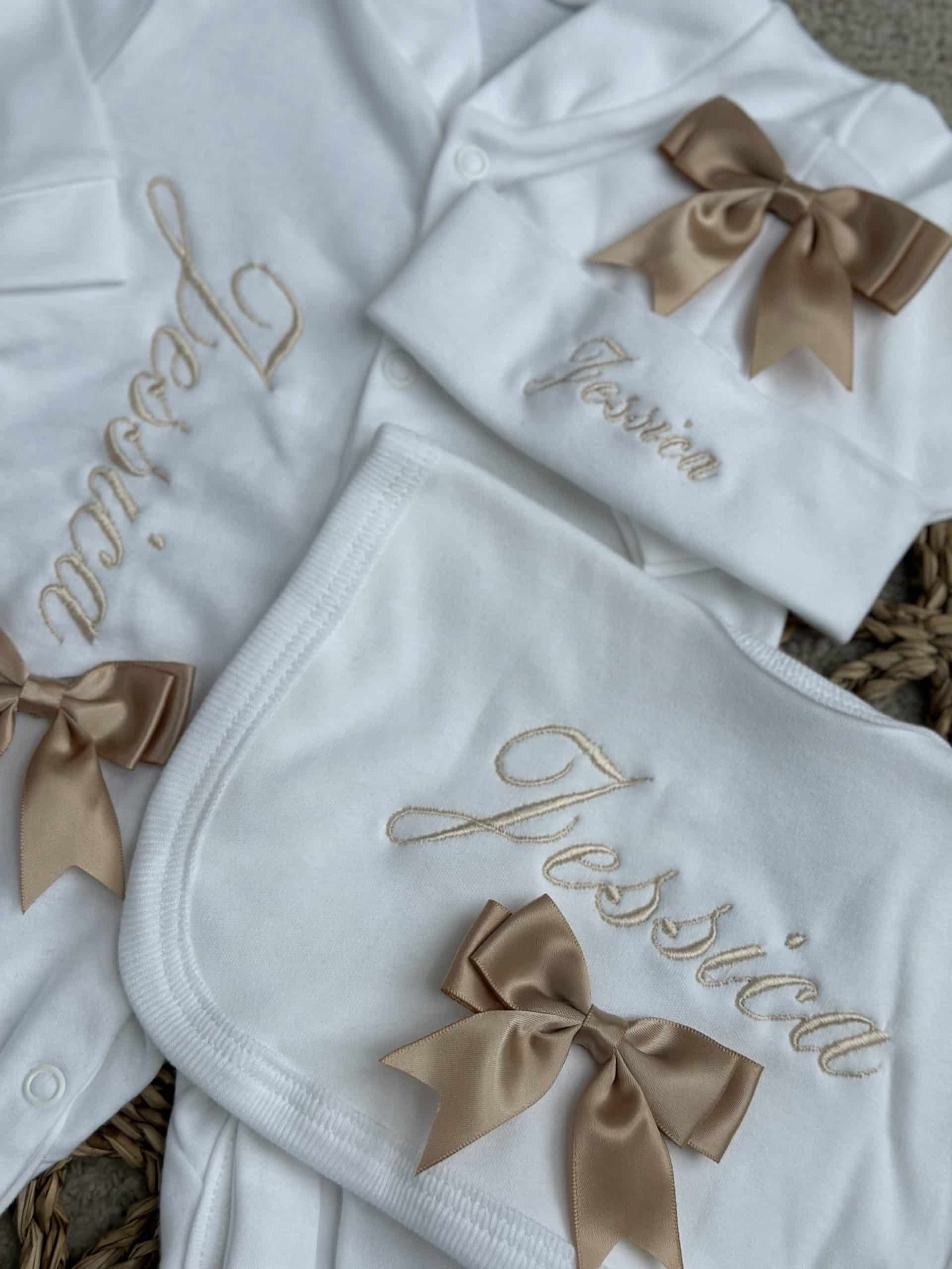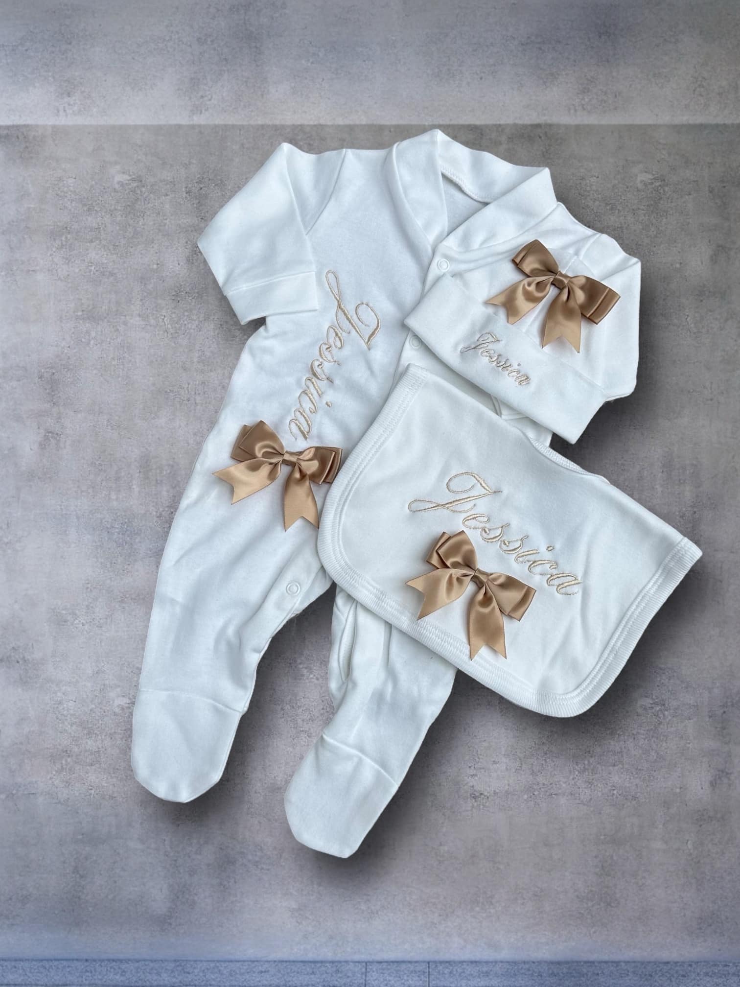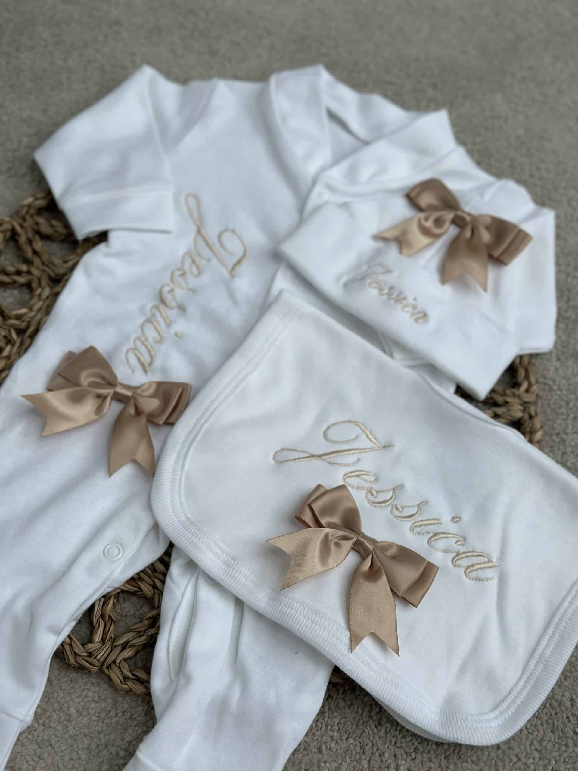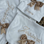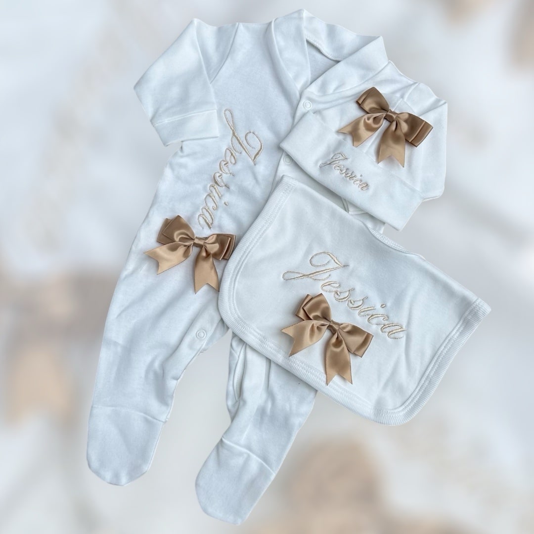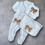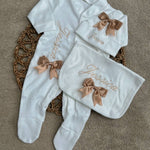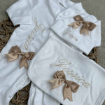 Perfect Little Thing Girls Bow Personalised Sleepsuit Set - Beige