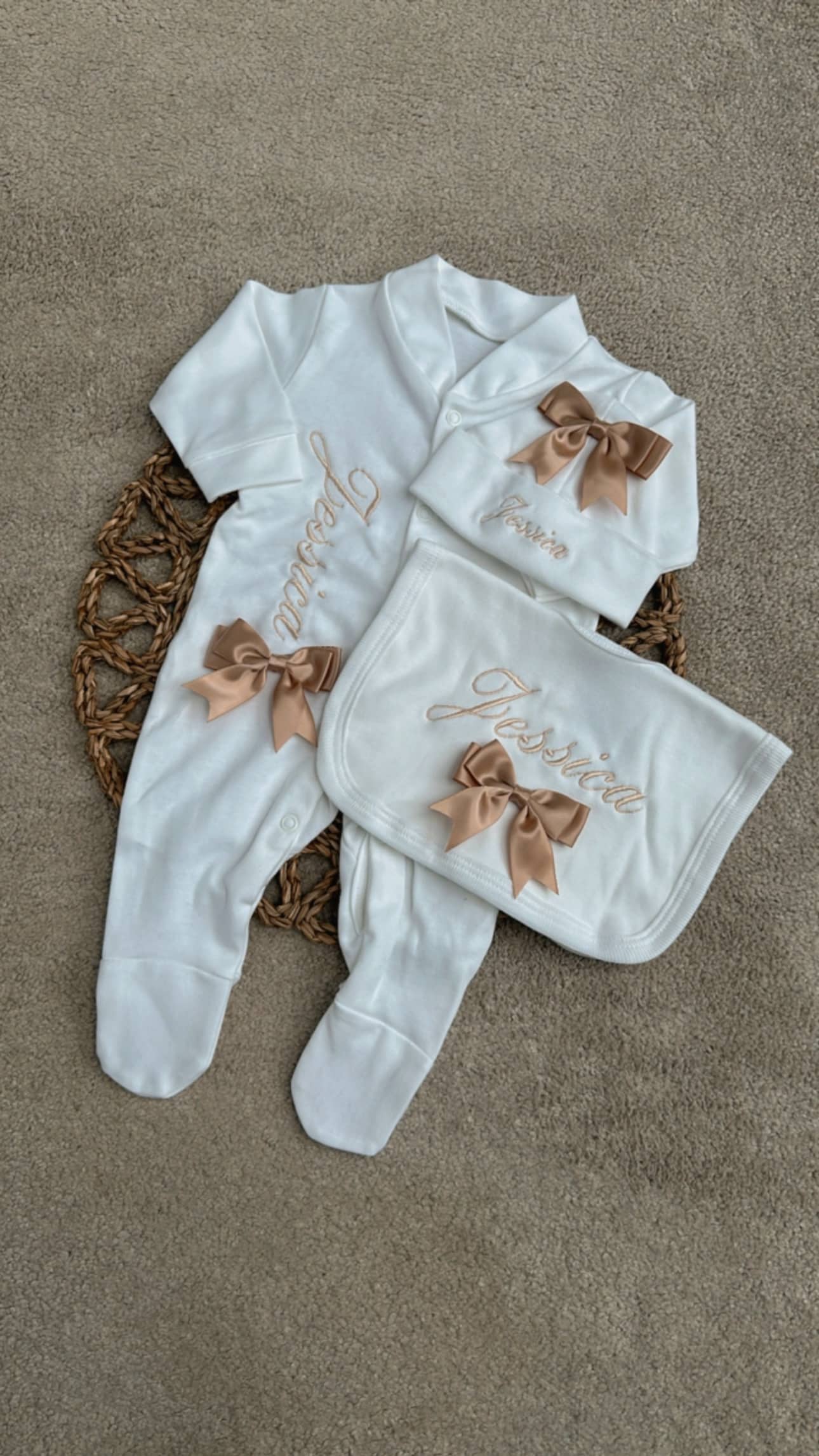 Sleepsuit, hat and bib is 100% cotton with stain bows and embroidery. Available in Pink, Beige, mint green bows also velvet pink,green black and red bows.