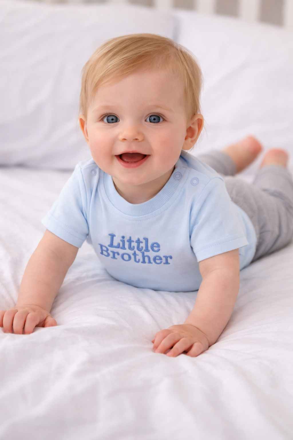 A blue t-shirt embroidered with 'Little Brother'.