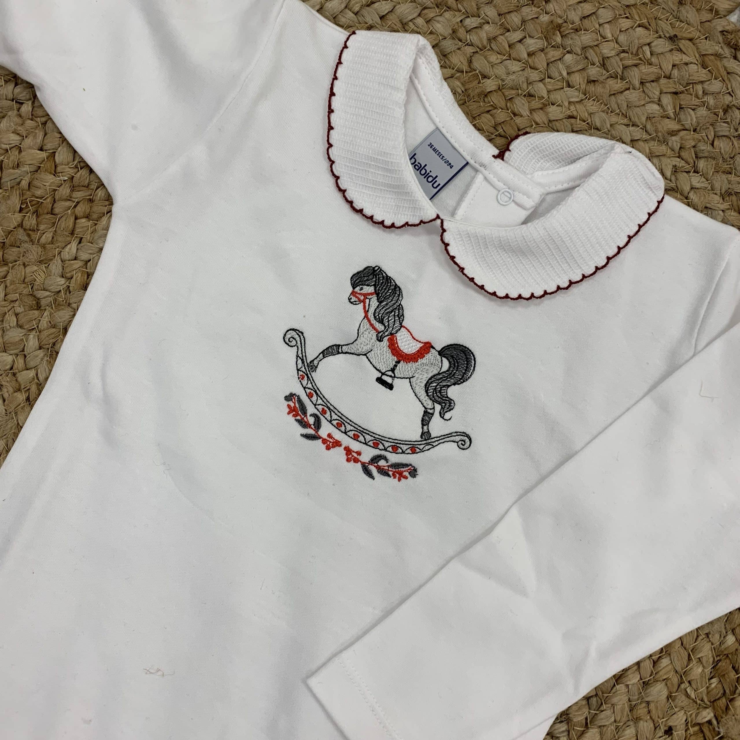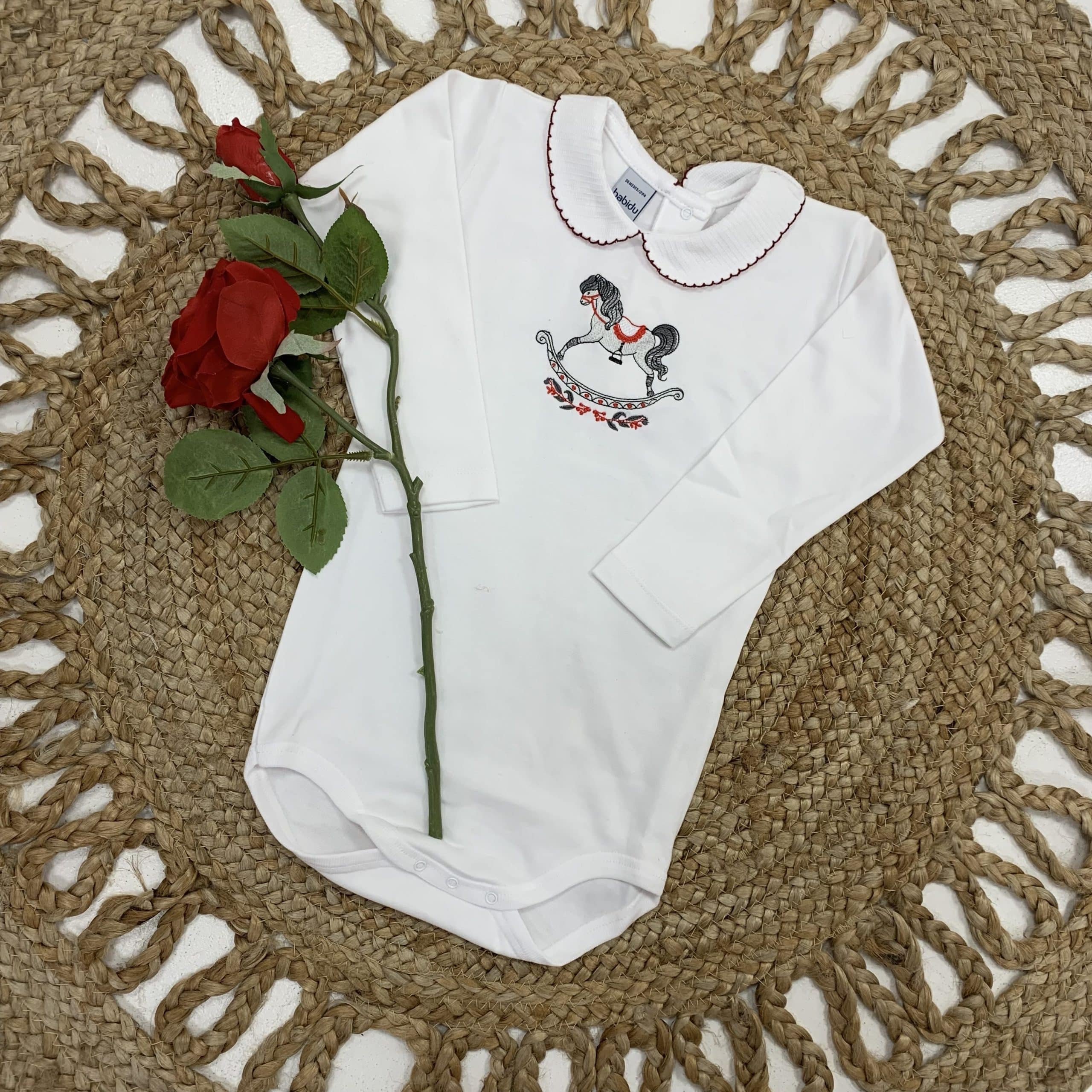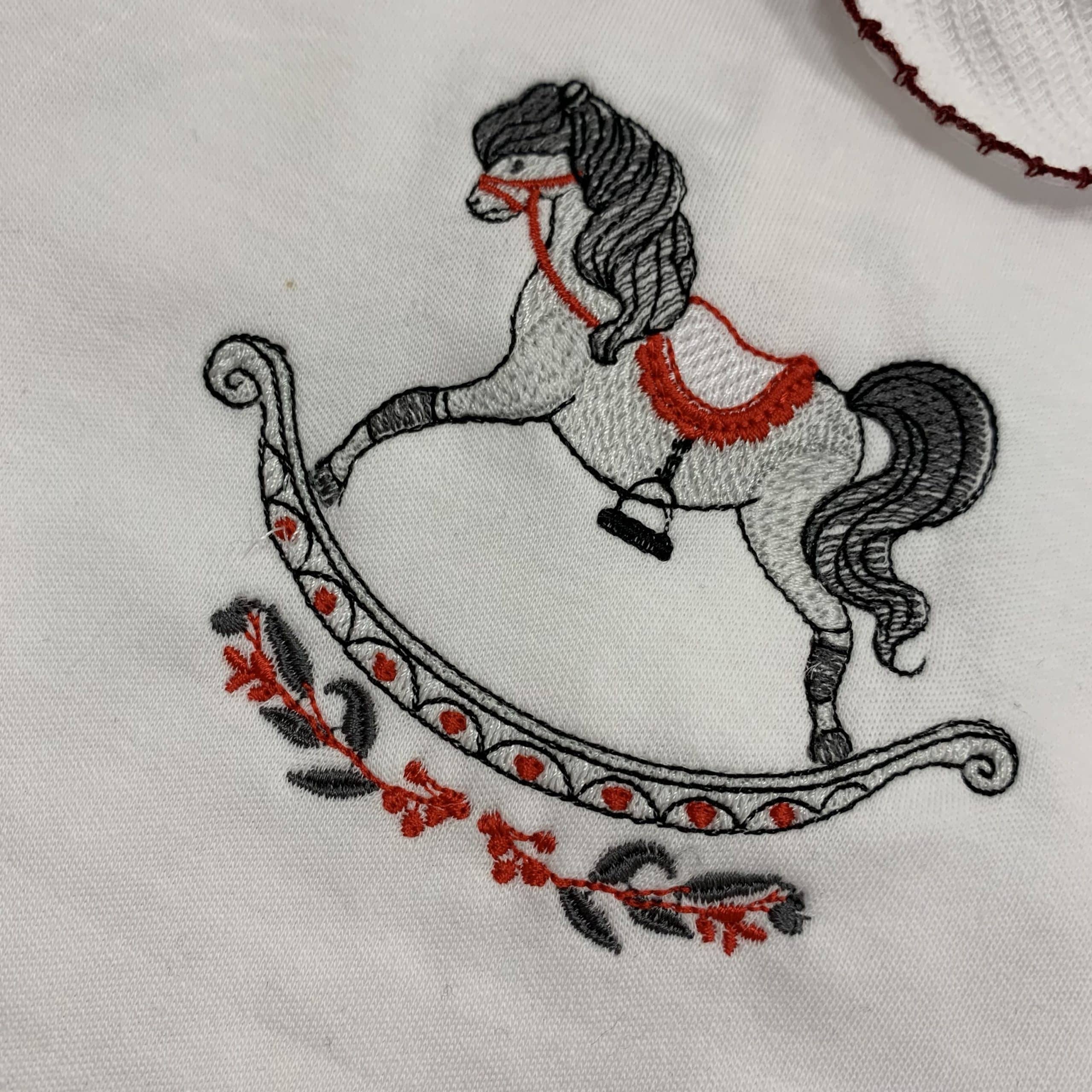 A gorgeous white cotton bodysuit with a red edge collar embroidered with a red, grey and white rocking horse. Perfect for Christmas time!