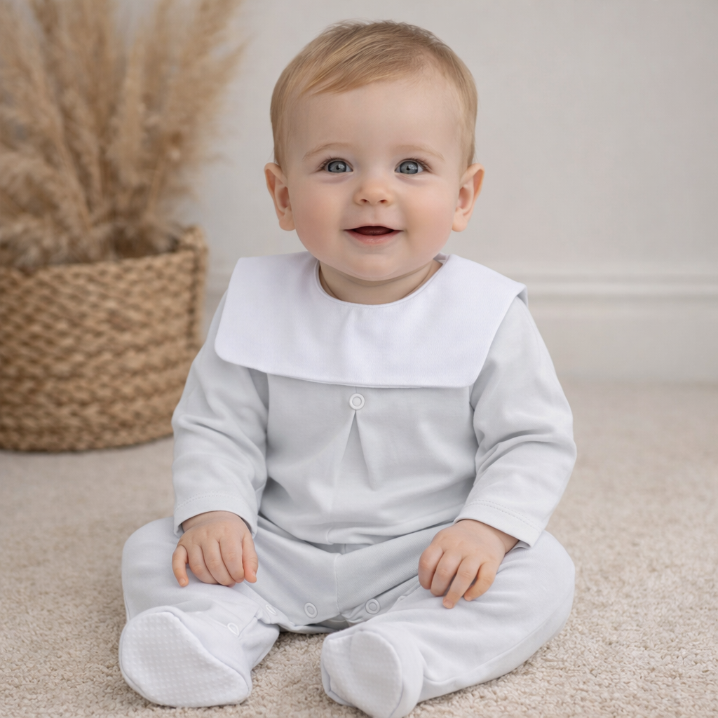 A long sleeve babygrow with a square bib, button detail with inbuilt feet.