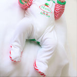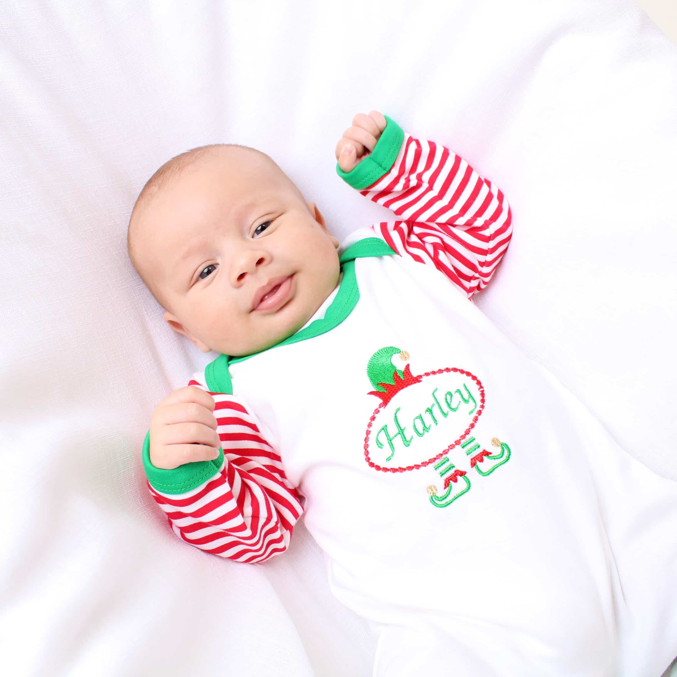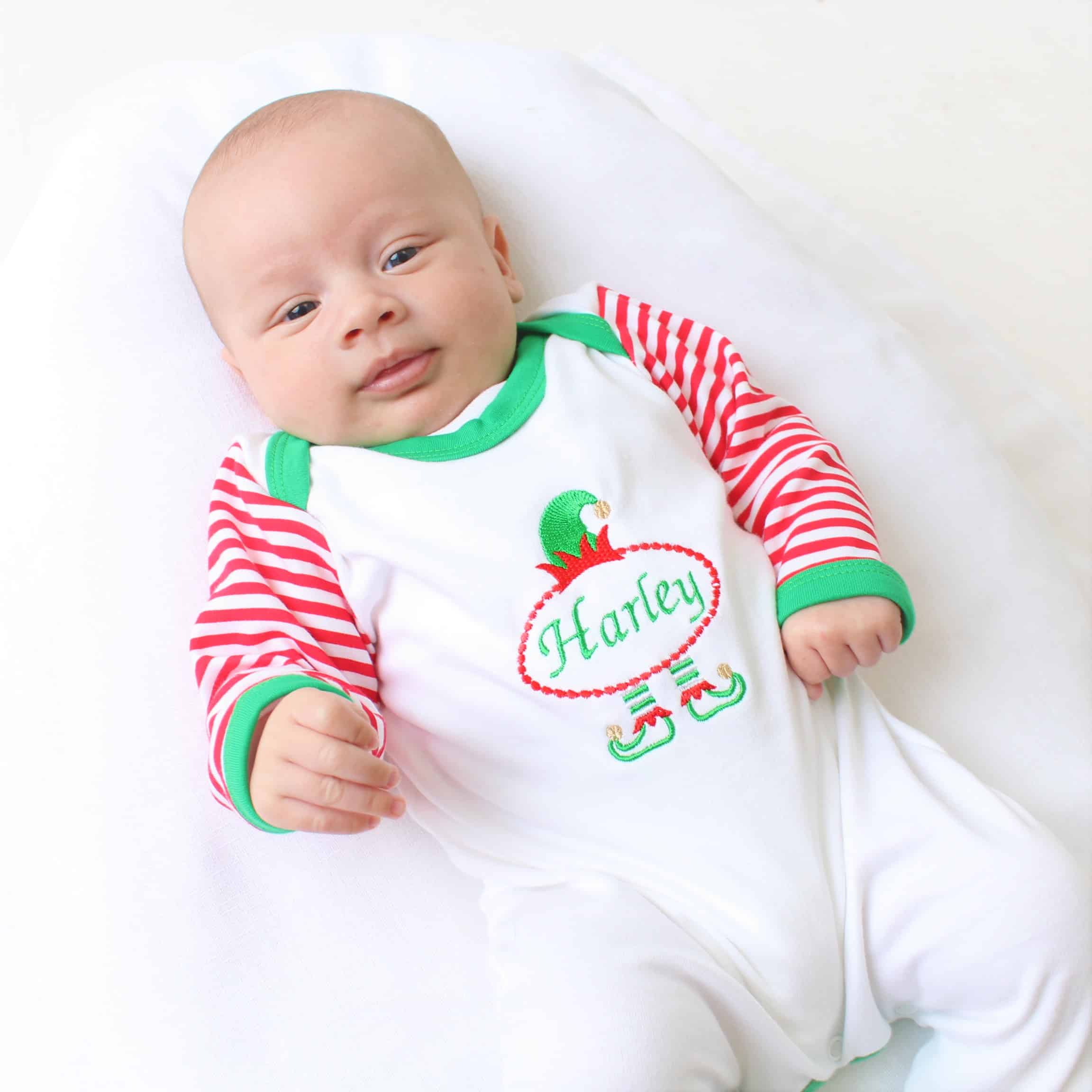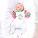 White cotton baby grow with red and white striped sleeves and footed pieces.