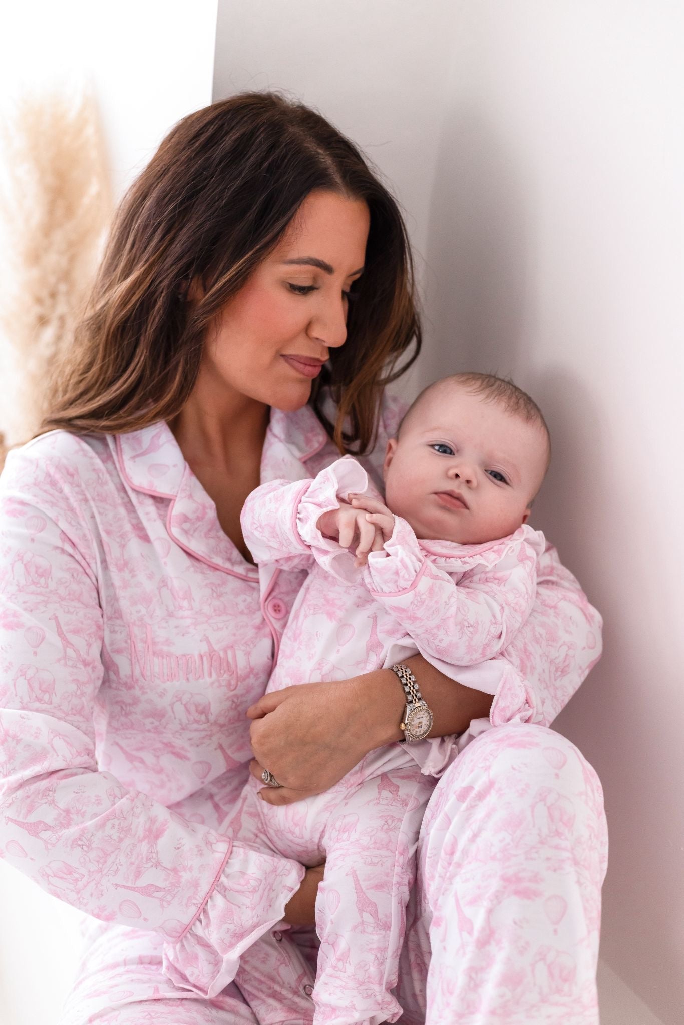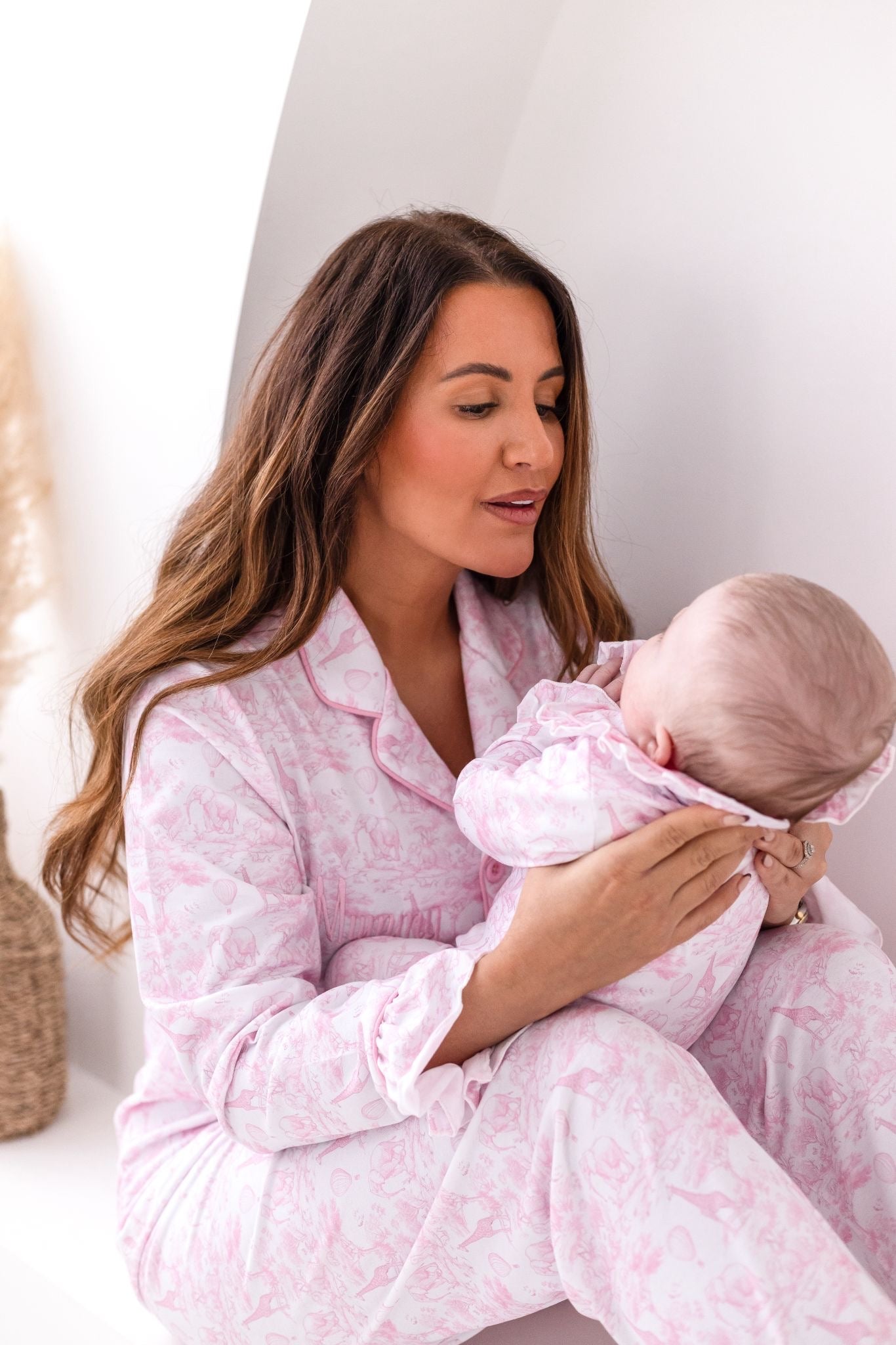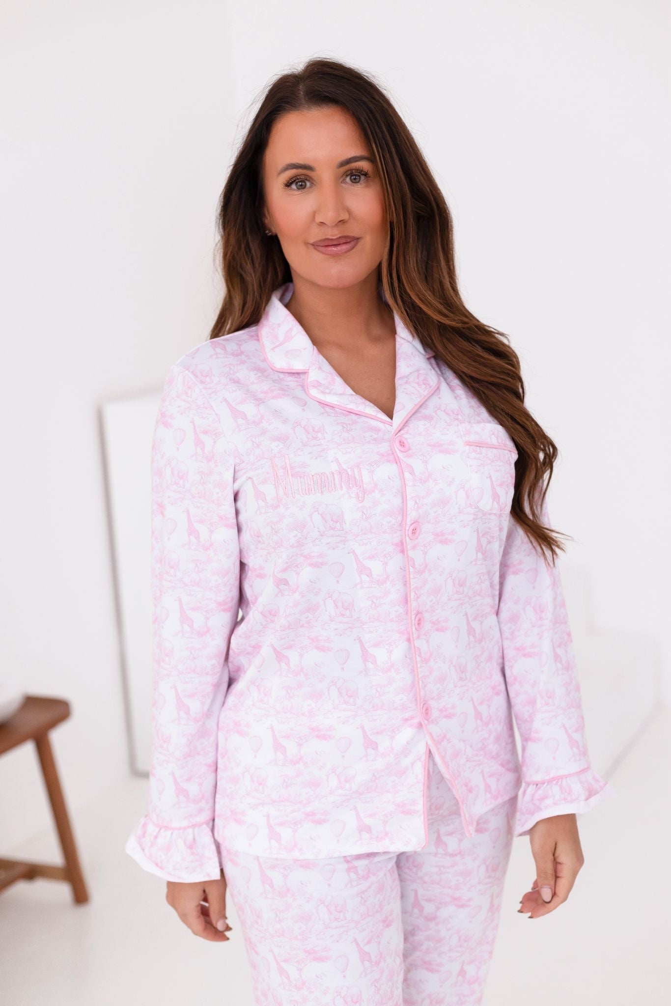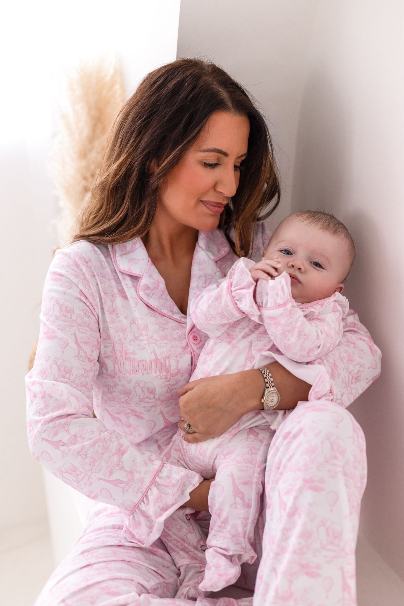 Women’s safari pink print pyjamas, ladies safari toile pyjama set, matching family pyjamas, mummy and me pyjamas, luxury ladies nightwear, button front women’s pjs, matching sibling pyjamas, pink toile pyjamas, women’s loungewear set, family matching nightwear, luxury pyjamas set for women