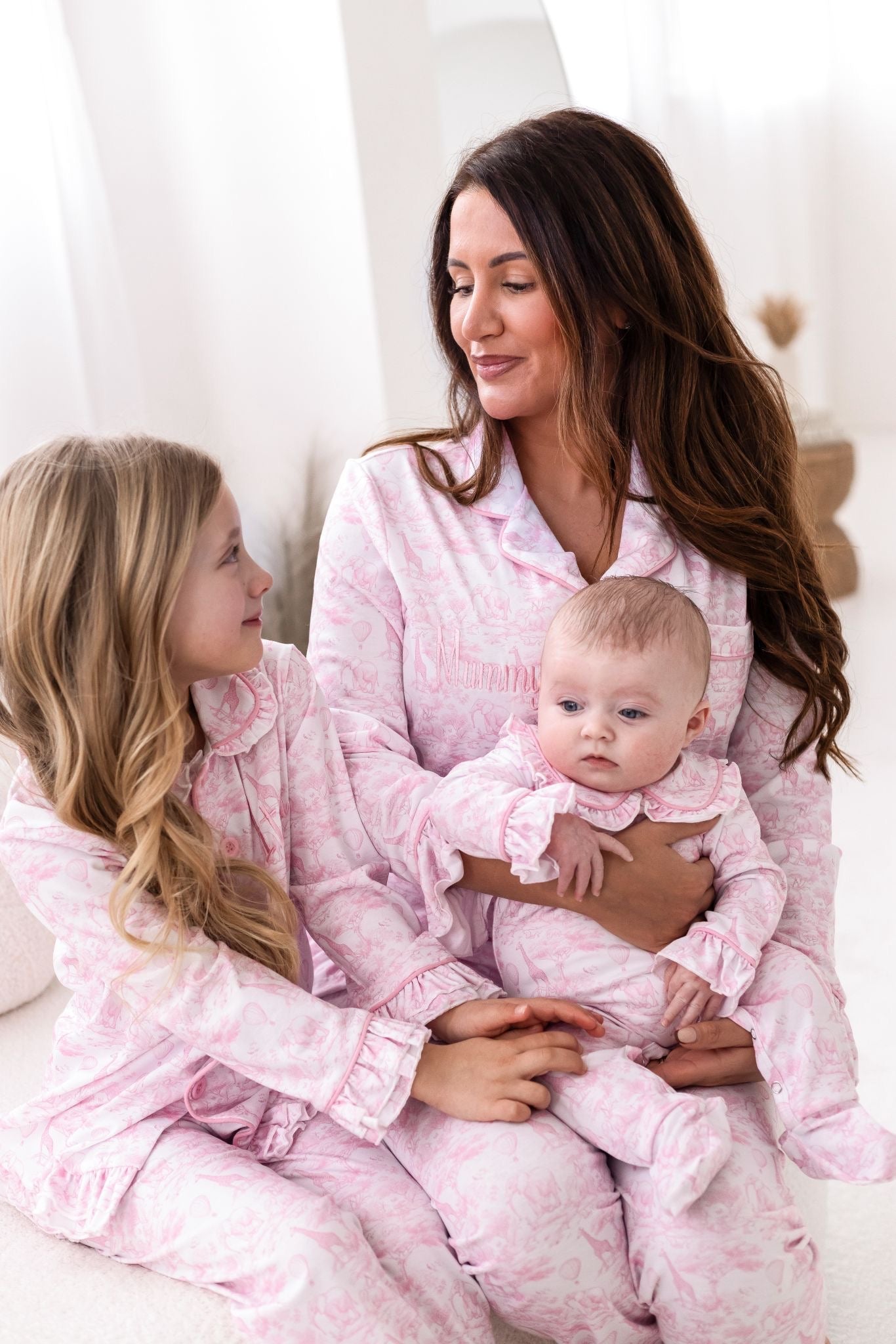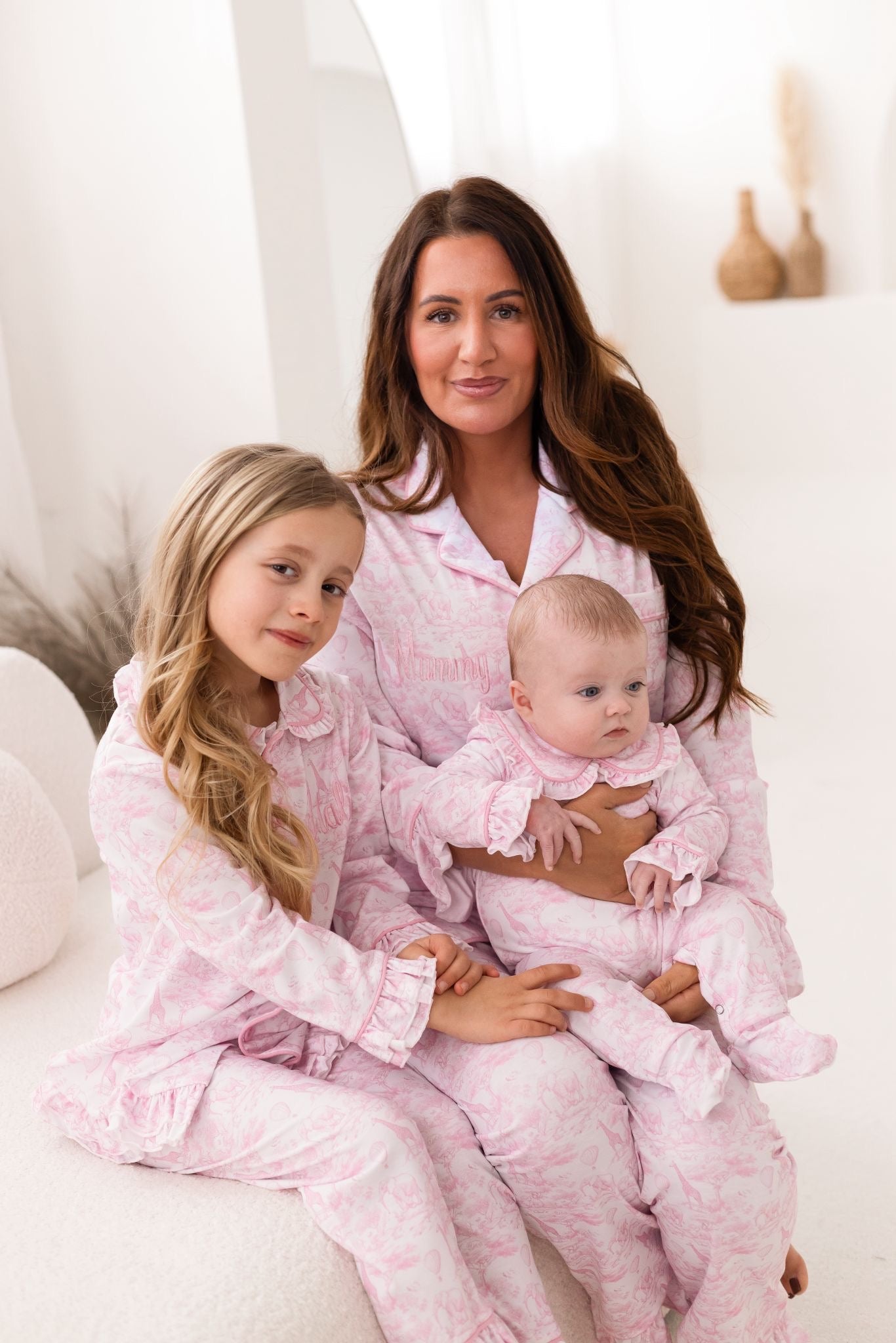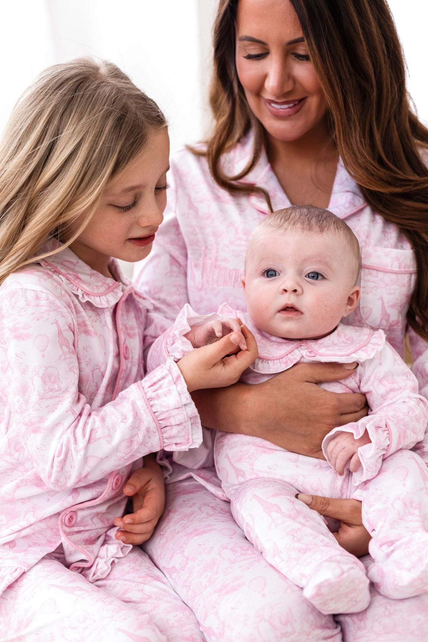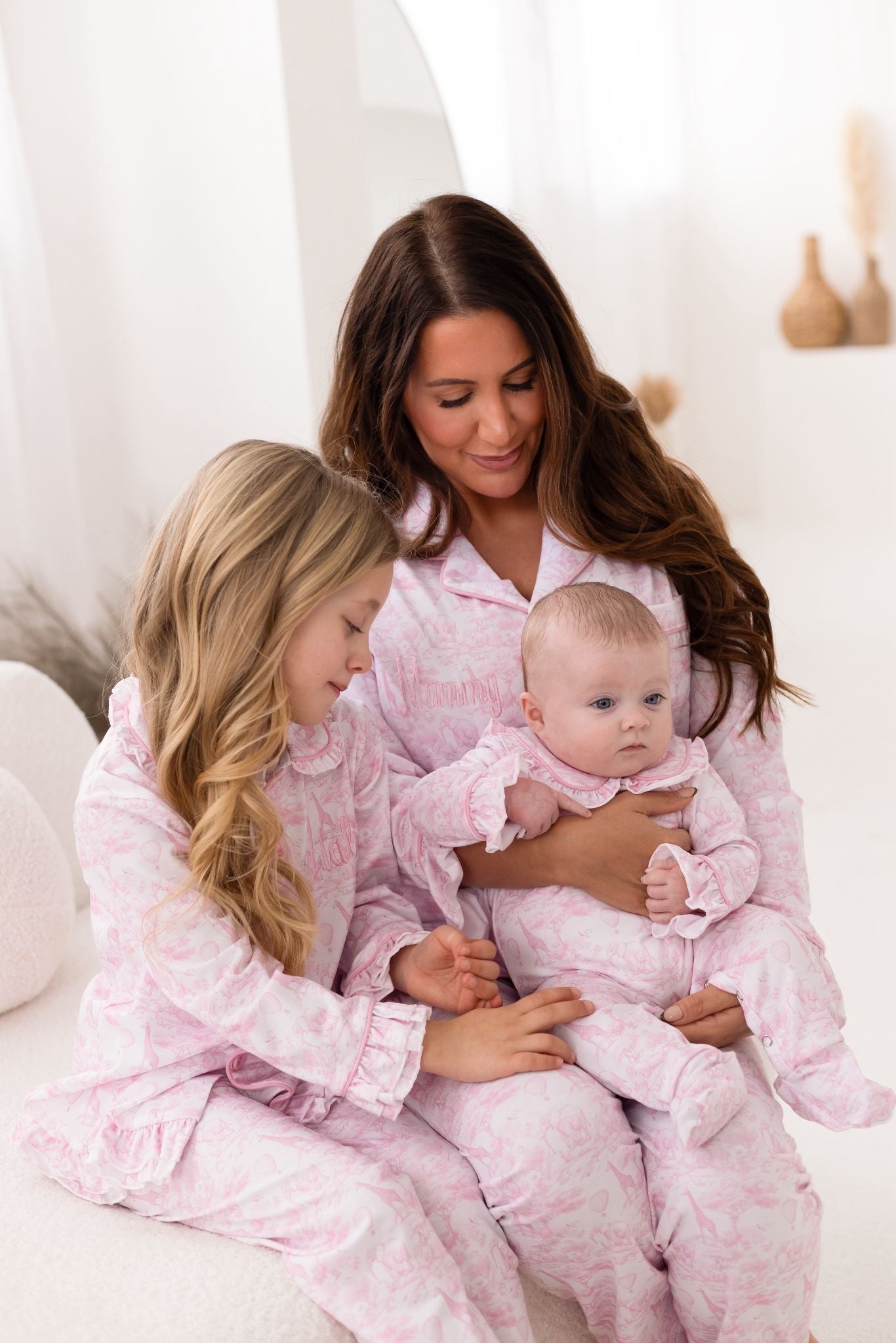 Women’s safari pink print pyjamas, ladies safari toile pyjama set, matching family pyjamas, mummy and me pyjamas, luxury ladies nightwear, button front women’s pjs, matching sibling pyjamas, pink toile pyjamas, women’s loungewear set, family matching nightwear, luxury pyjamas set for women