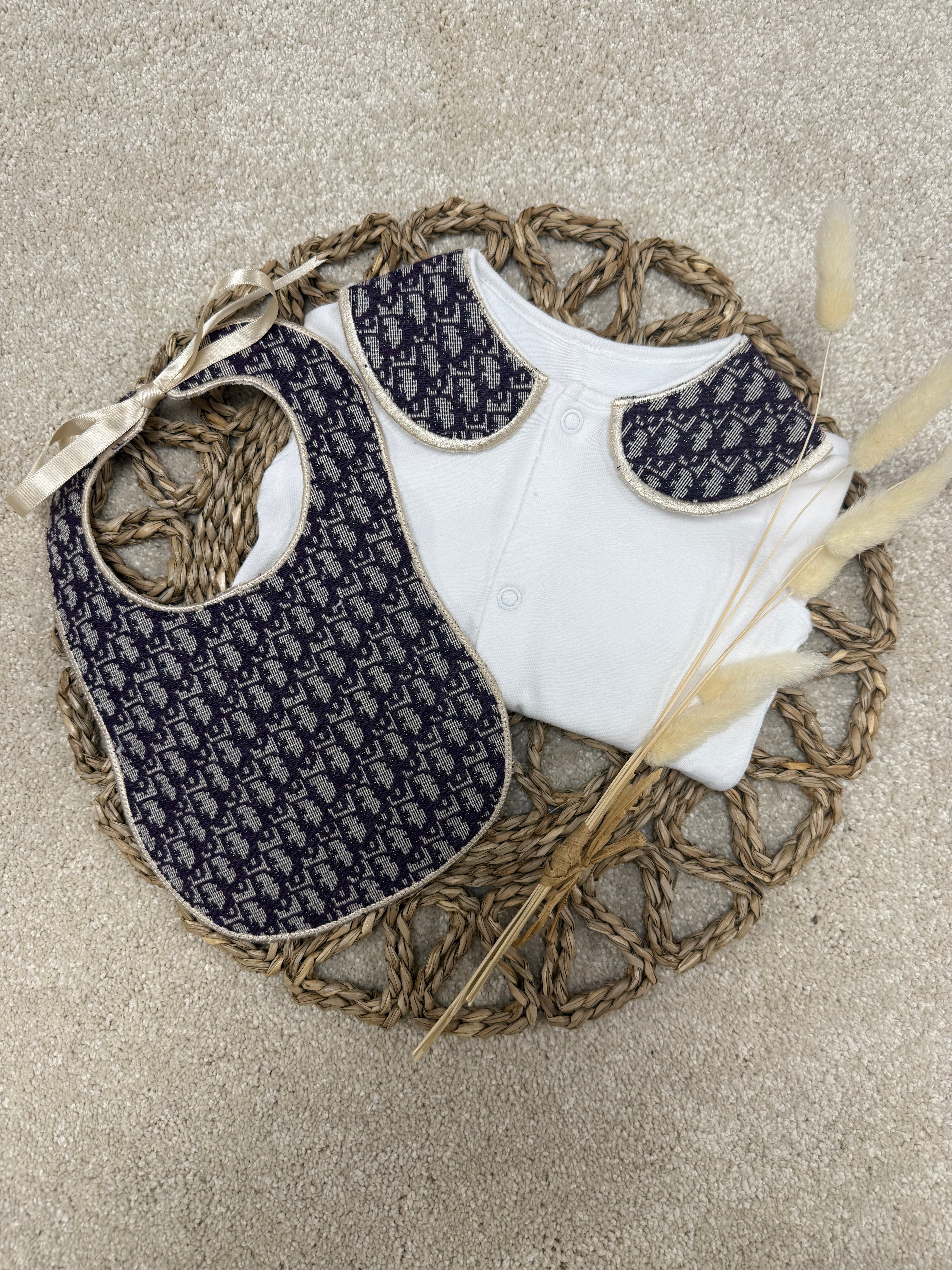 This handmade sleepsuit set is a charming and cozy choice for your little one. Crafted with love and care, the set features a soft, comfortable sleepsuit with a luxurious collar, adding an elegant touch to the overall design. This includes a handmade bib with the inspired design giving it a whimsical, vintage-inspired look that’s both adorable and timeless.