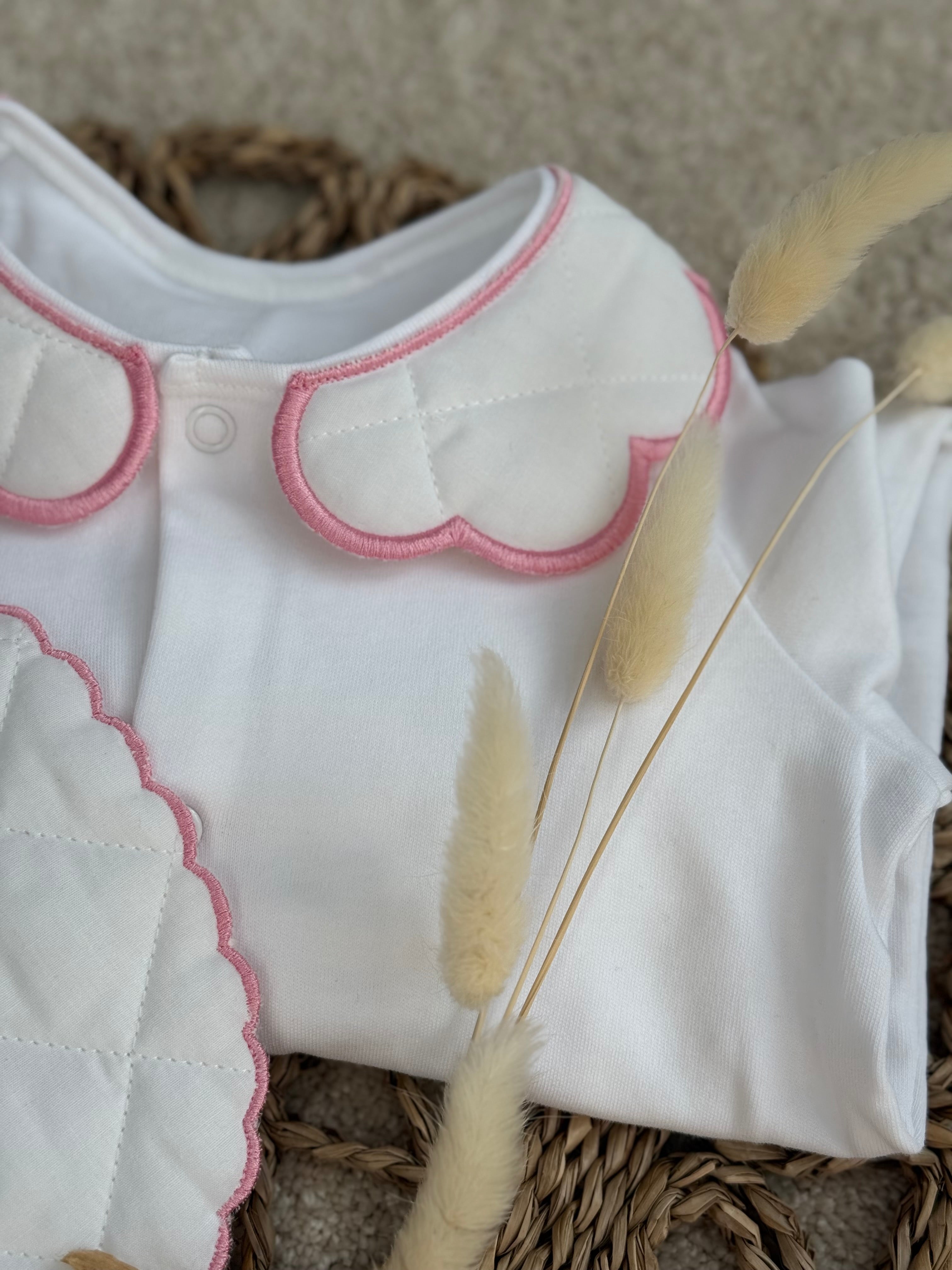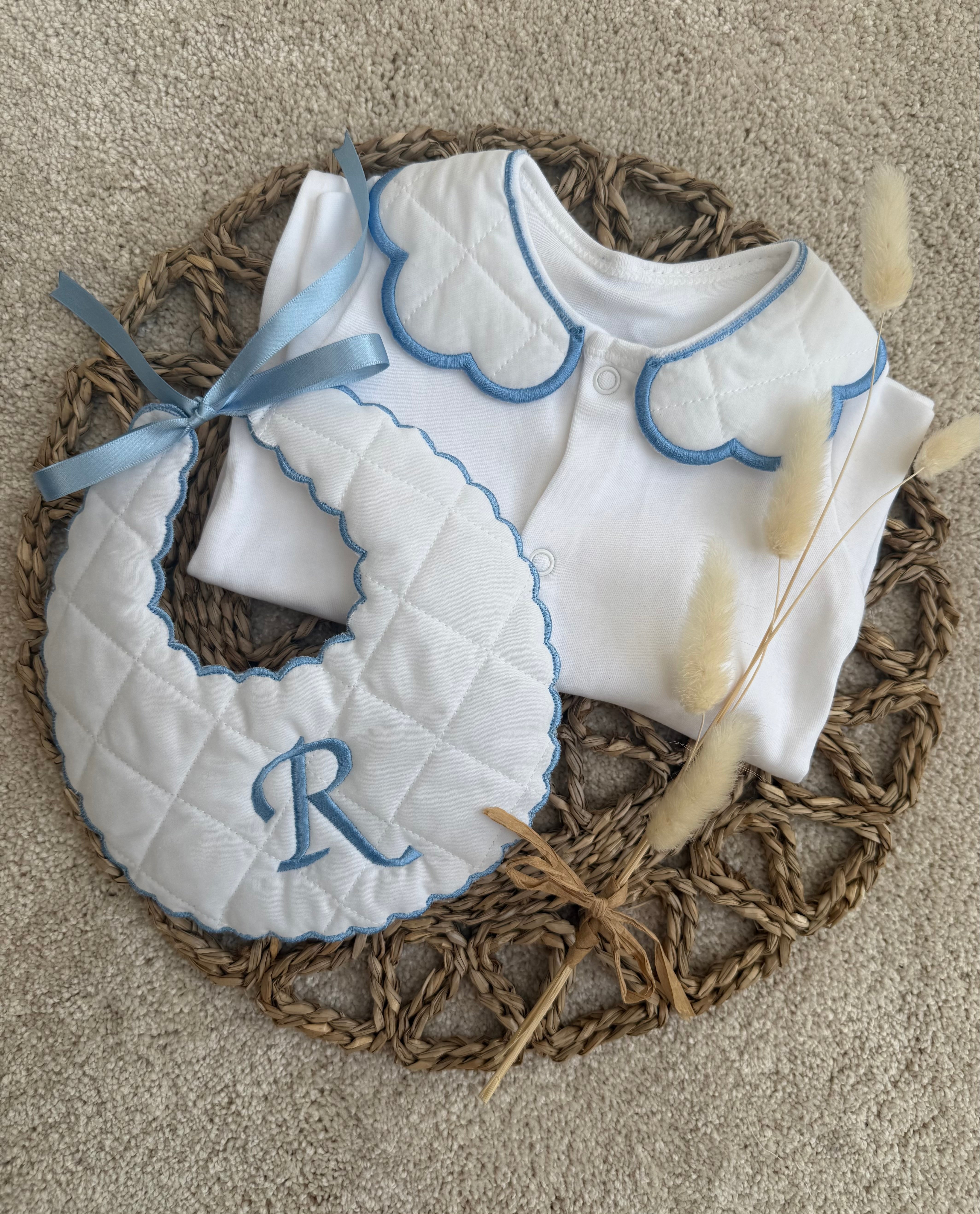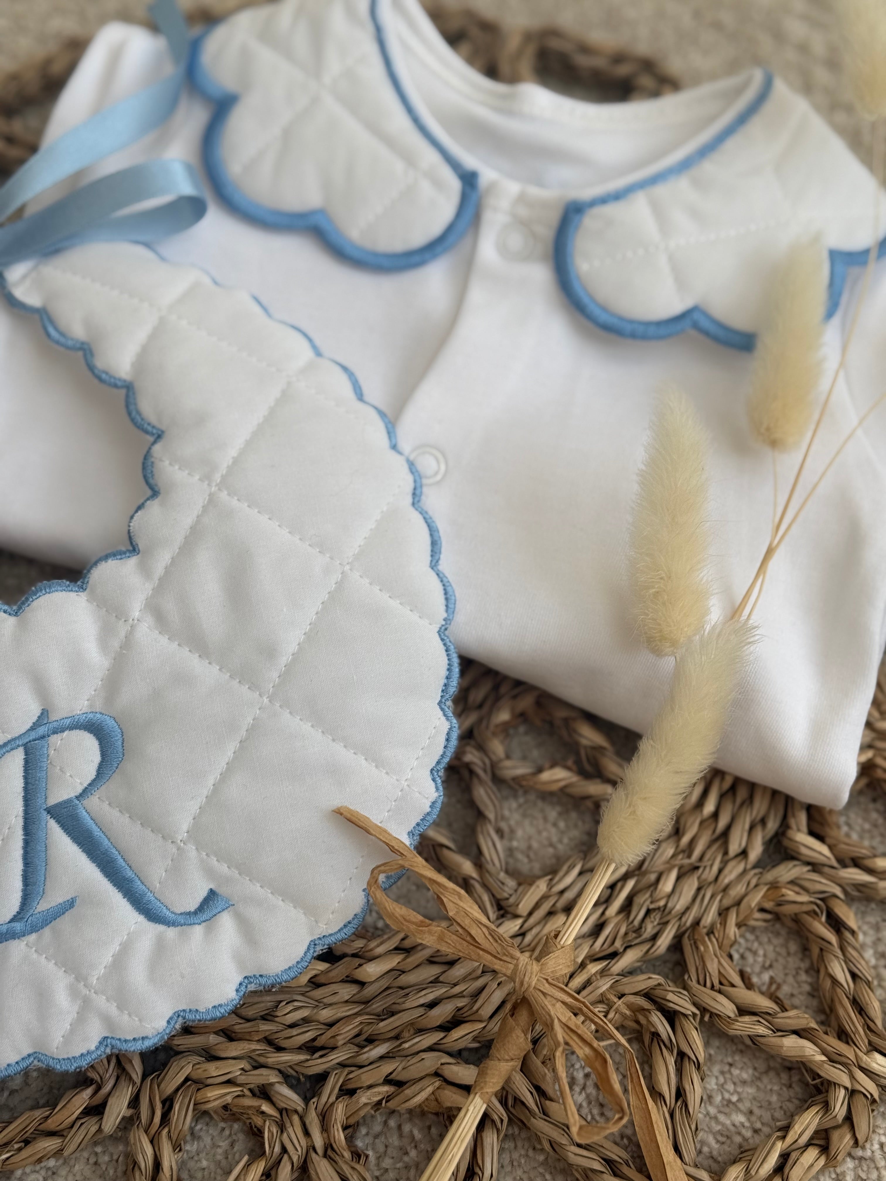 This handmade sleepsuit set is a charming and cozy choice for your little one. Crafted with love and care, the set features a soft, comfortable sleepsuit with a luxurious collar, adding an elegant touch to the overall design. The included handmade bib is quilted. giving it a whimsical, vintage-inspired look that’s both adorable and timeless.