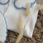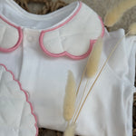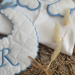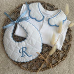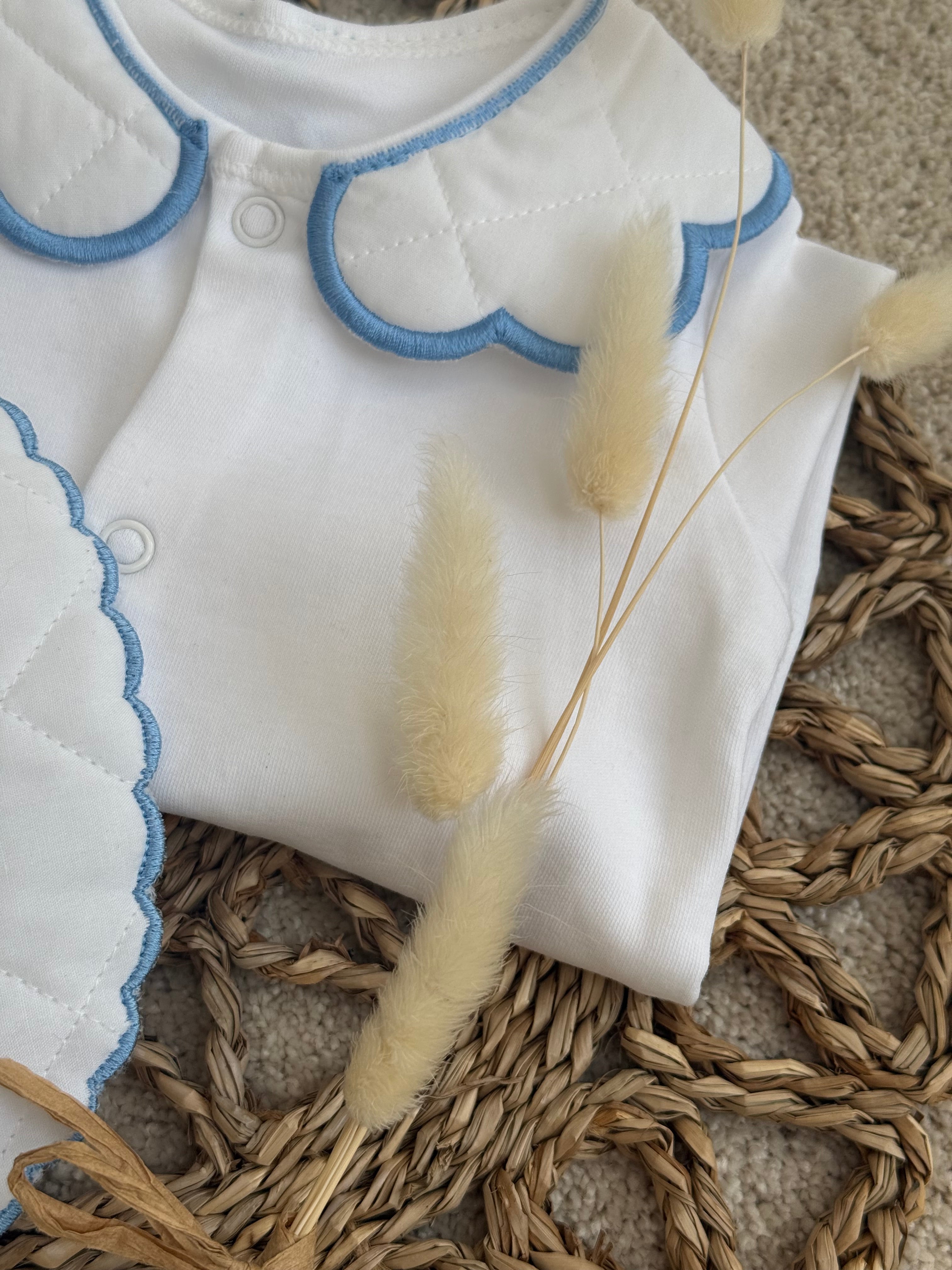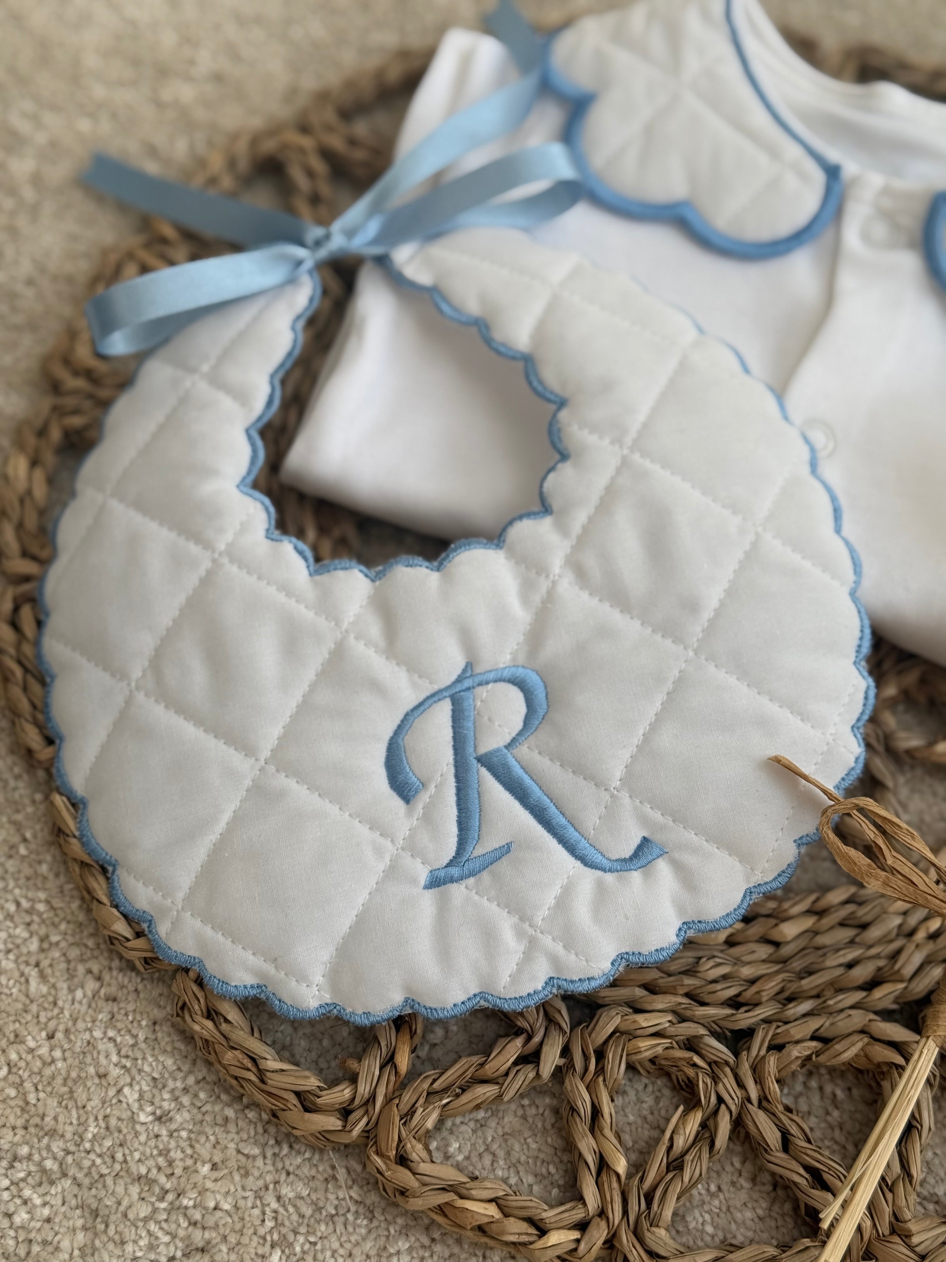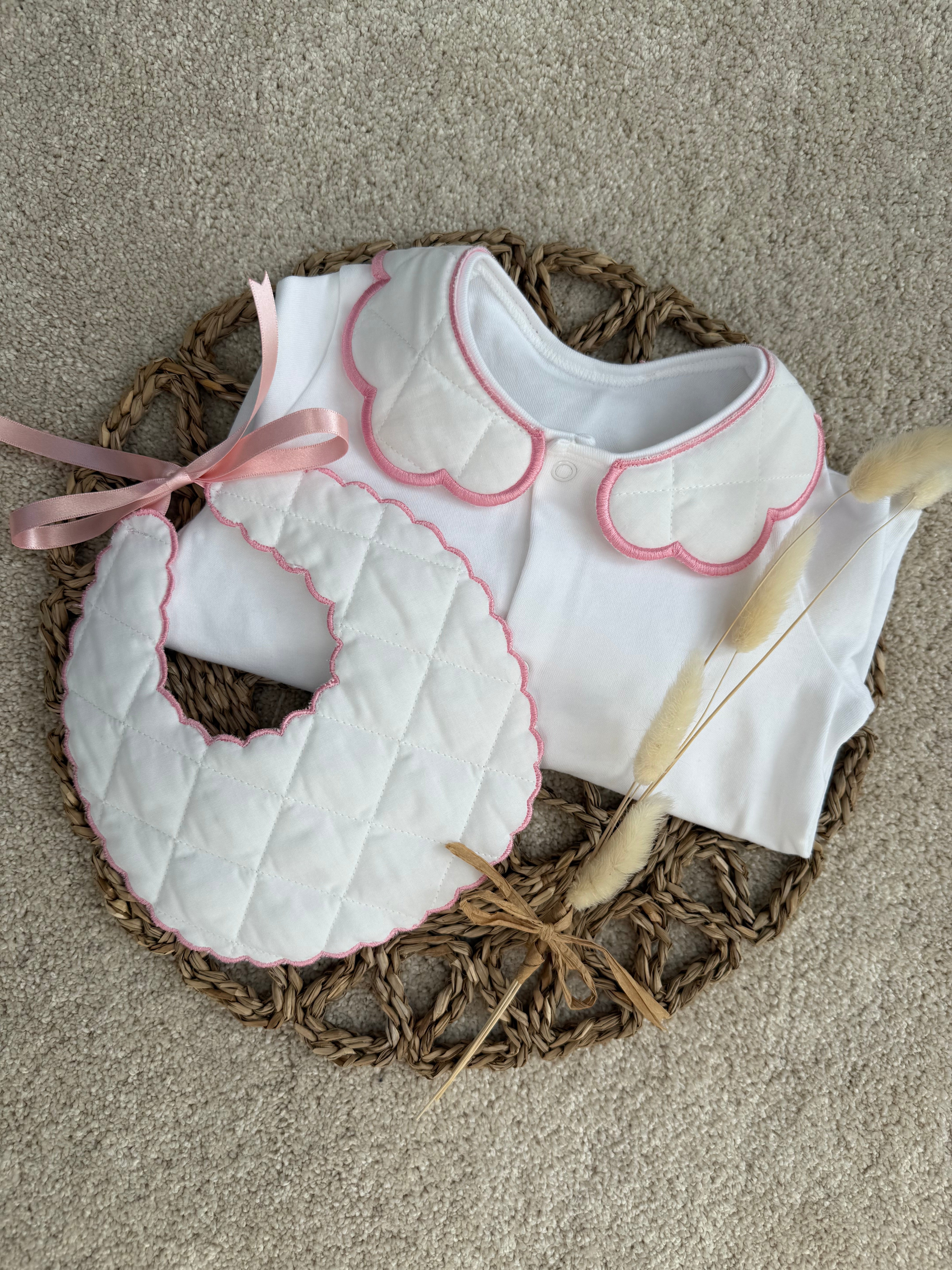 This handmade sleepsuit set is a charming and cozy choice for your little one. Crafted with love and care, the set features a soft, comfortable sleepsuit with a luxurious collar, adding an elegant touch to the overall design. The included handmade bib is quilted. giving it a whimsical, vintage-inspired look that’s both adorable and timeless.