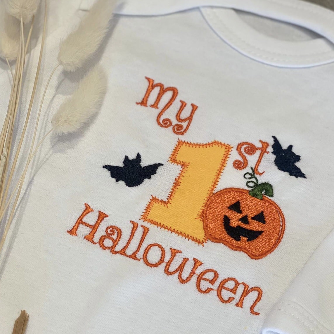 White cotton baby grow embroidered with beautiful orange and black threads.