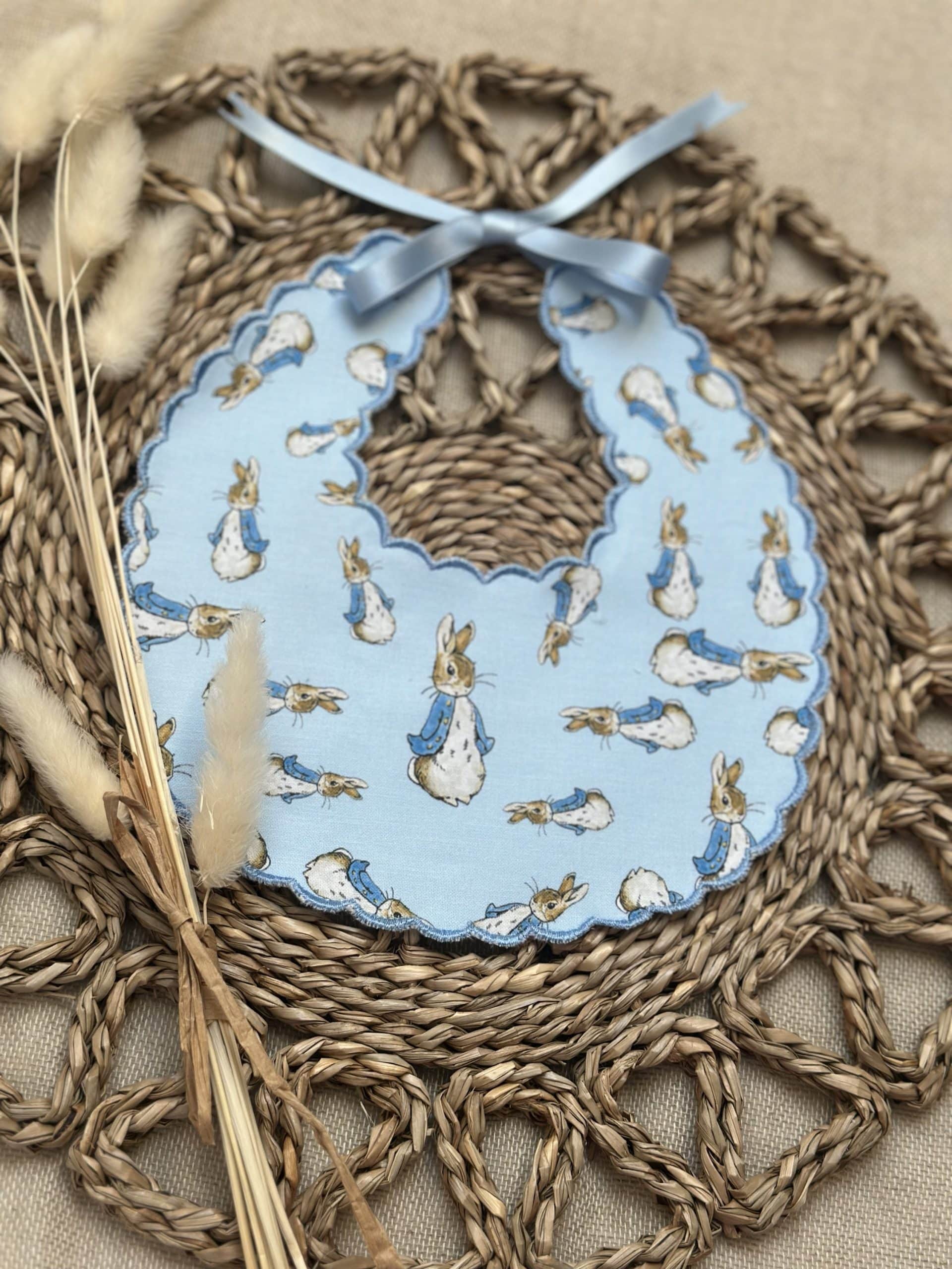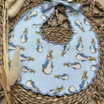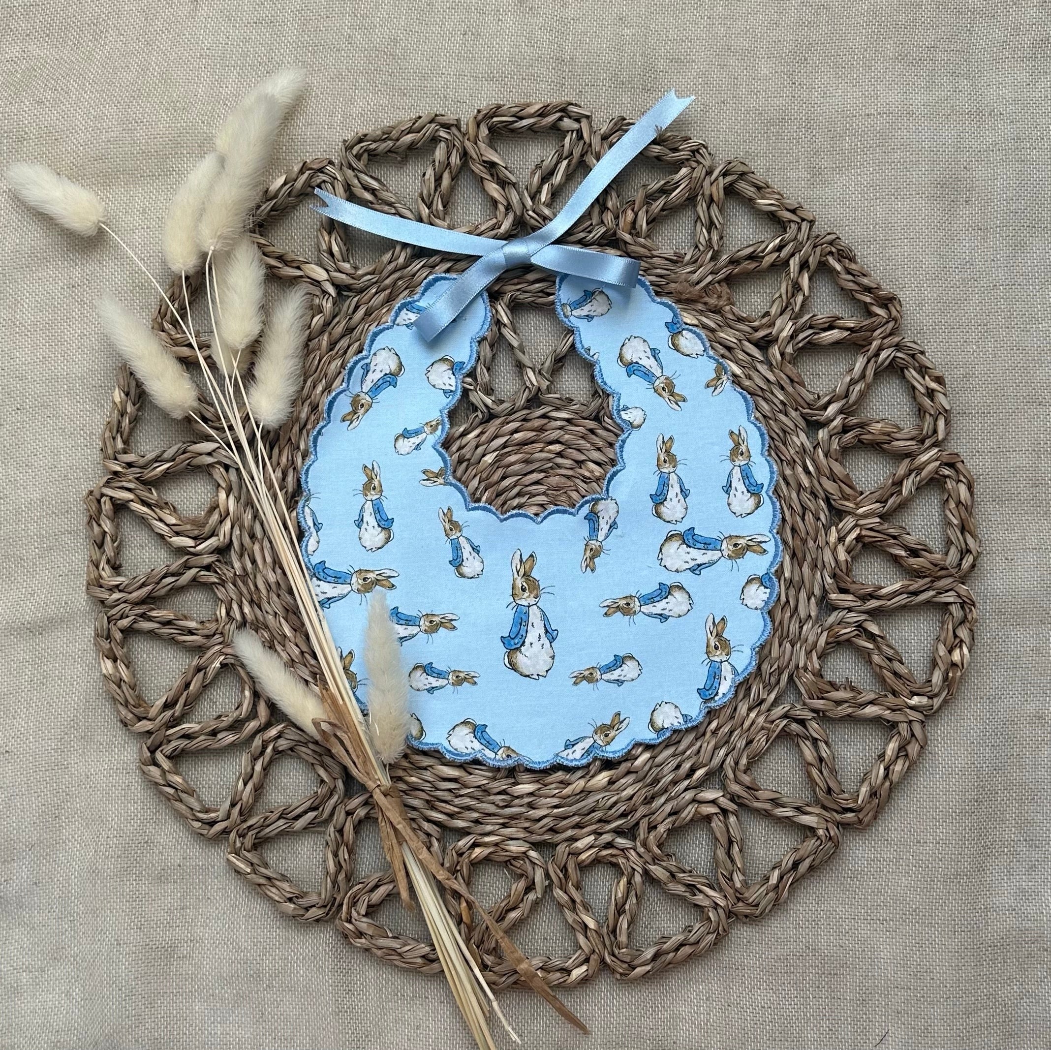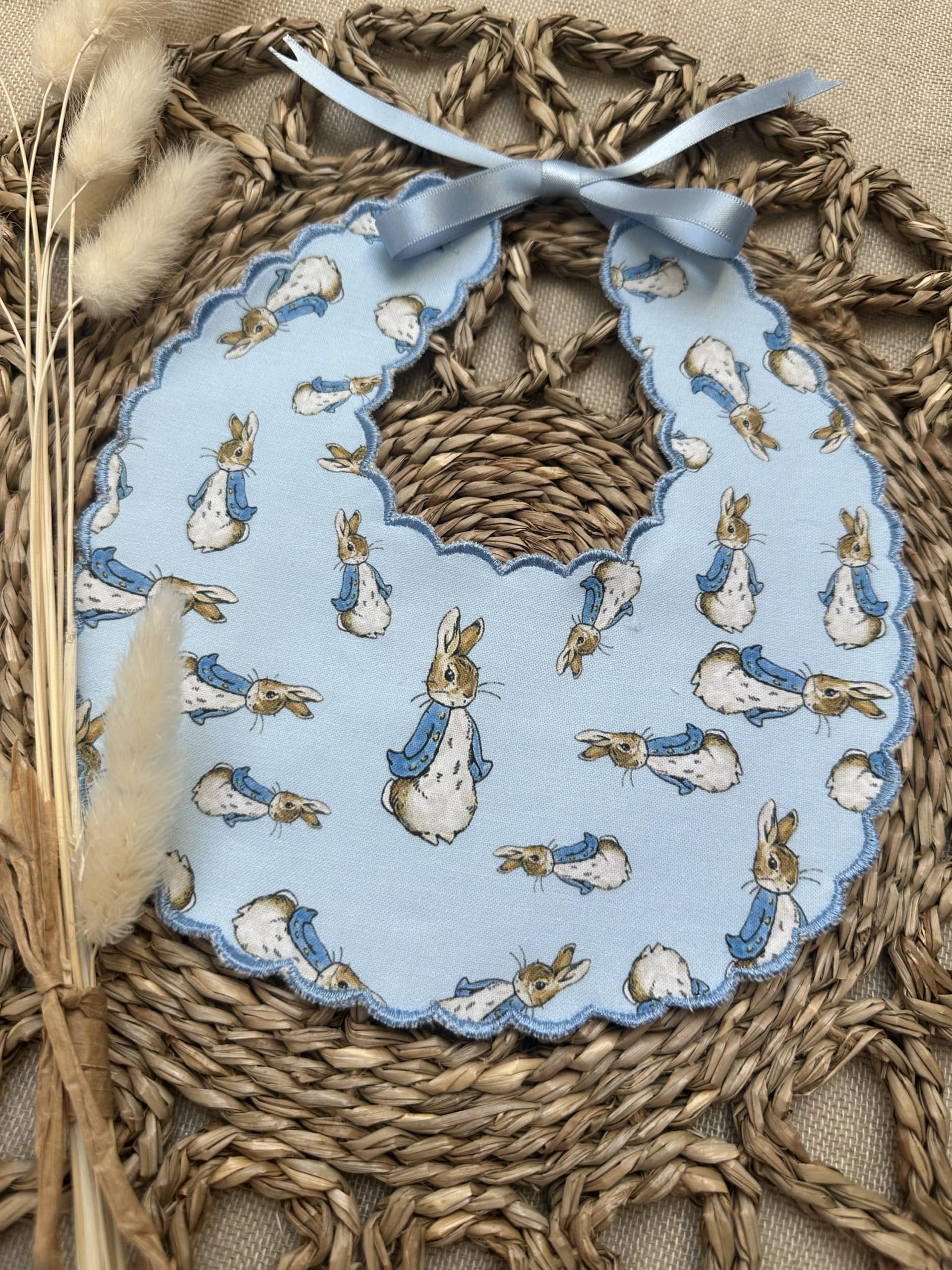 This is a beautiful unique handmade peter rabbit bib, with peter rabbit on the front panel with a beautiful blue stitching around and white velvet backing.