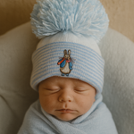 White and blue hat with a big blue pom on the top and Peter Rabbit embroidered on the front.