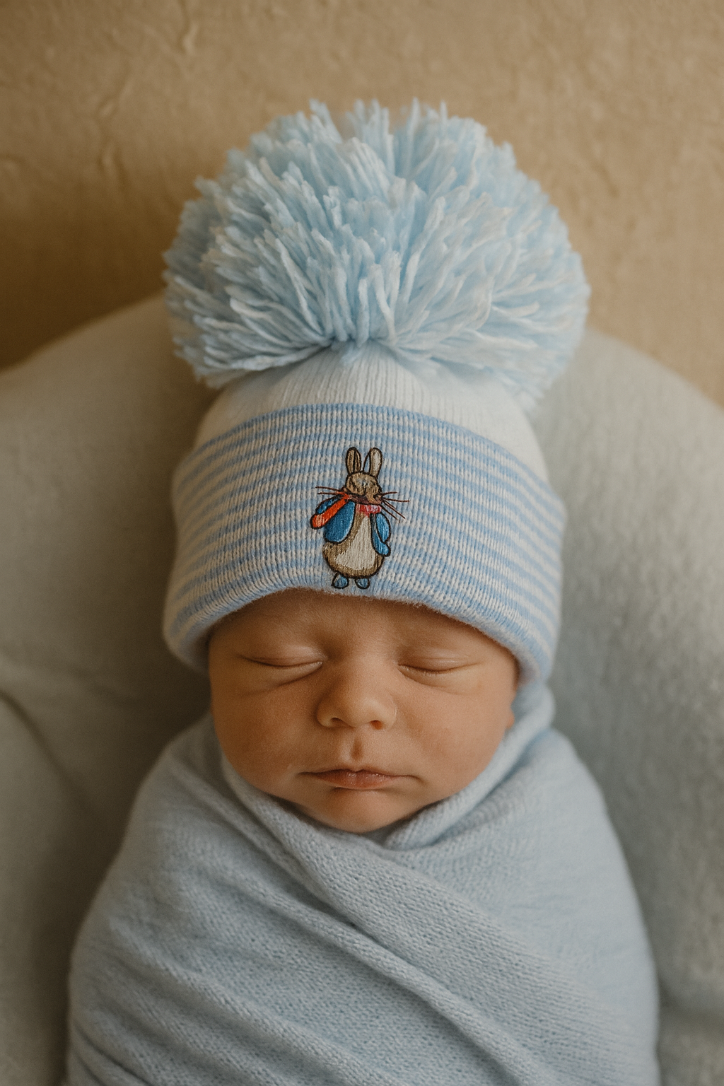 Newborn Peter Rabbit White & Blue Stripe Pom Hat