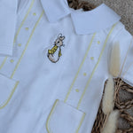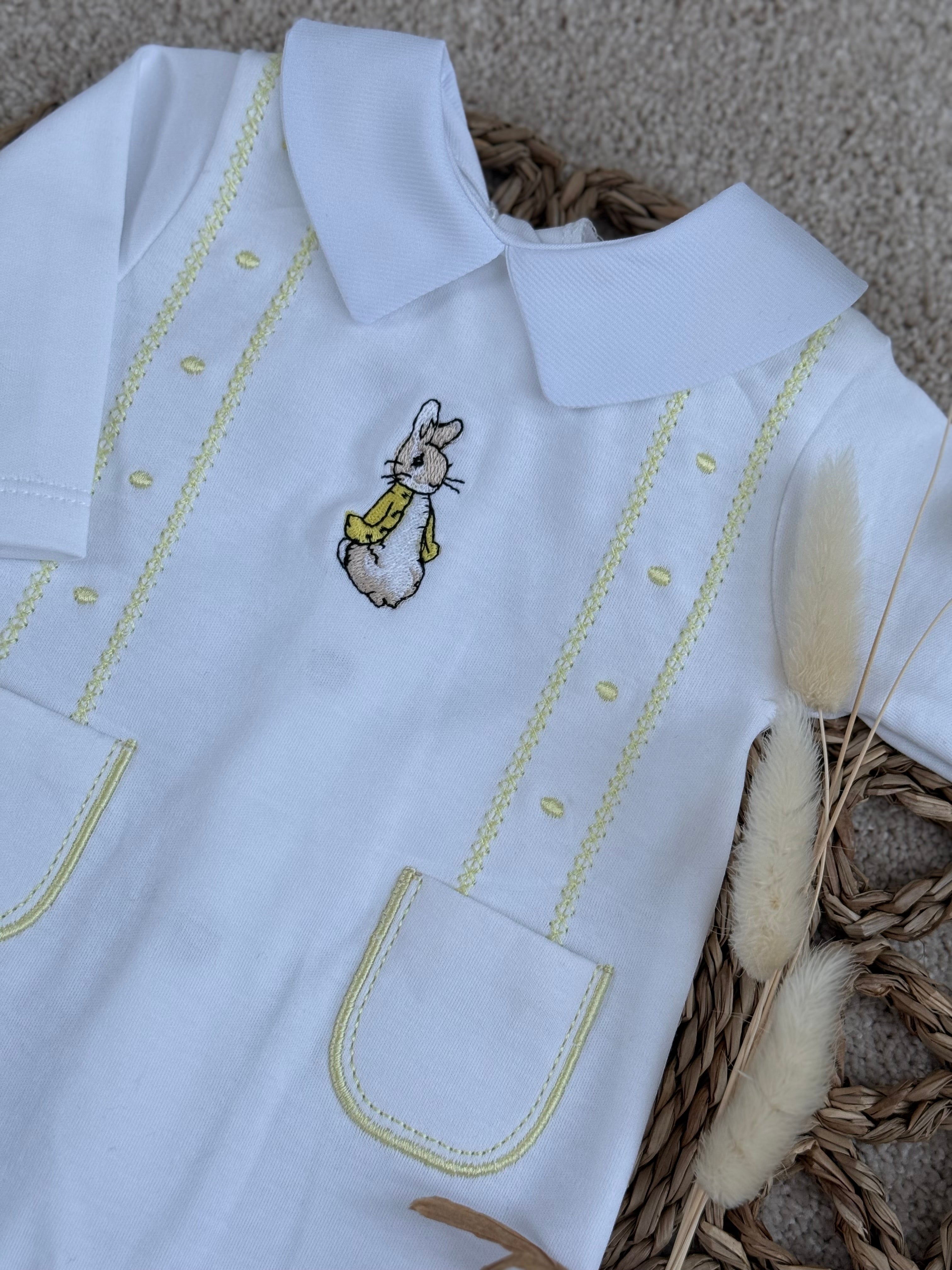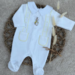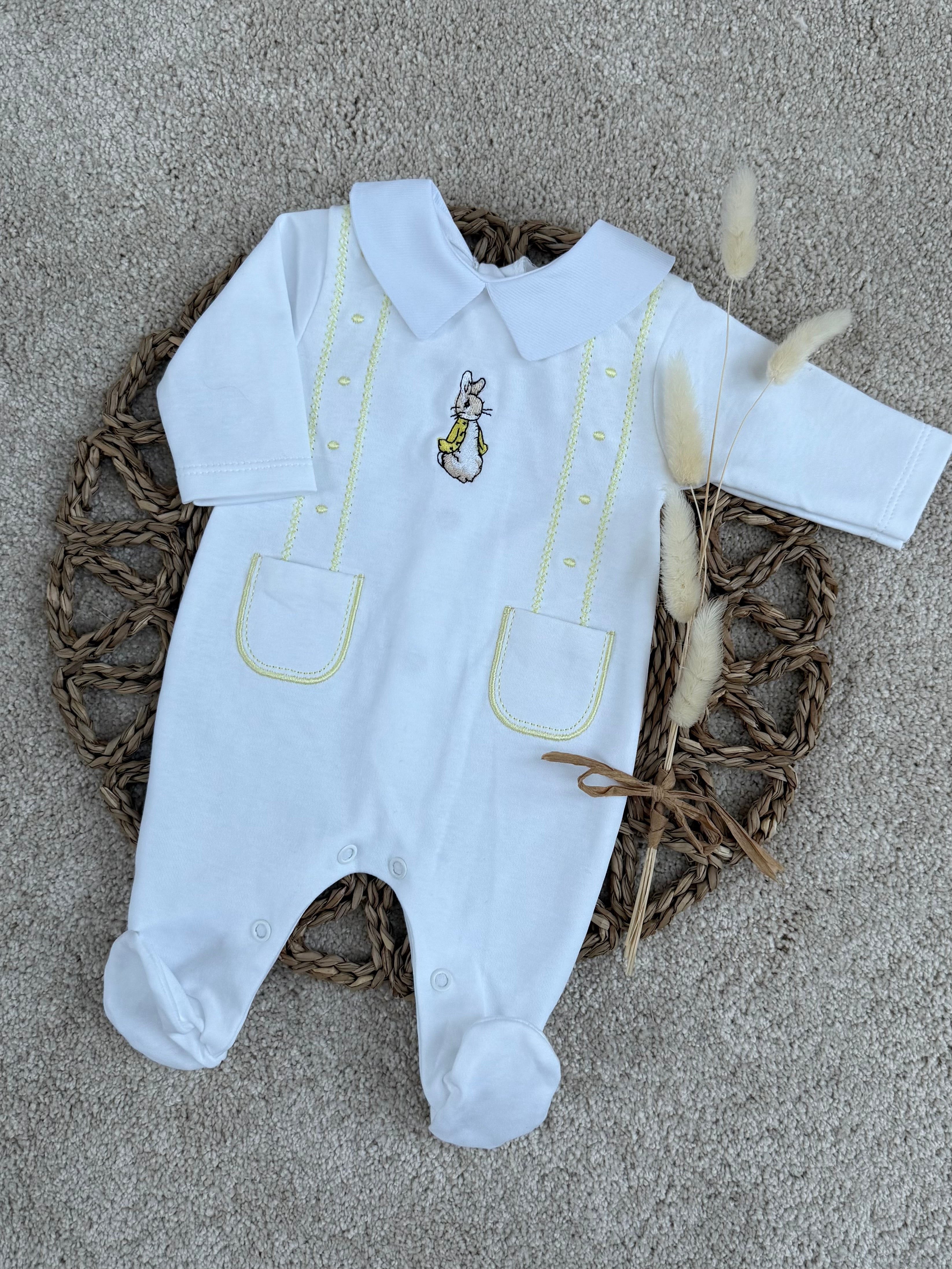 This adorable baby sleep suit is made from soft, breathable cotton, ensuring comfort and coziness for your little one. The pure white fabric is beautifully accented with a sweet lemon detail, adding a pop of color. The front features a charming embroidered Peter Rabbit design, bringing a touch of whimsy to bedtime. Please size up as these are small. For easy dressing, the sleep suit is designed with convenient poppers running up the back, making it simple to change your baby without any hassle. Perfect for keeping your baby snug and stylish, this sleep suit combines both comfort and cuteness in one delightful piece.