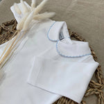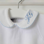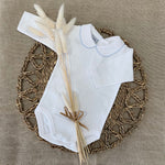 Little boys long-sleeved bodysuit by Babidu, made in soft cotton jersey. It has a rounded collar in a textured cotton fabric with a scalloped Blue edging. There are popper fastenings at the legs for easy dressing and changing. It is suitable for both boys and girls.