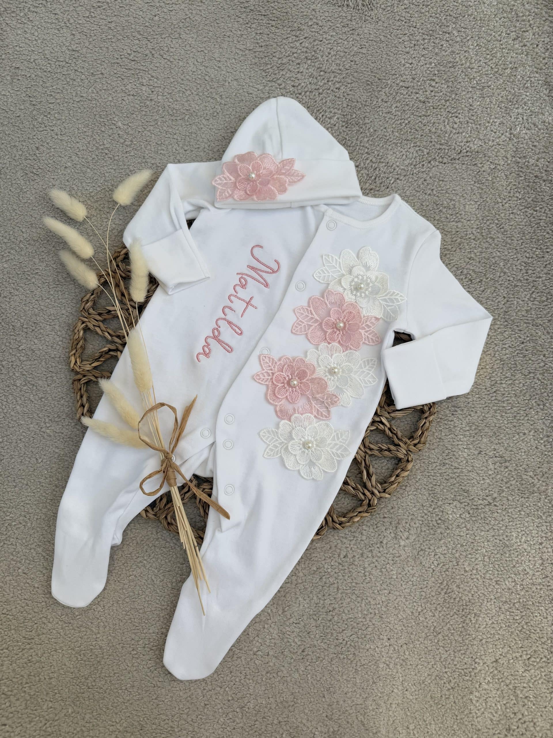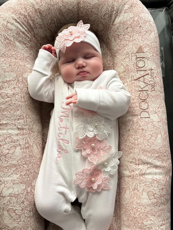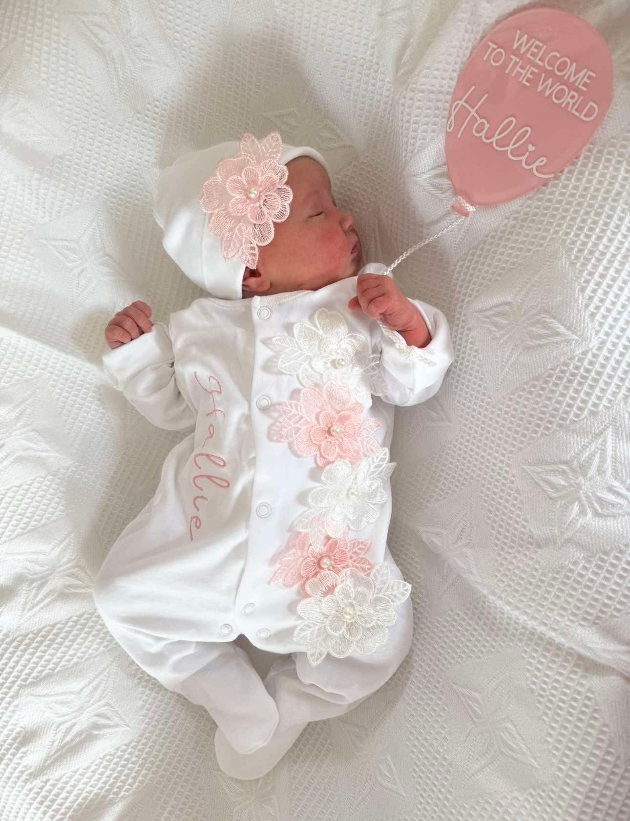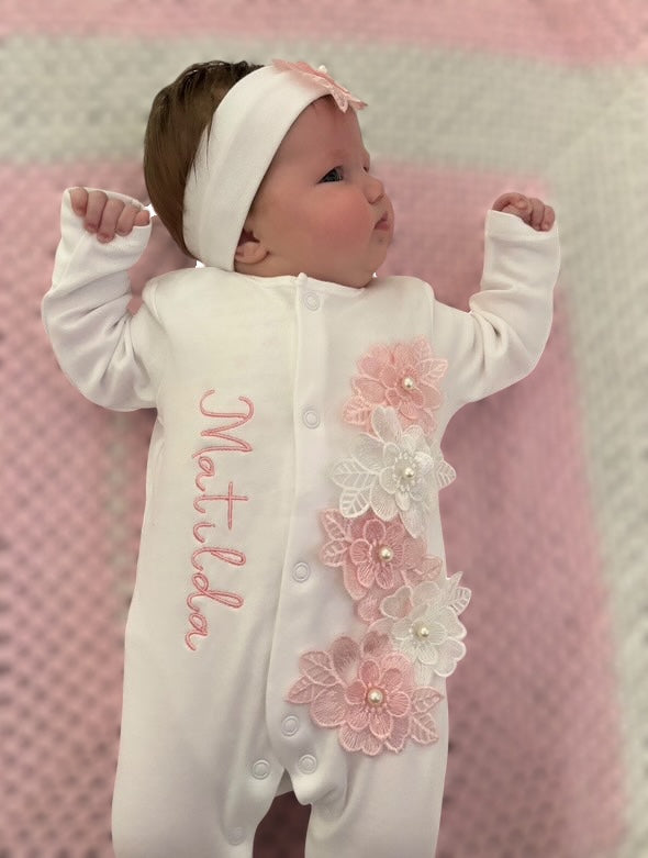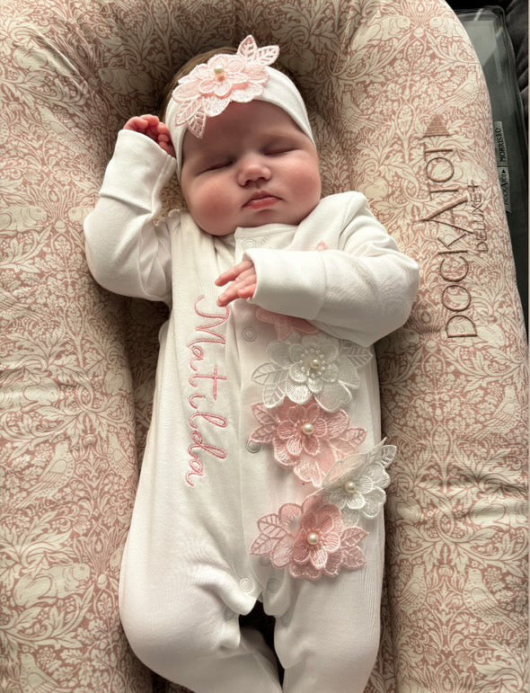 This is a beautiful unique handmade baby grow with 3D flower lace trims down the front made from 100% polyester you can have this with or with personalisation on the front. Comes With a beanie hat for NB and Headband for 0-3M , 3-6M