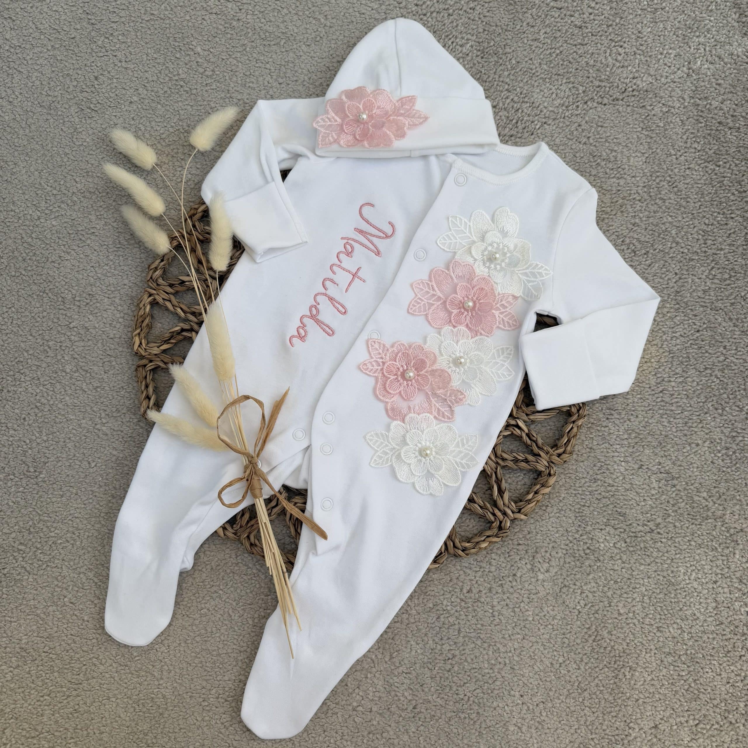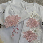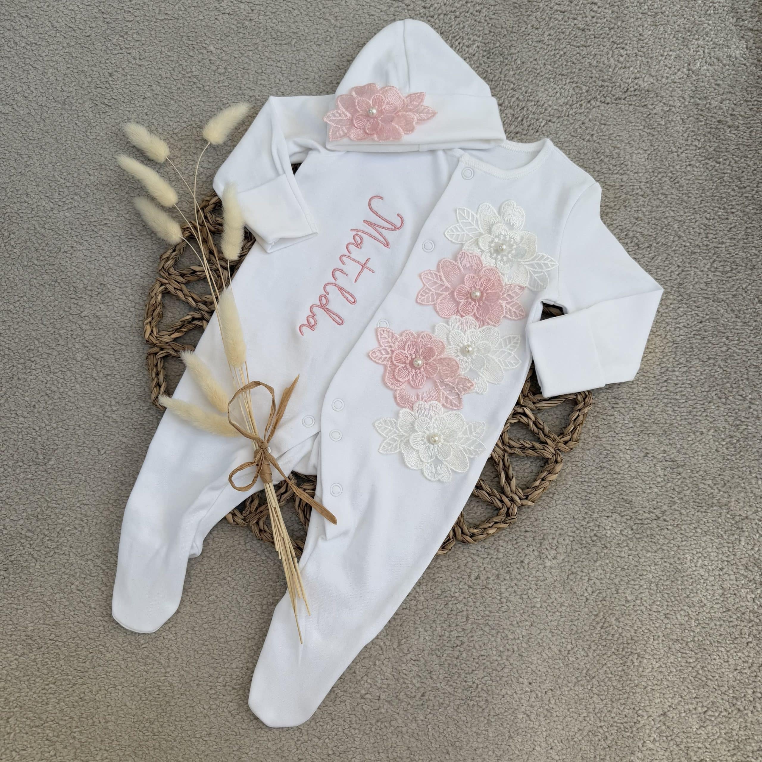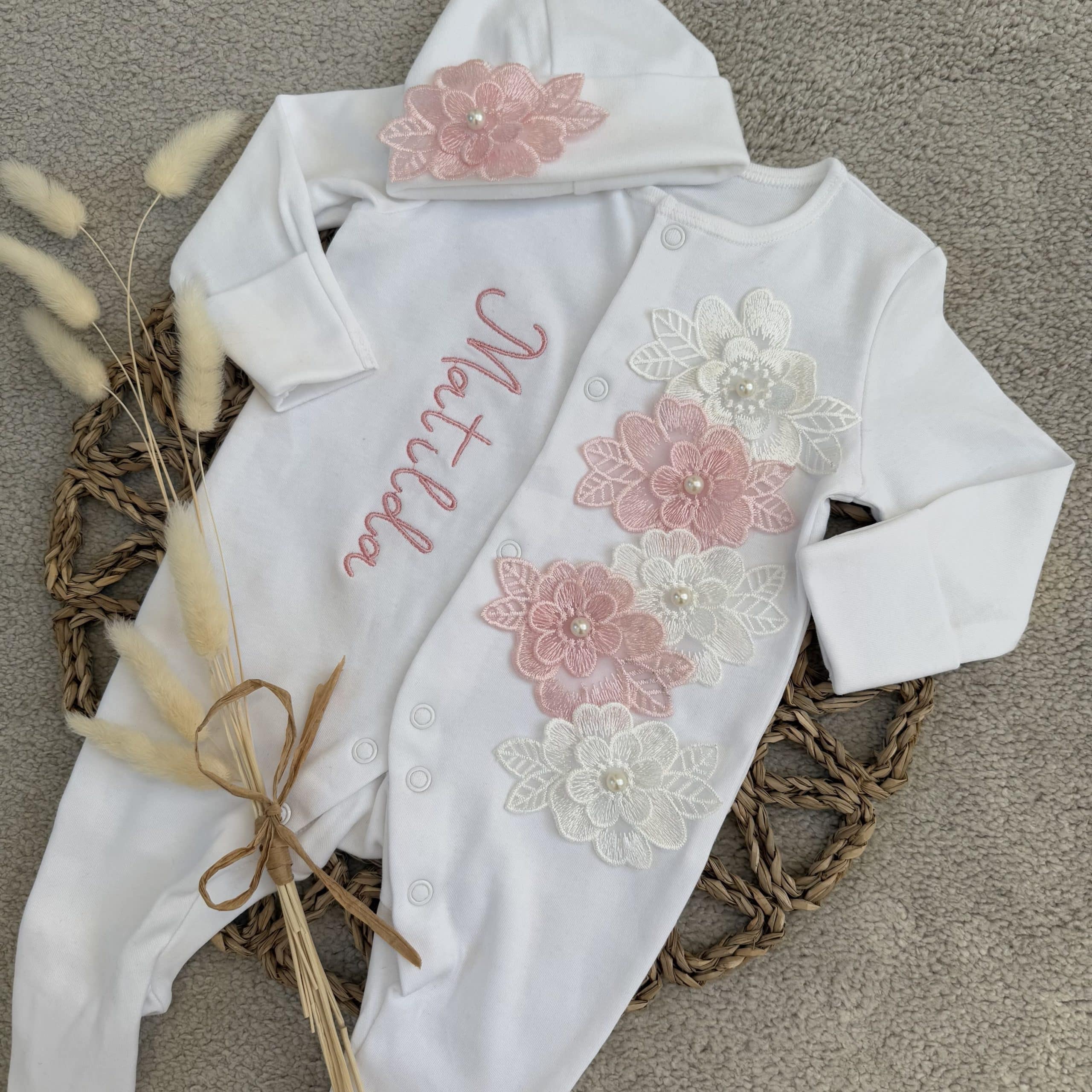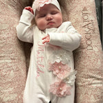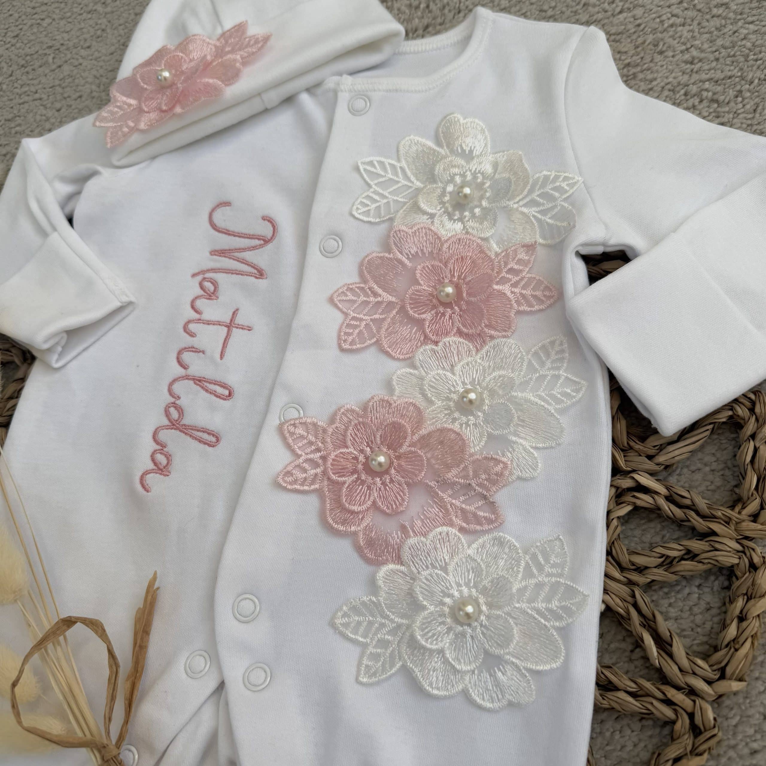 This is a beautiful unique handmade baby grow with 3D flower lace trims down the front made from 100% polyester you can have this with or with personalisation on the front. Comes With a beanie hat for NB and Headband for 0-3M , 3-6M