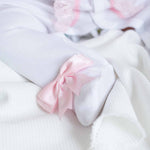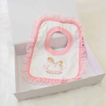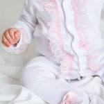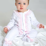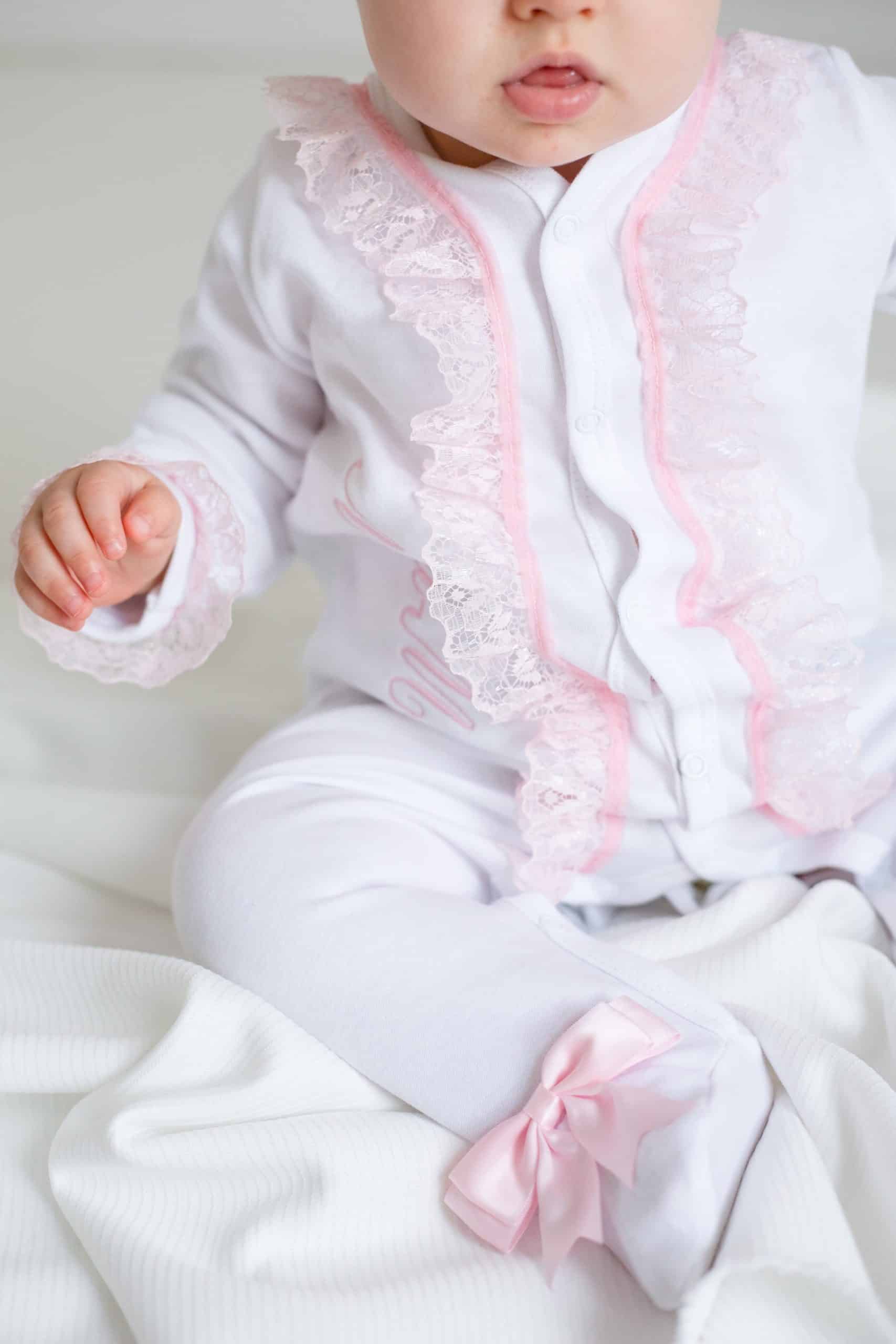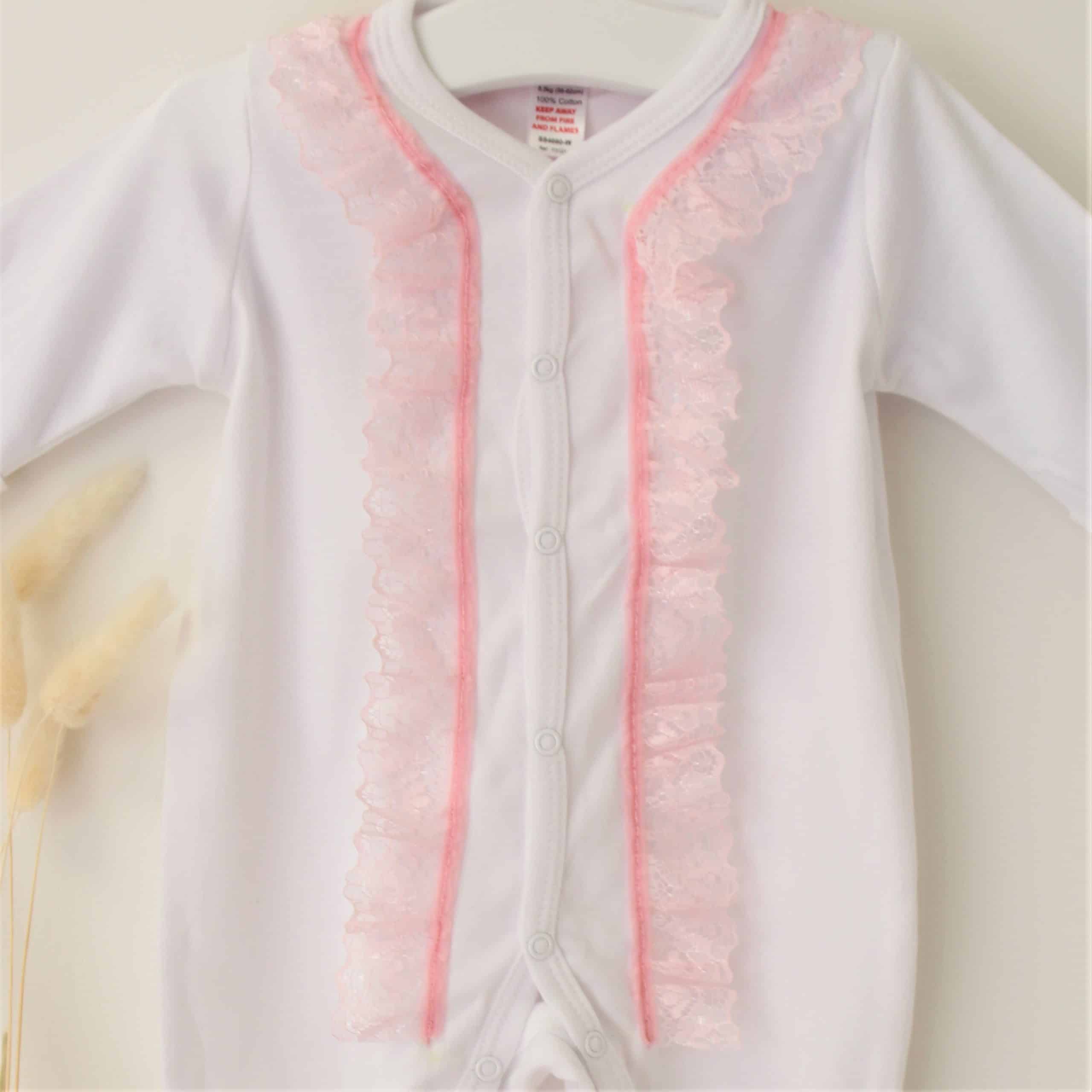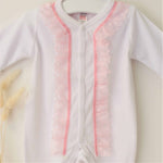 This beautiful unique handmade sleepsuit is just perfect! with a lace frill around the collar and down the front with frills around the cuffs, This handmade sleepsuit has a stunning Bows on the feet, and personalised name in embroidery down the front in your choice (Extra). This sleepsuit comes with a matching bib with the matching lace frill around the edge and a Rocking Horse,