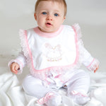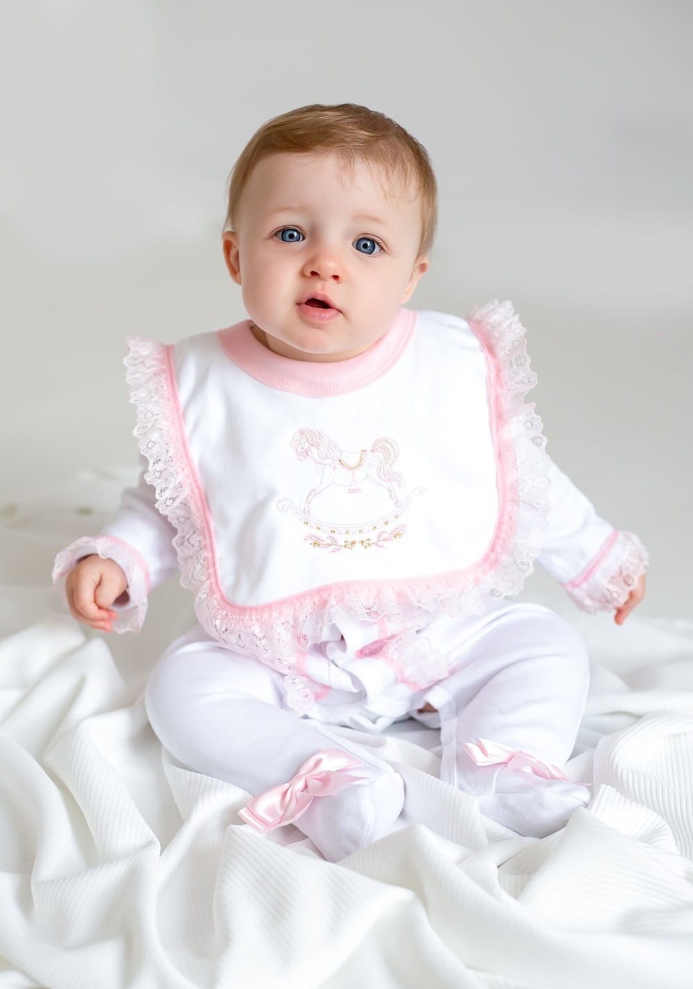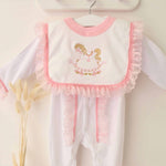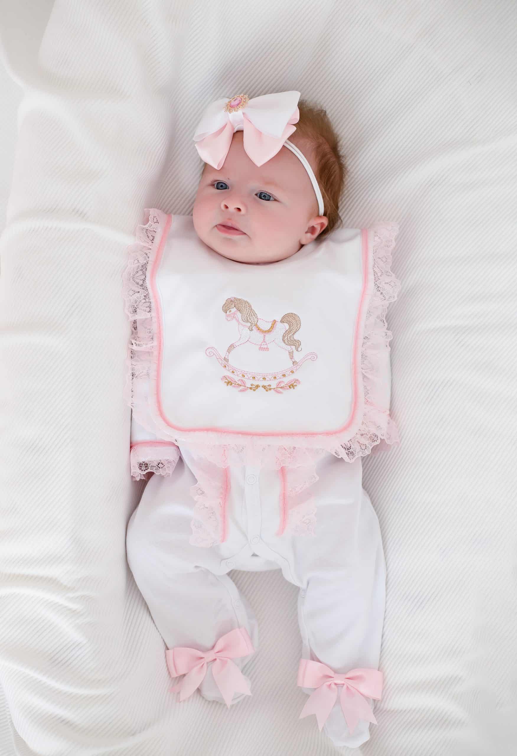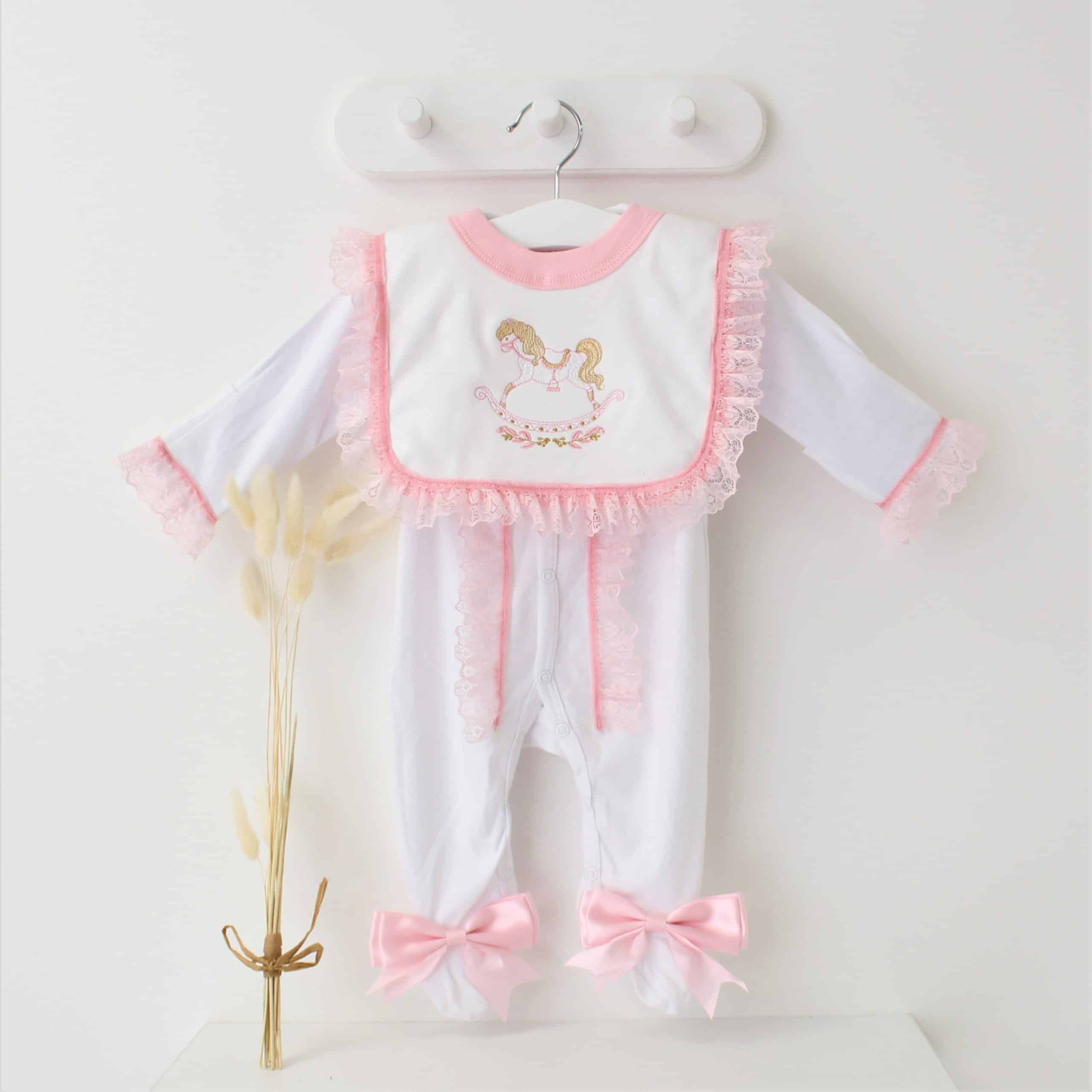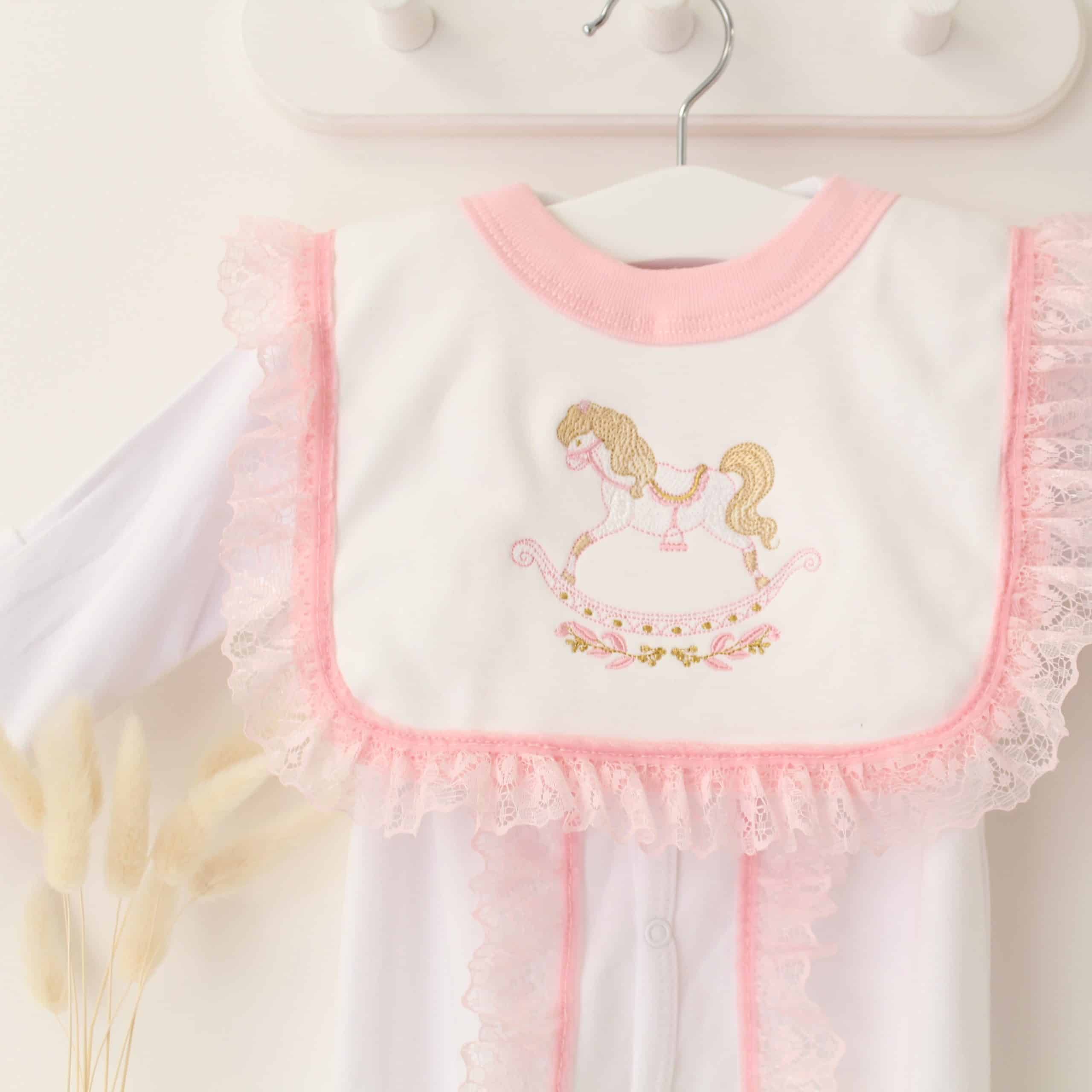 Perfect Little Thing Baby Girls Handmade Frill Sleepsuit With Bib - Rocking Horse