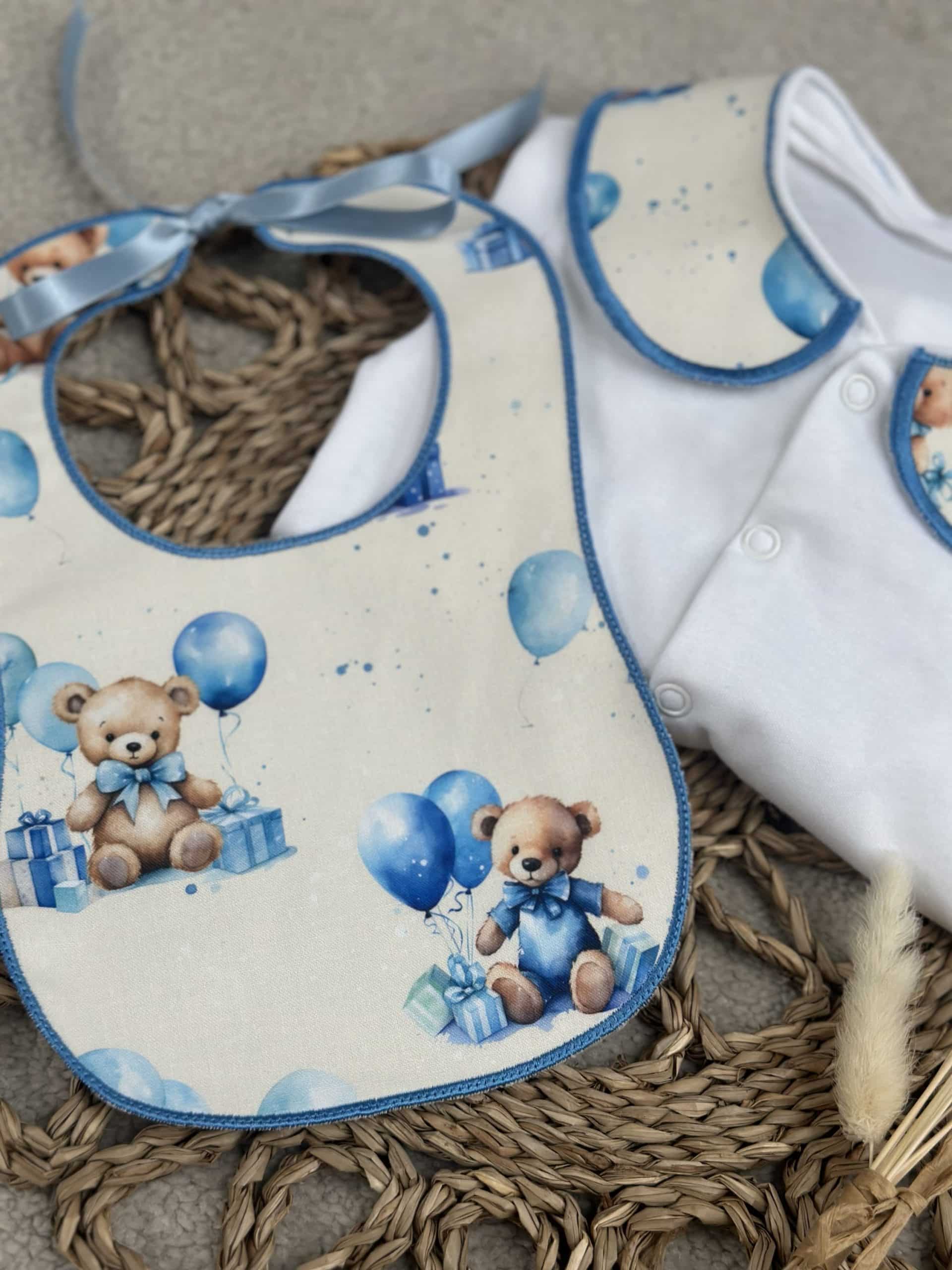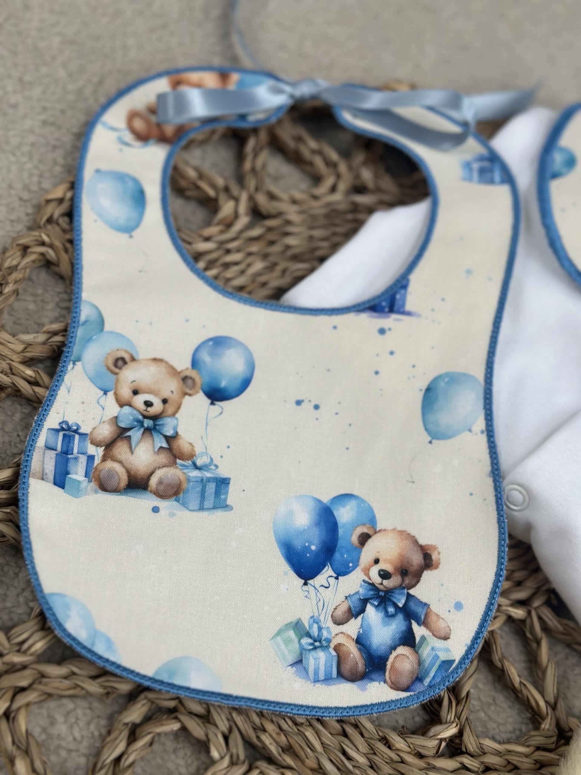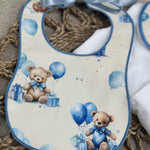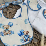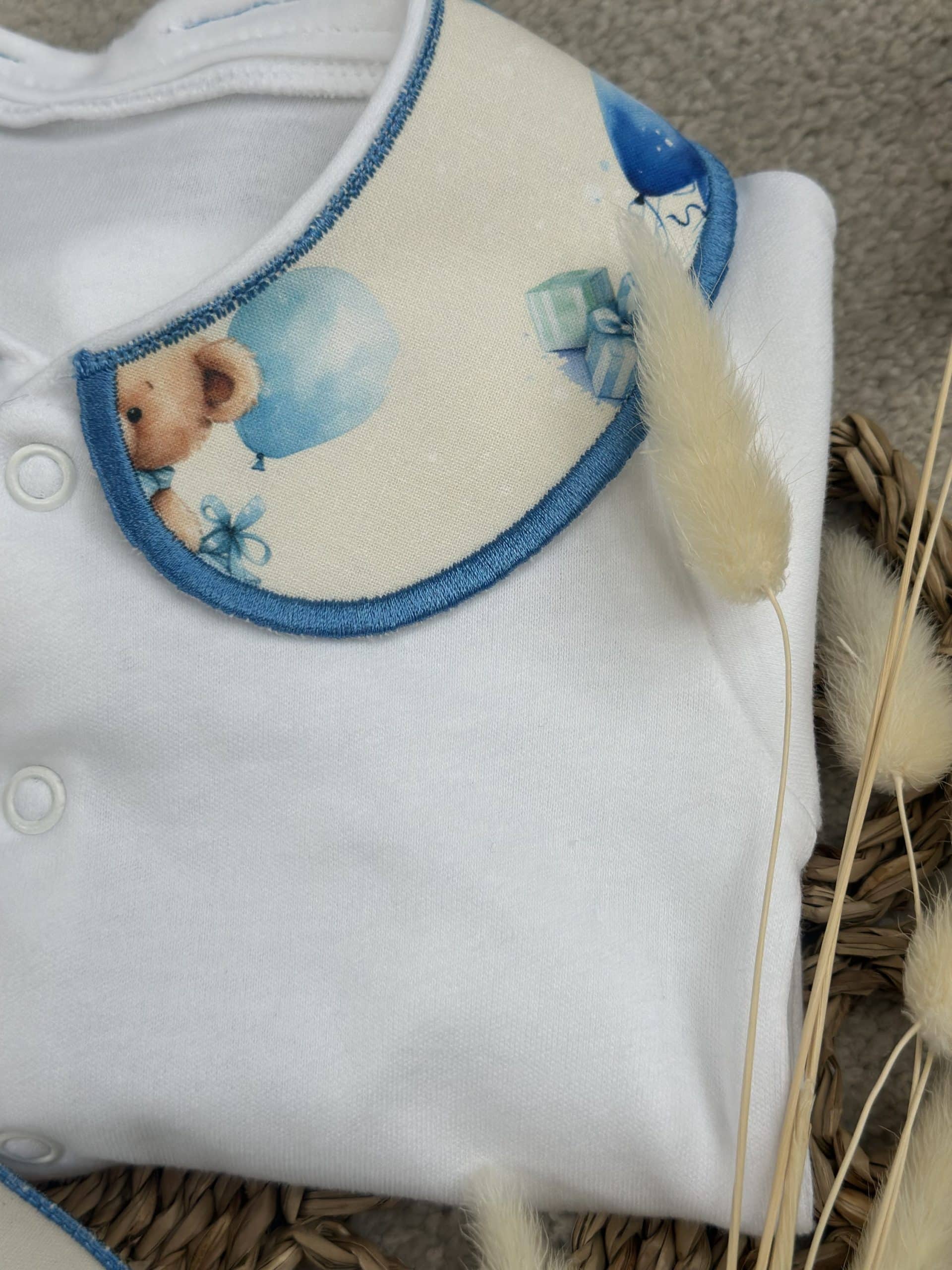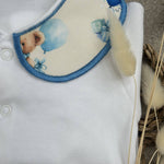 Boys White Teddy Balloon Handmade Sleepsuit And Bib