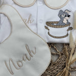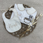 This handmade sleepsuit set is a charming and cozy choice for your little one. Crafted with love and care, the set features a soft, comfortable sleepsuit with a luxurious velvet collar, adding an elegant touch to the overall design. The included handmade bib is adorned with an embroidered rabbit, giving it a whimsical, vintage-inspired look that’s both adorable and timeless.