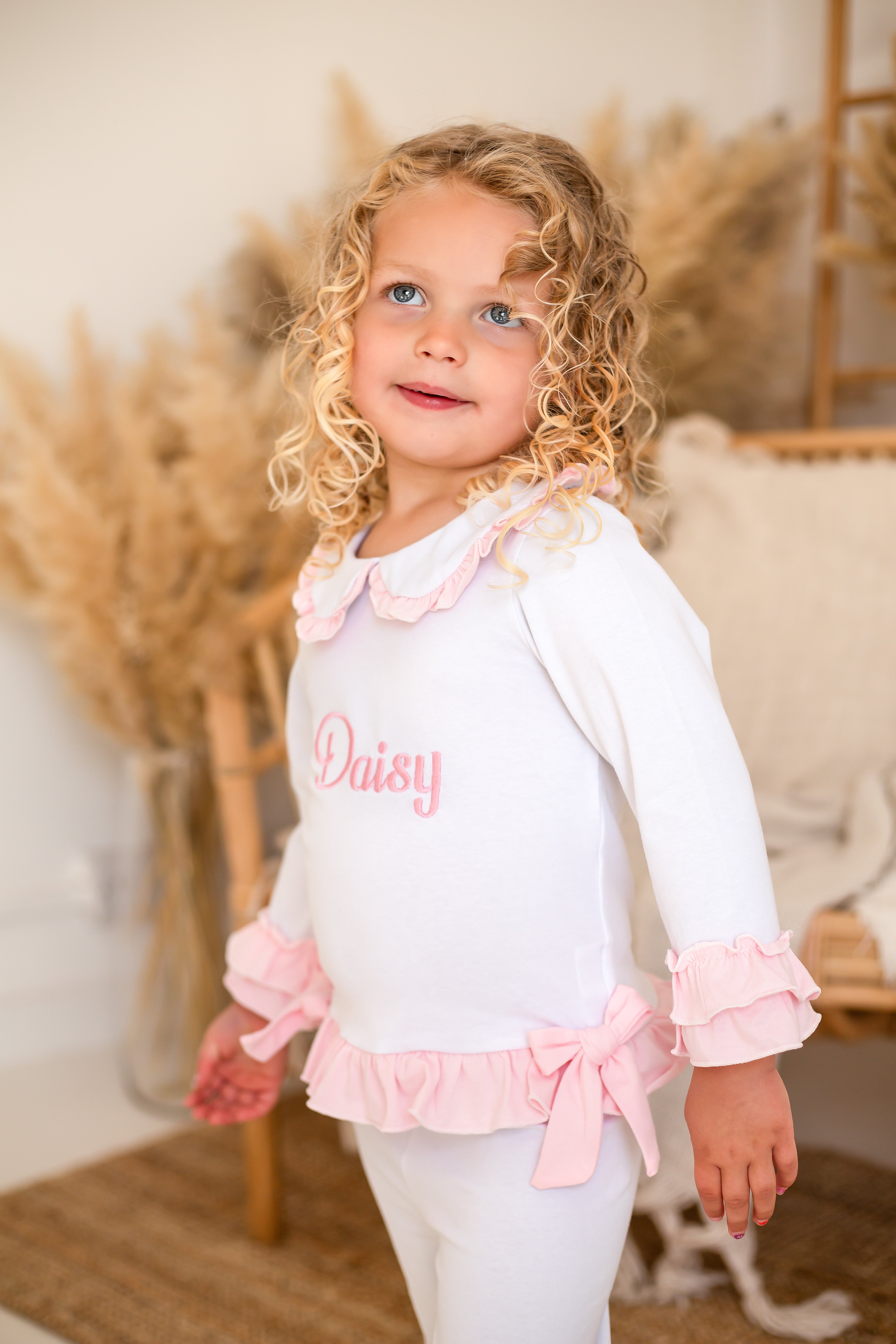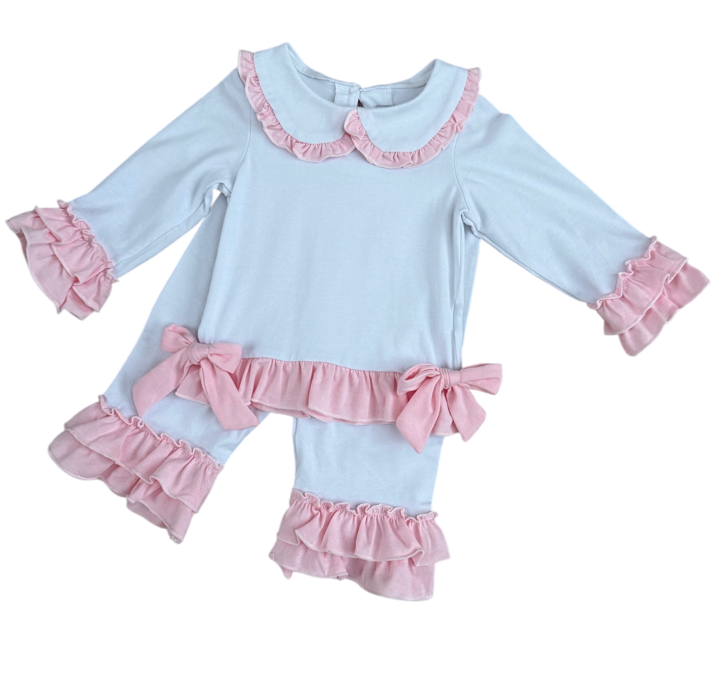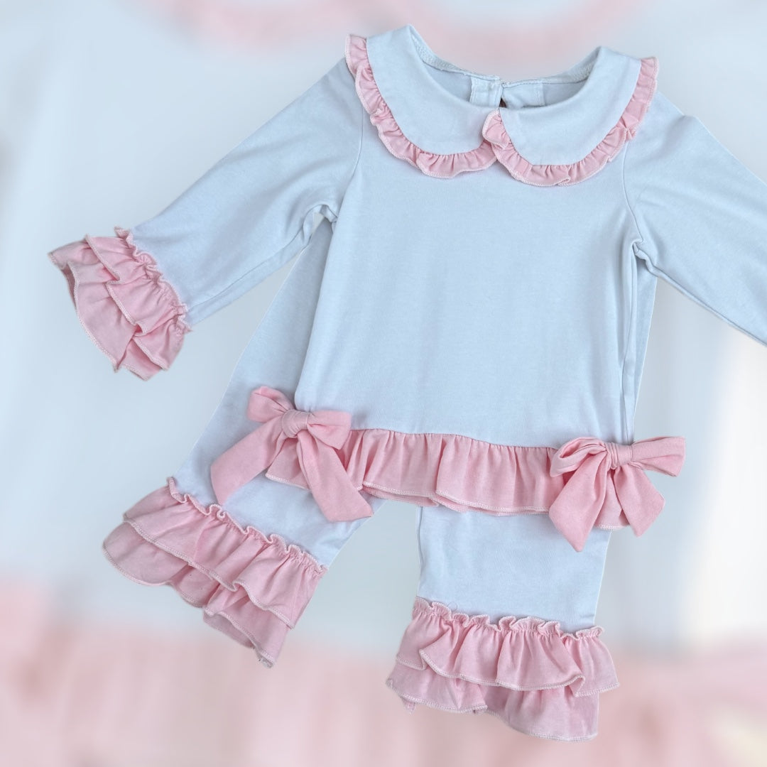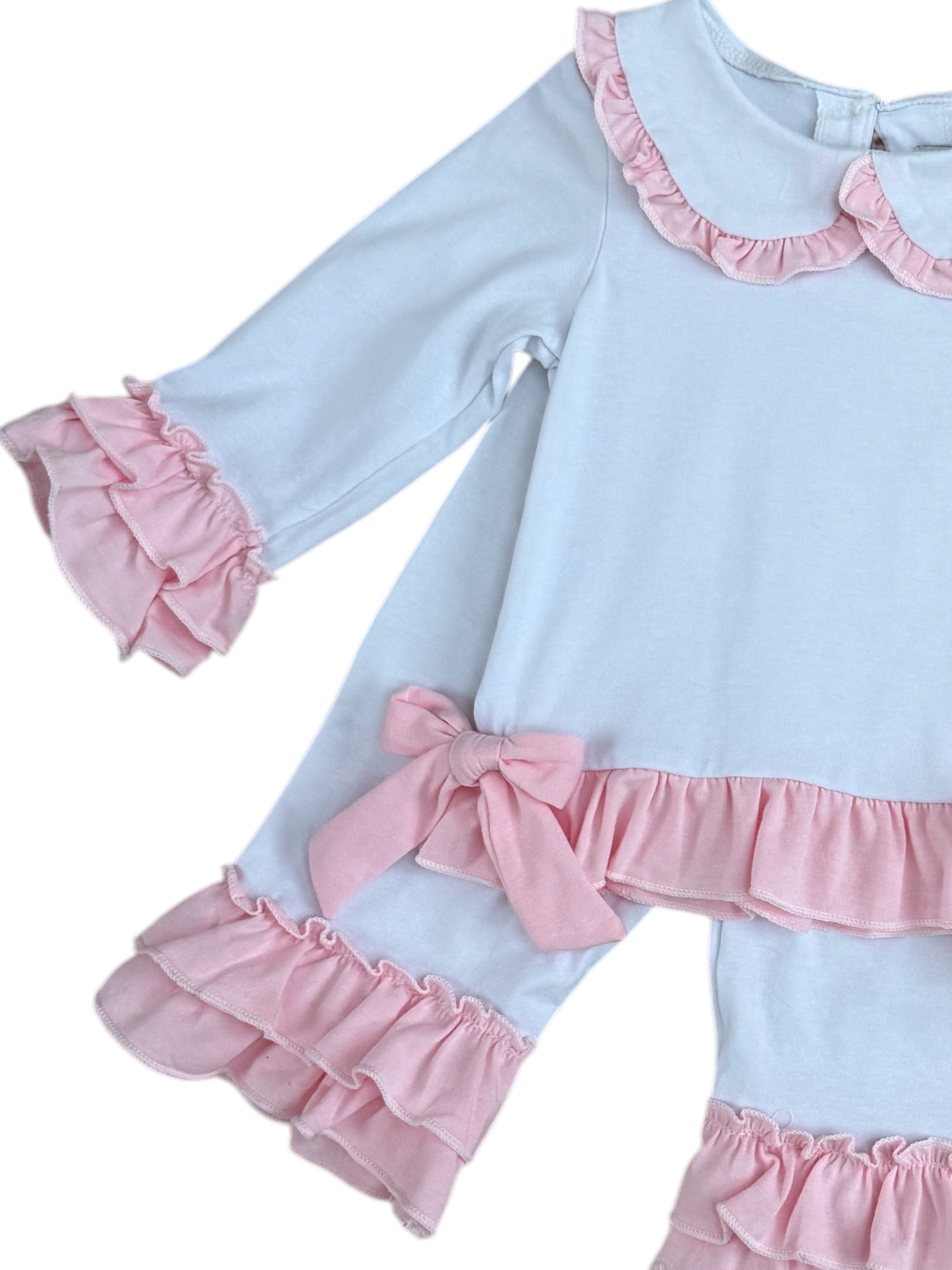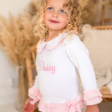 These charming little girls' white cotton PJs are a perfect blend of comfort and elegance. The top features delicate pink double frill cuffs and a pretty pink frill collar, adding a touch of sweetness. Two beautiful bows adorn the front, giving it an extra special detail. The matching pants are finished with a double frill at the bottom of the legs for a playful and feminine touch. These PJs can also be personalized with pink embroidery on the front, making them an ideal gift or keepsake. Soft, stylish, and customizable, they’re sure to be a favourite for your little one.