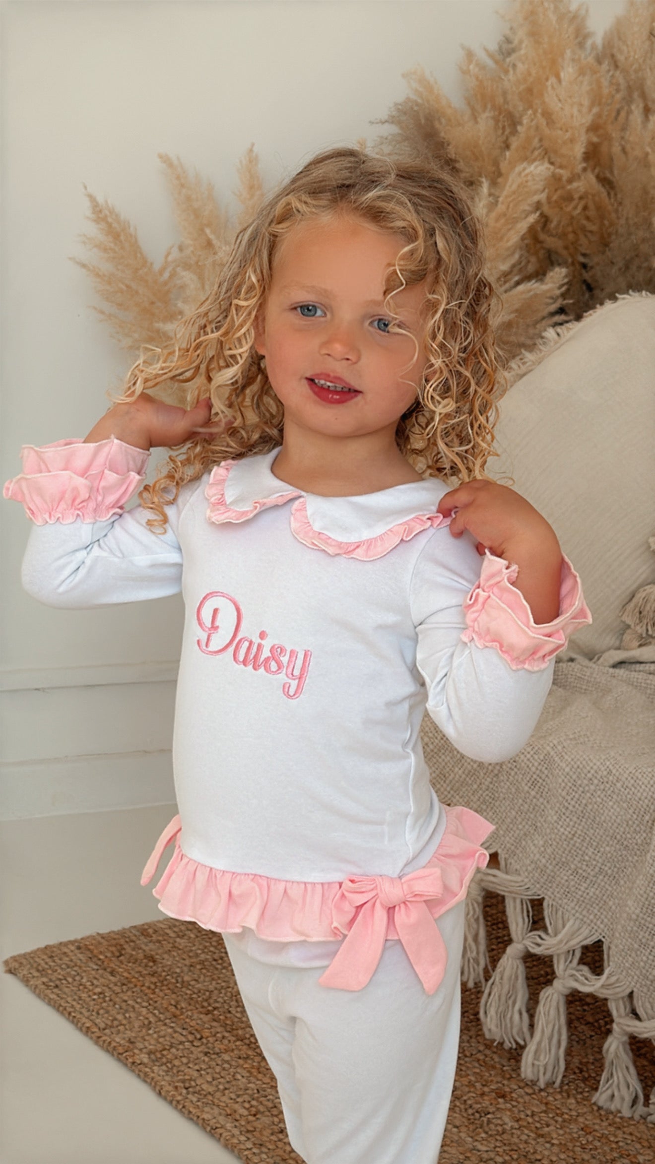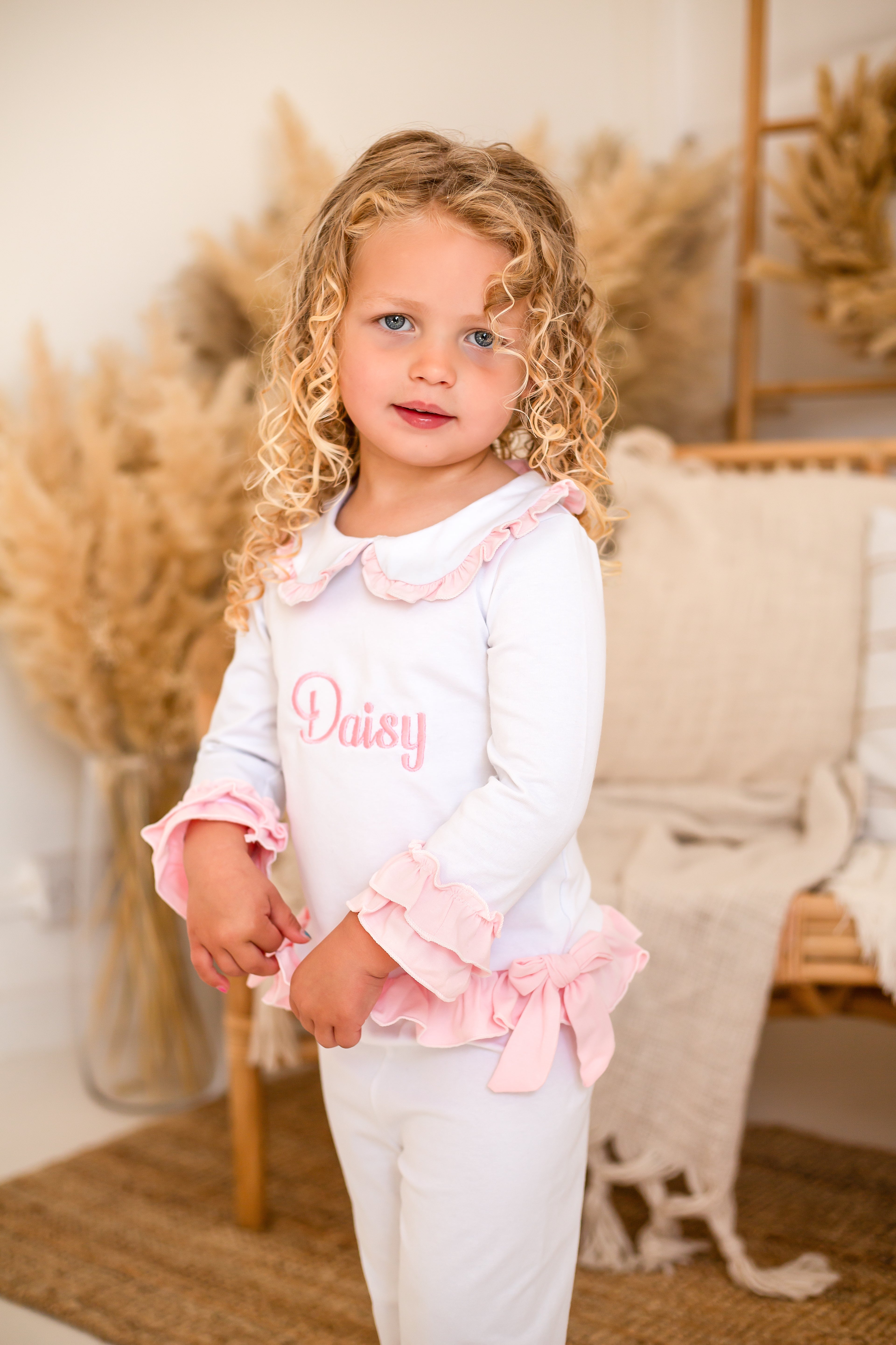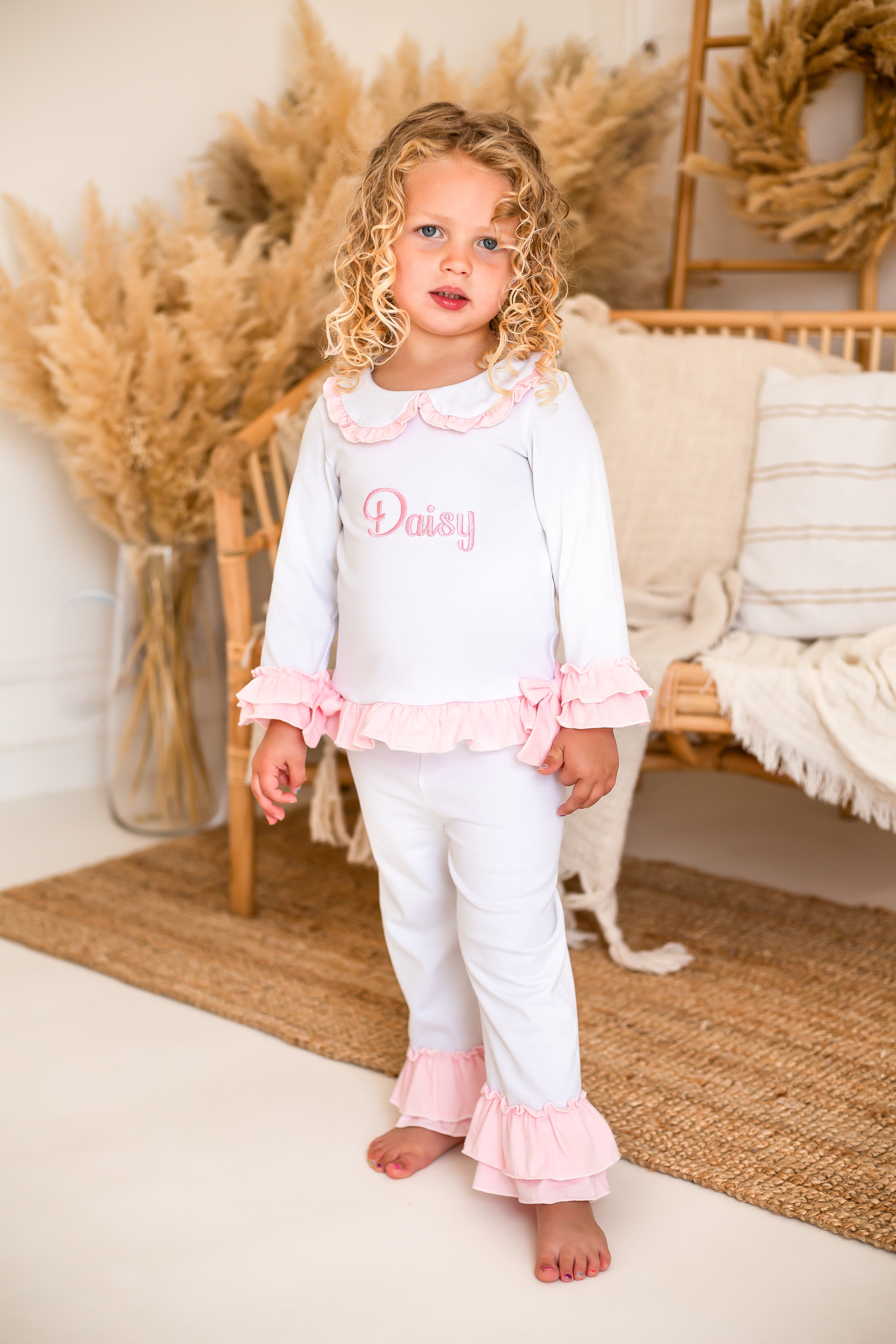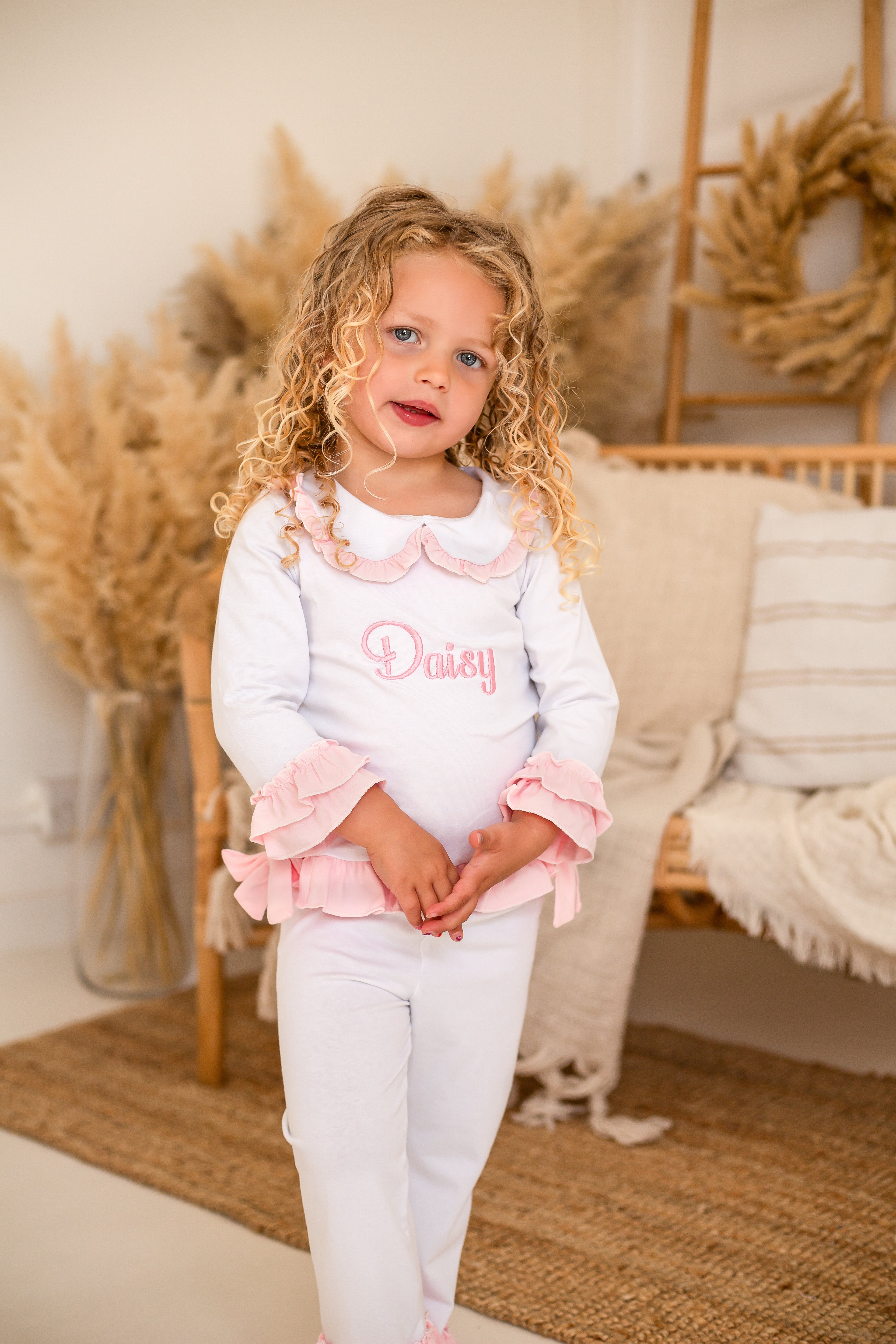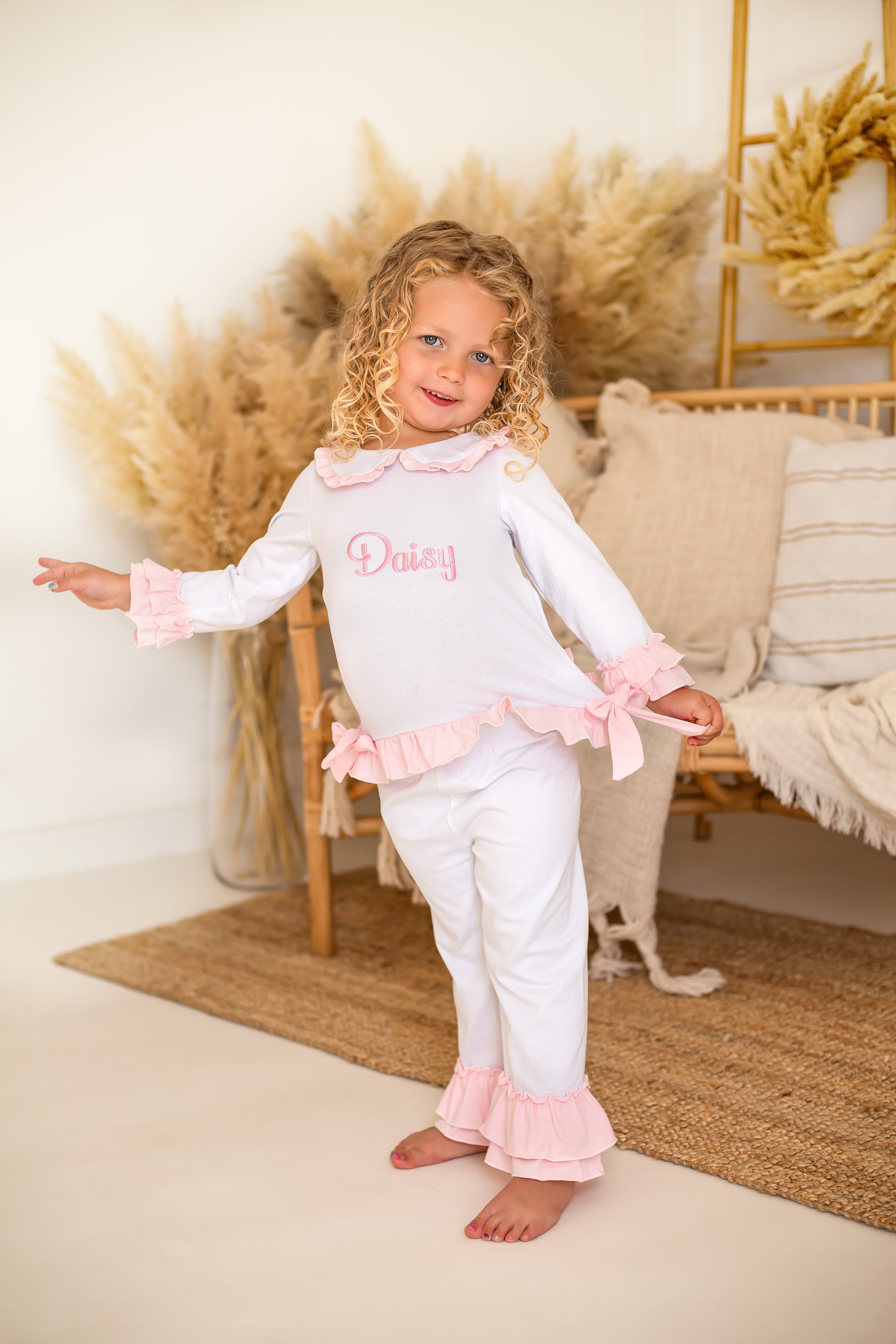 These charming little girls' white cotton PJs are a perfect blend of comfort and elegance. The top features delicate pink double frill cuffs and a pretty pink frill collar, adding a touch of sweetness. Two beautiful bows adorn the front, giving it an extra special detail. The matching pants are finished with a double frill at the bottom of the legs for a playful and feminine touch. These PJs can also be personalized with pink embroidery on the front, making them an ideal gift or keepsake. Soft, stylish, and customizable, they’re sure to be a favourite for your little one.