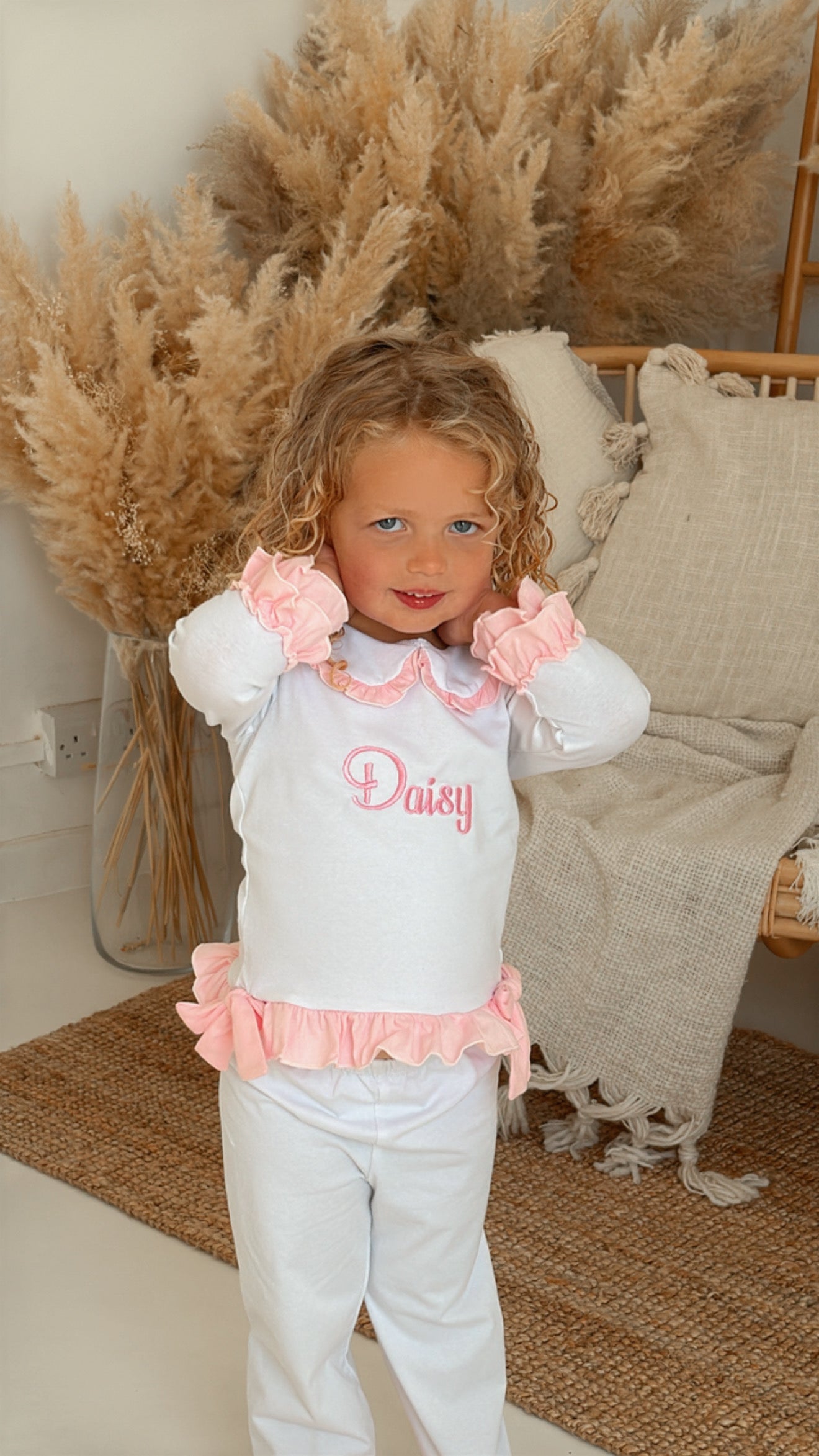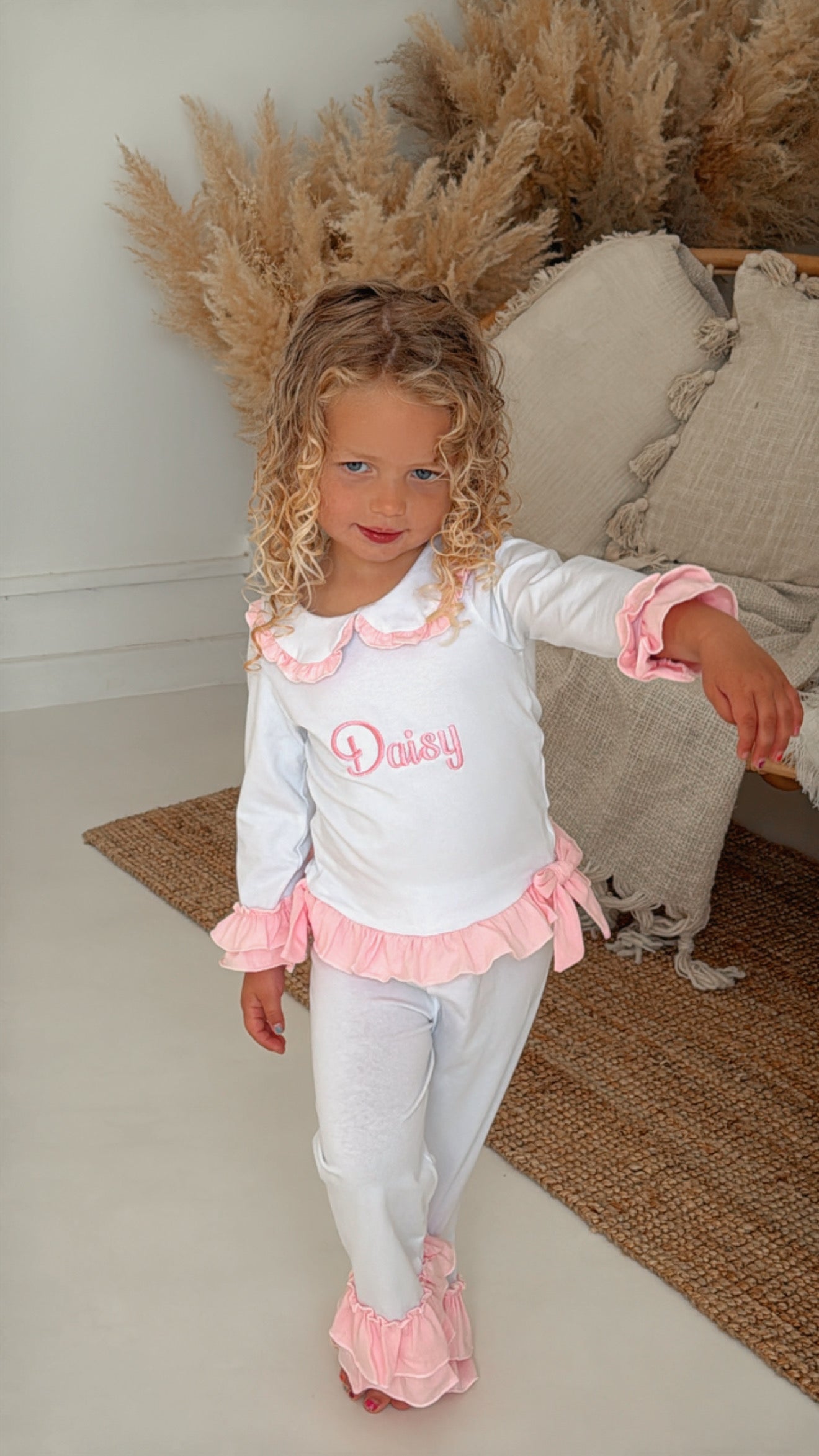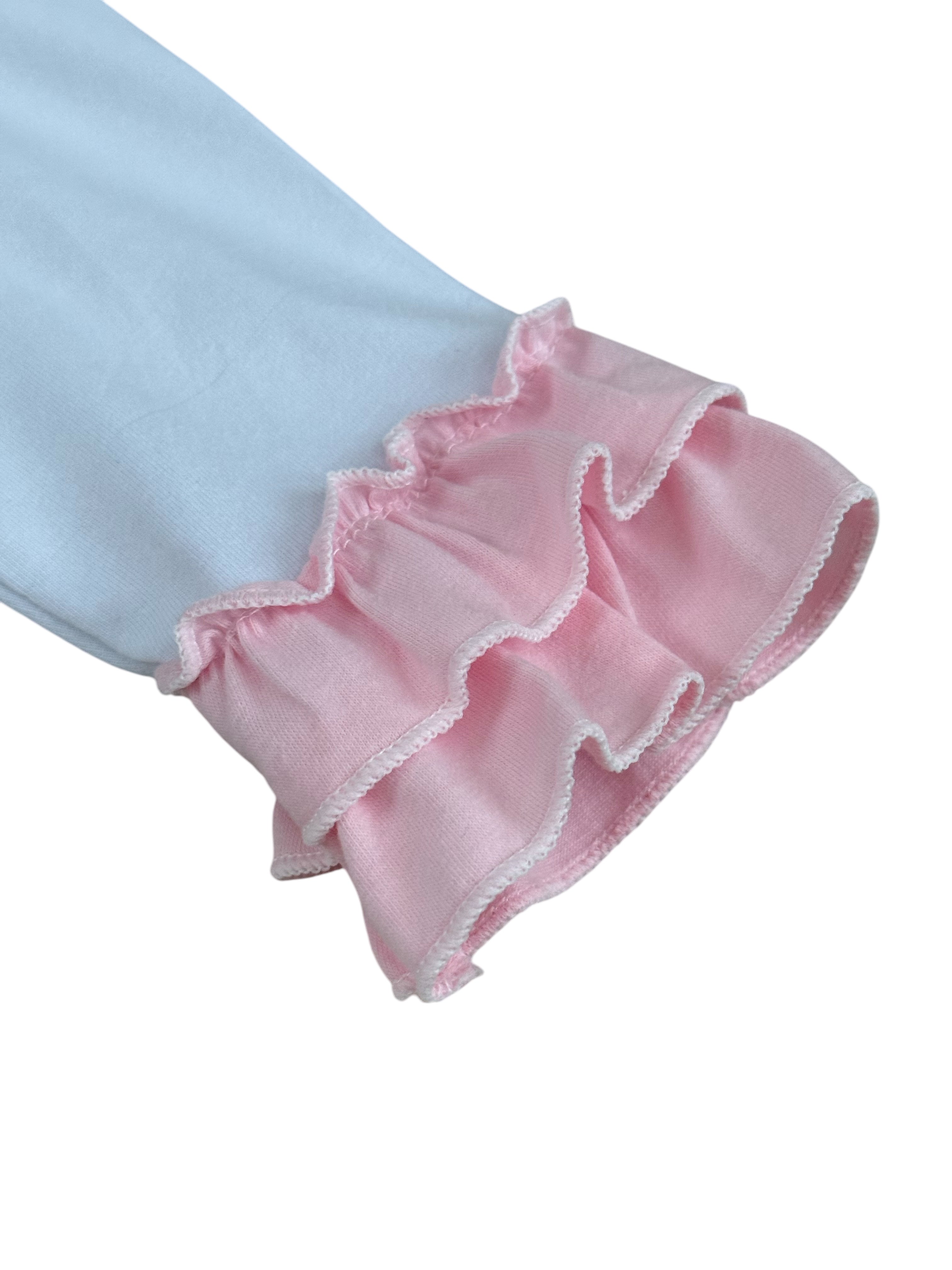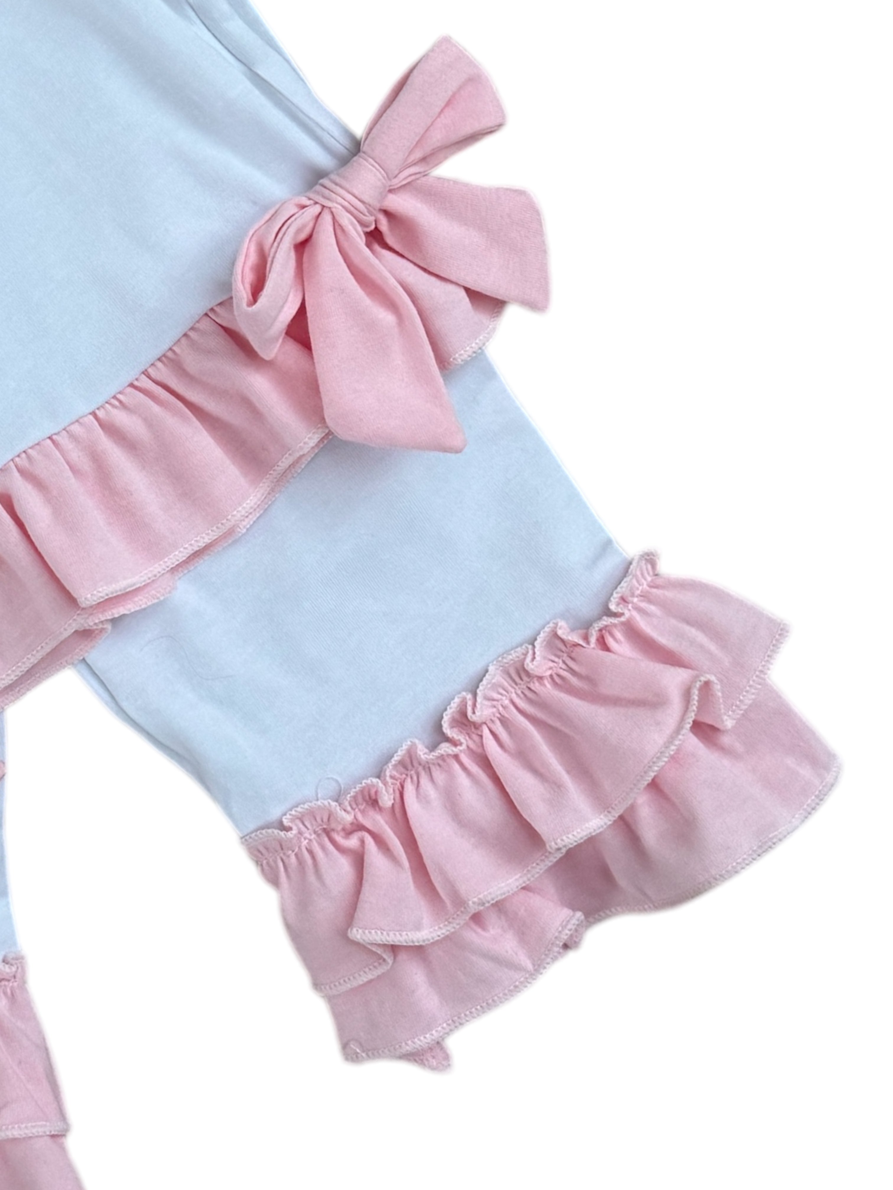 These charming little girls' white cotton PJs are a perfect blend of comfort and elegance. The top features delicate pink double frill cuffs and a pretty pink frill collar, adding a touch of sweetness. Two beautiful bows adorn the front, giving it an extra special detail. The matching pants are finished with a double frill at the bottom of the legs for a playful and feminine touch. These PJs can also be personalized with pink embroidery on the front, making them an ideal gift or keepsake. Soft, stylish, and customizable, they’re sure to be a favourite for your little one.