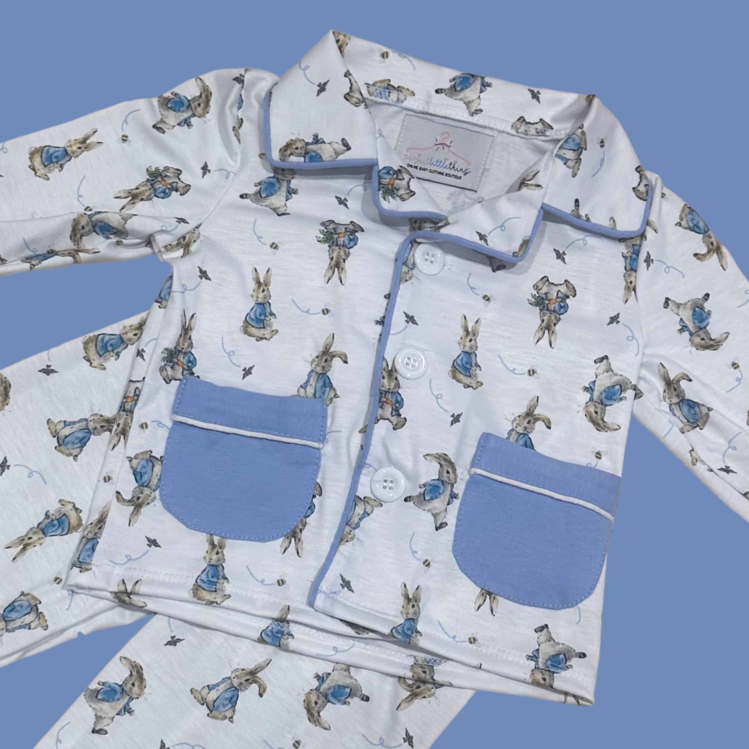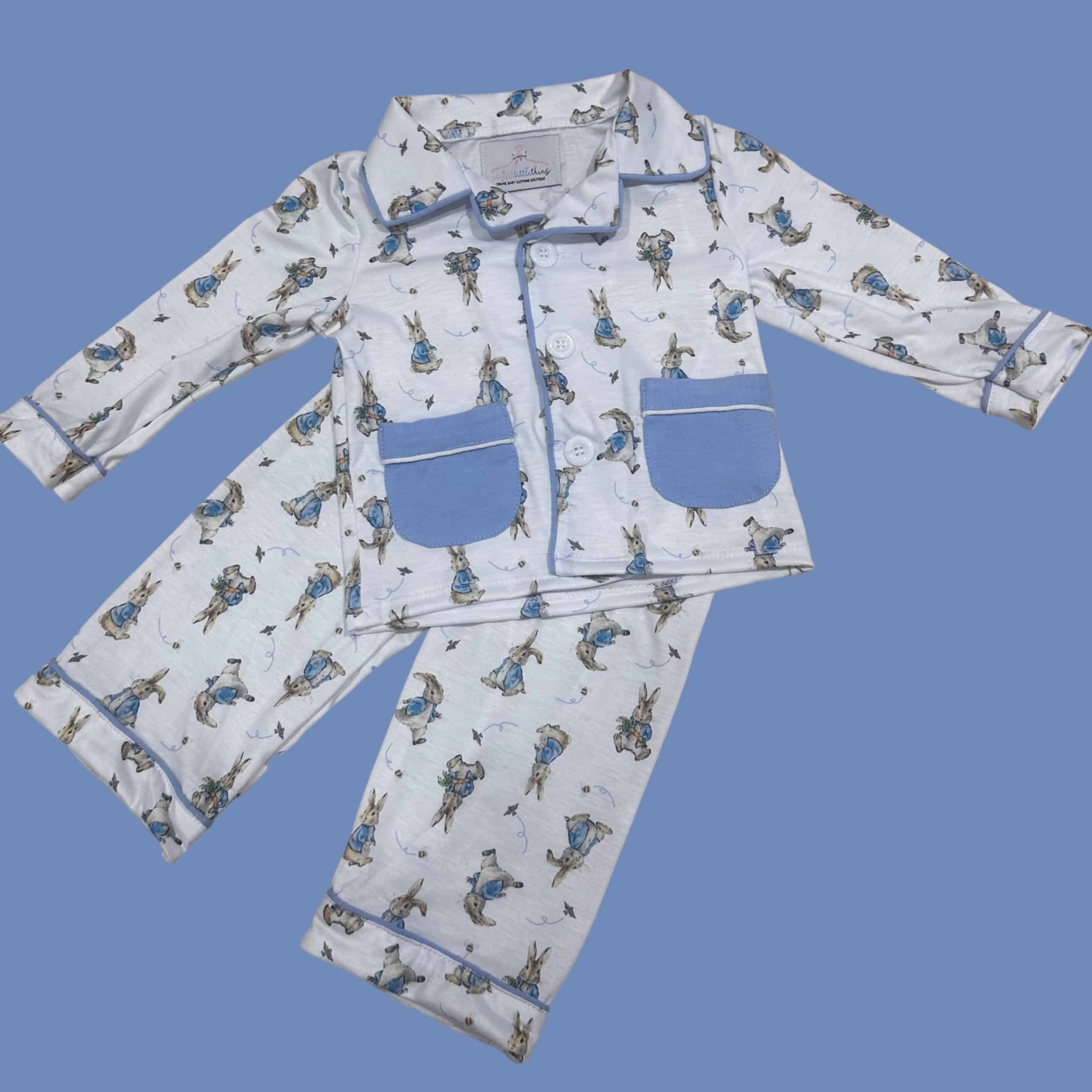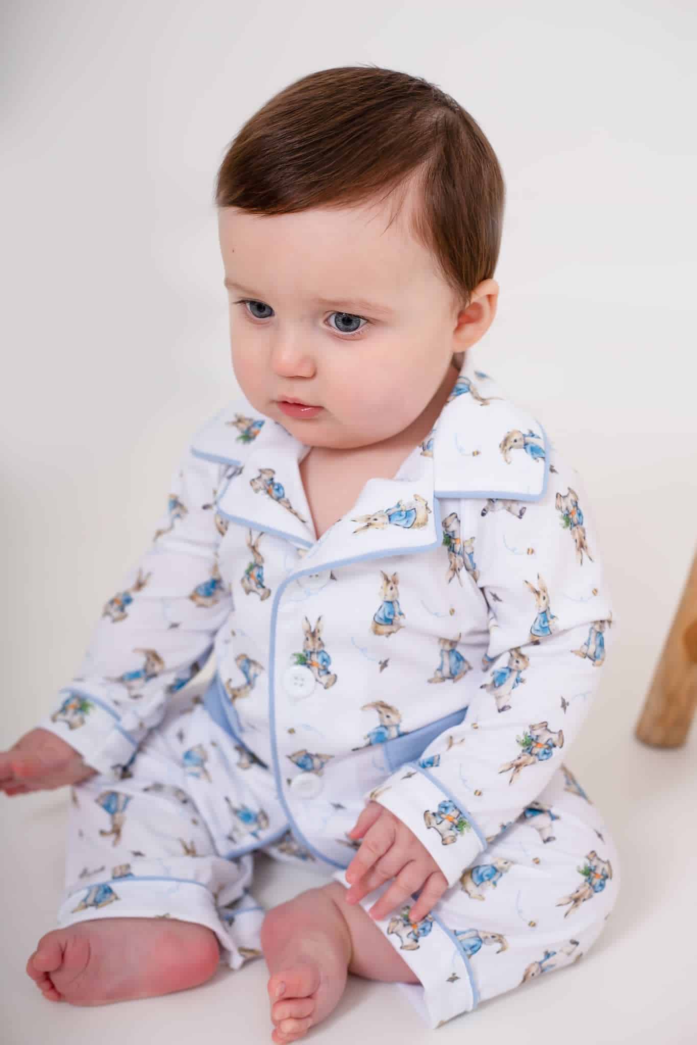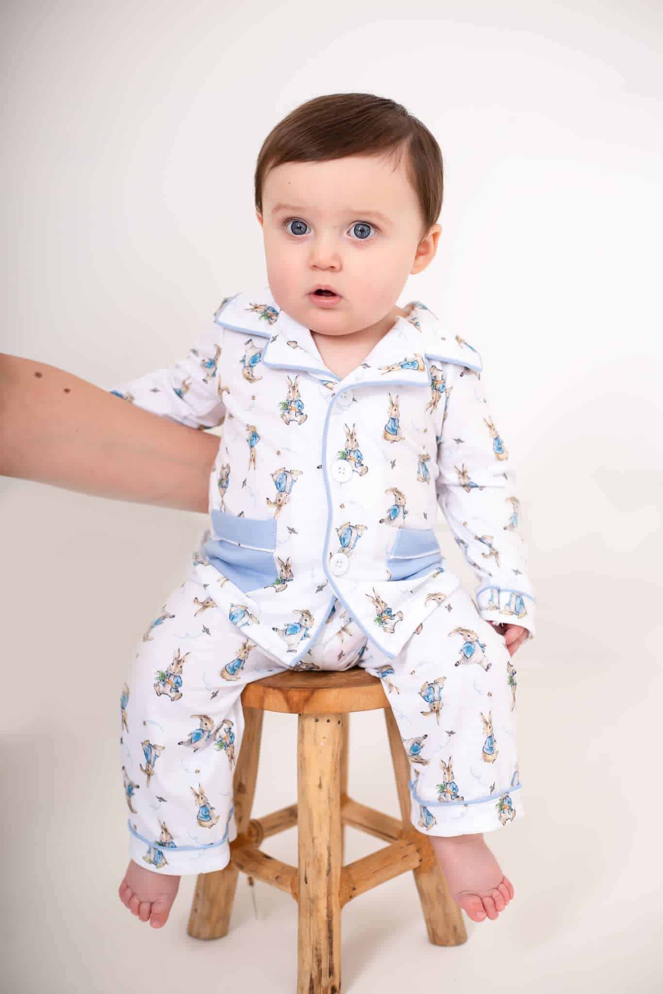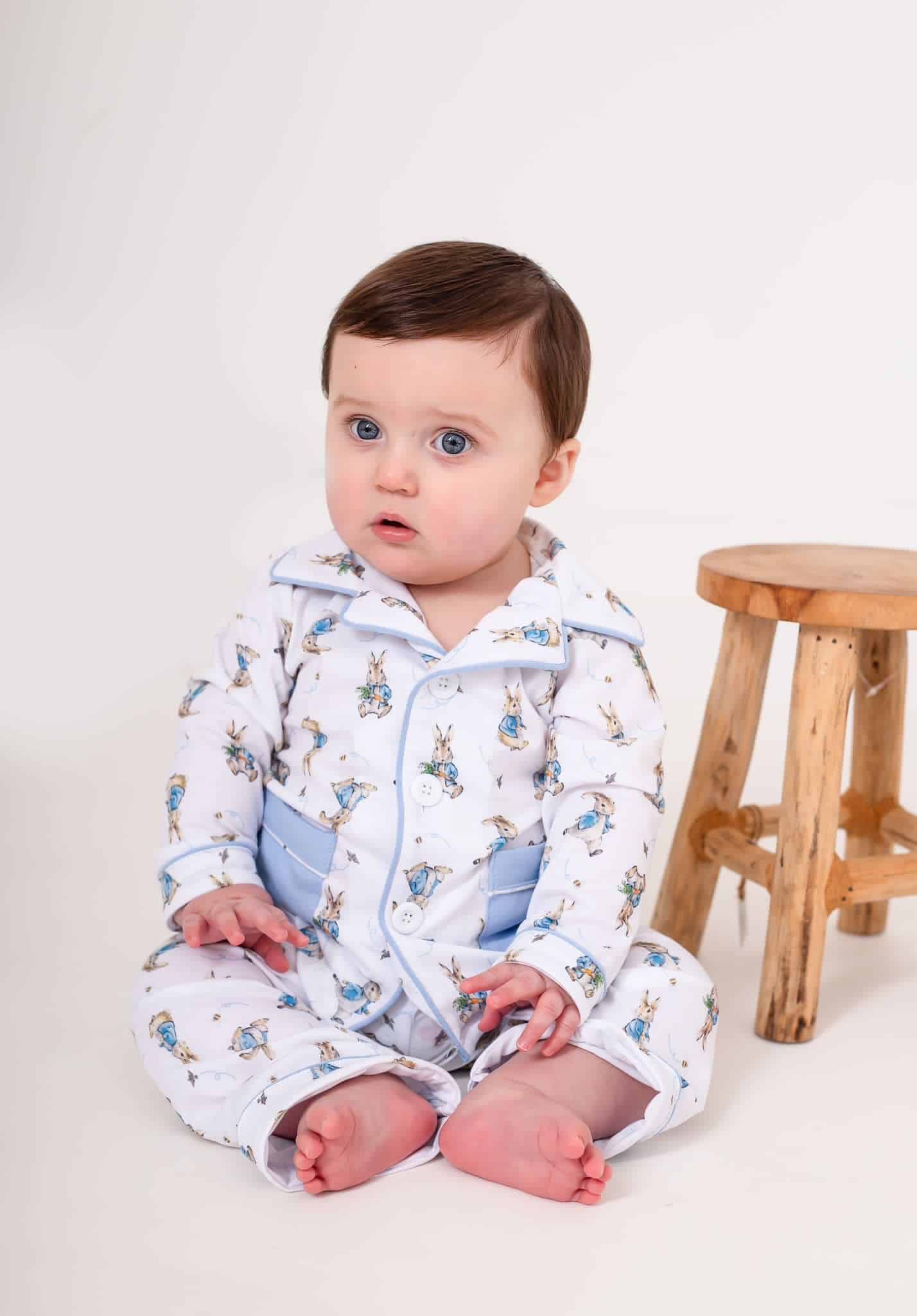 Shop our adorable boys' Peter Rabbit PJ set, perfect for Easter! Featuring a long-sleeved top and pants with a charming Peter Rabbit all-over print. Made from soft, stretchy spandex material for ultimate comfort. Plus, don't miss our matching little brother rompers for the cutest sibling look!