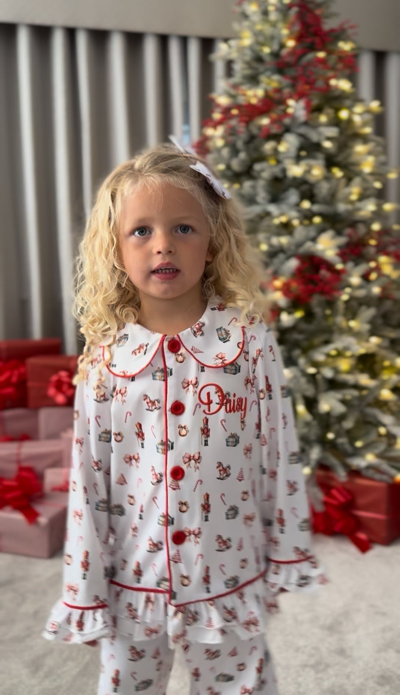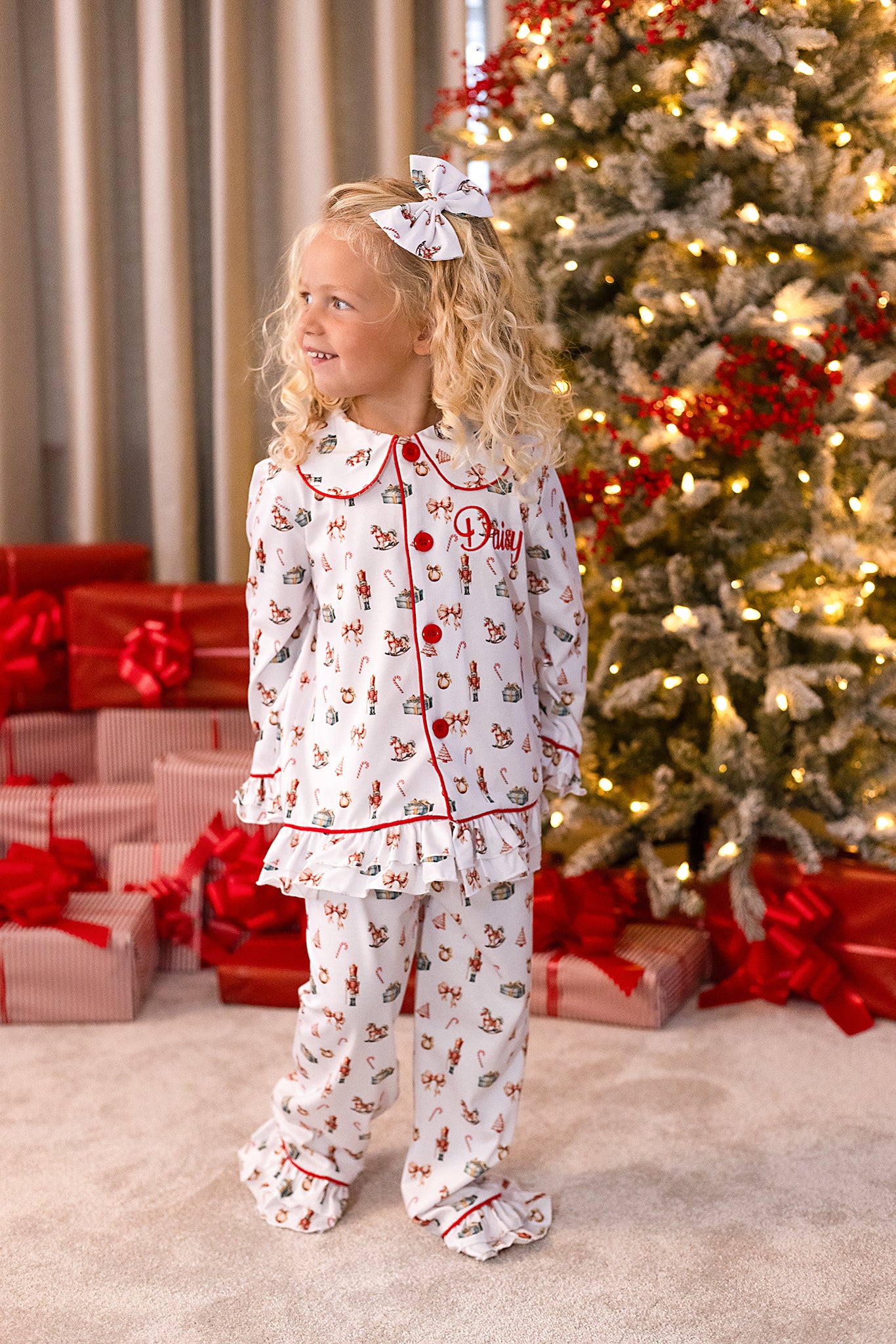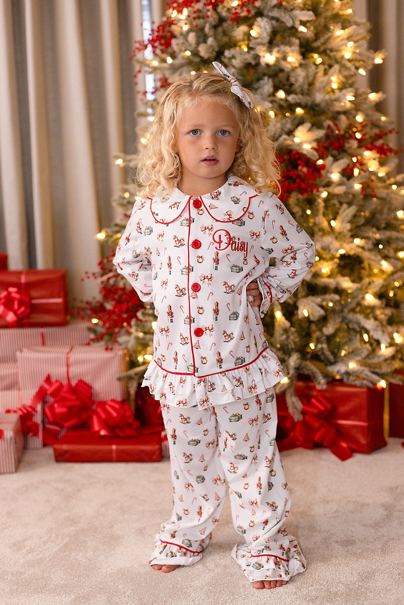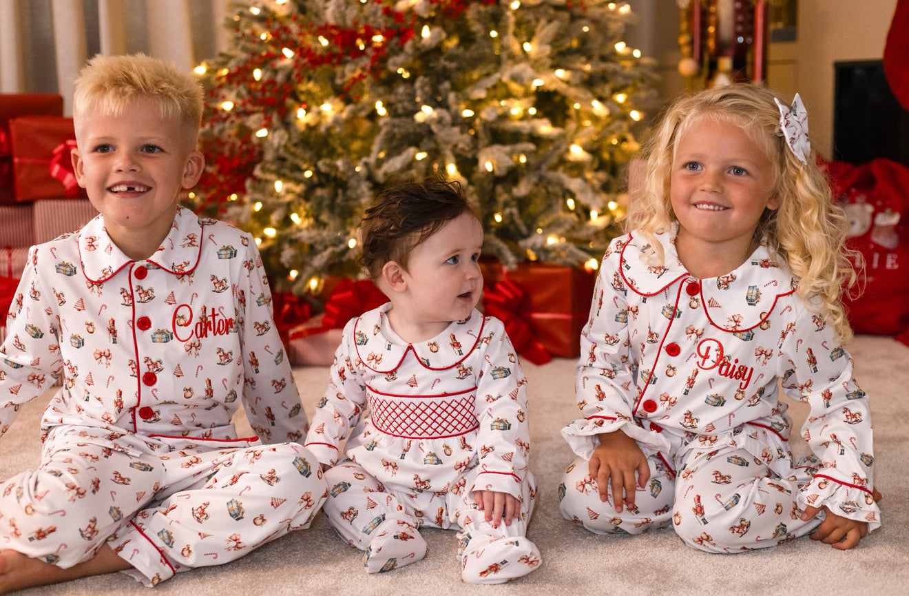 The pyjamas are finished with thoughtful details including a classic Peter Pan collar with red piping, frilled cuffs and hems for a touch of elegance, and red button fastening down the front. The chest also features a sweet embroidered initial for a personal festive touch.Perfect for cosy nights, Christmas Eve traditions, or those all-important festive morning photos by the trees