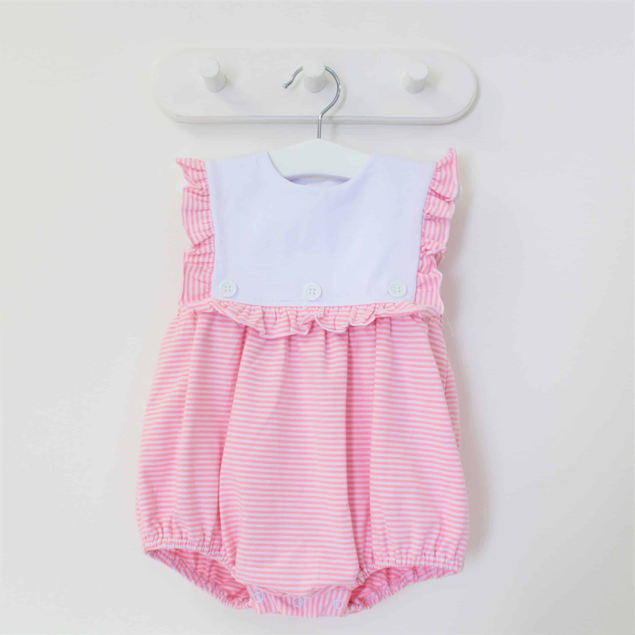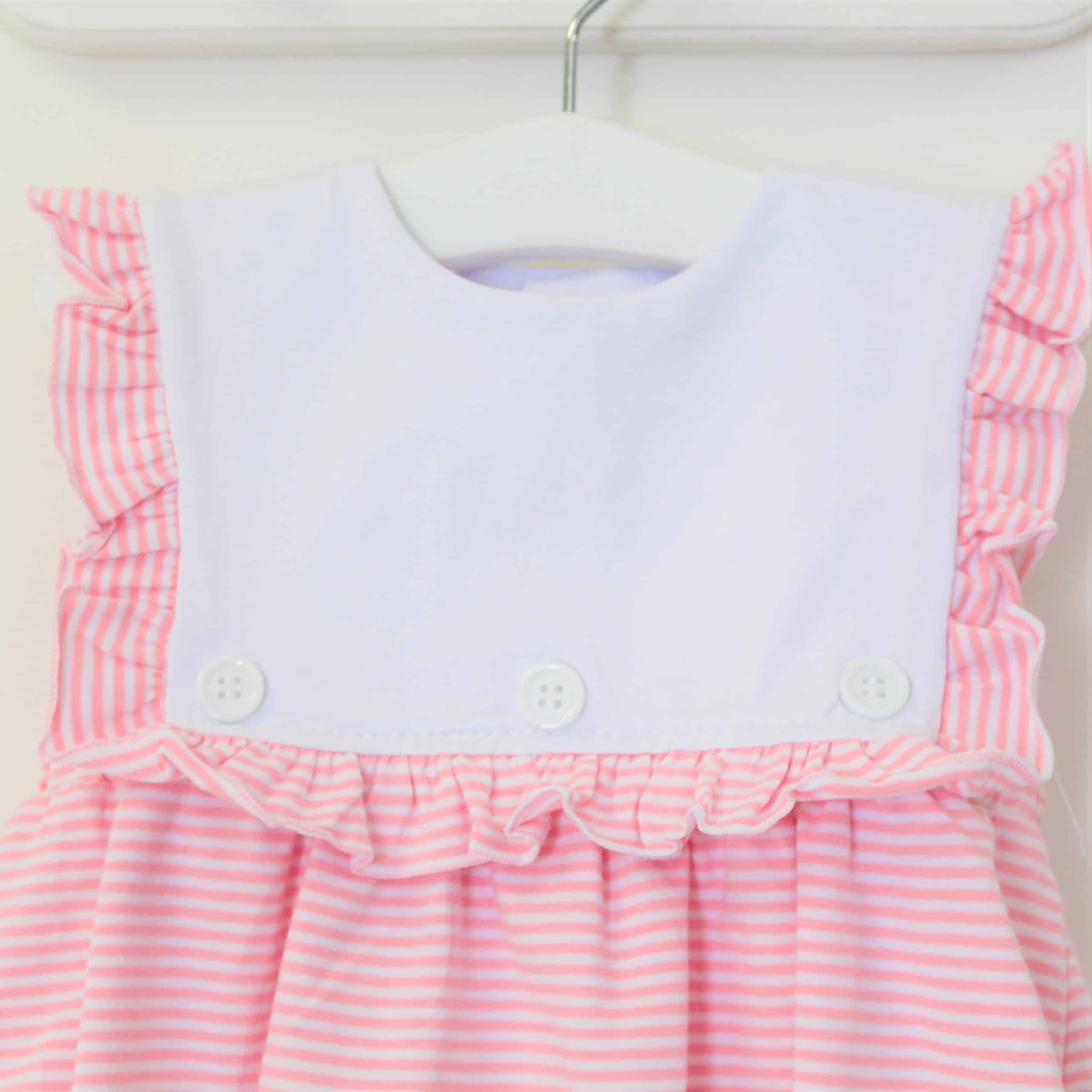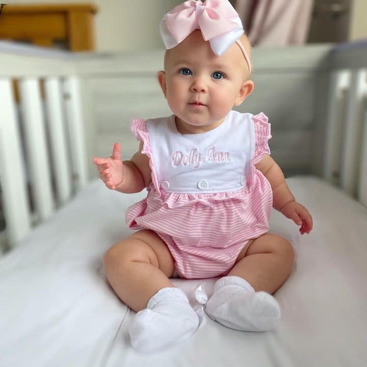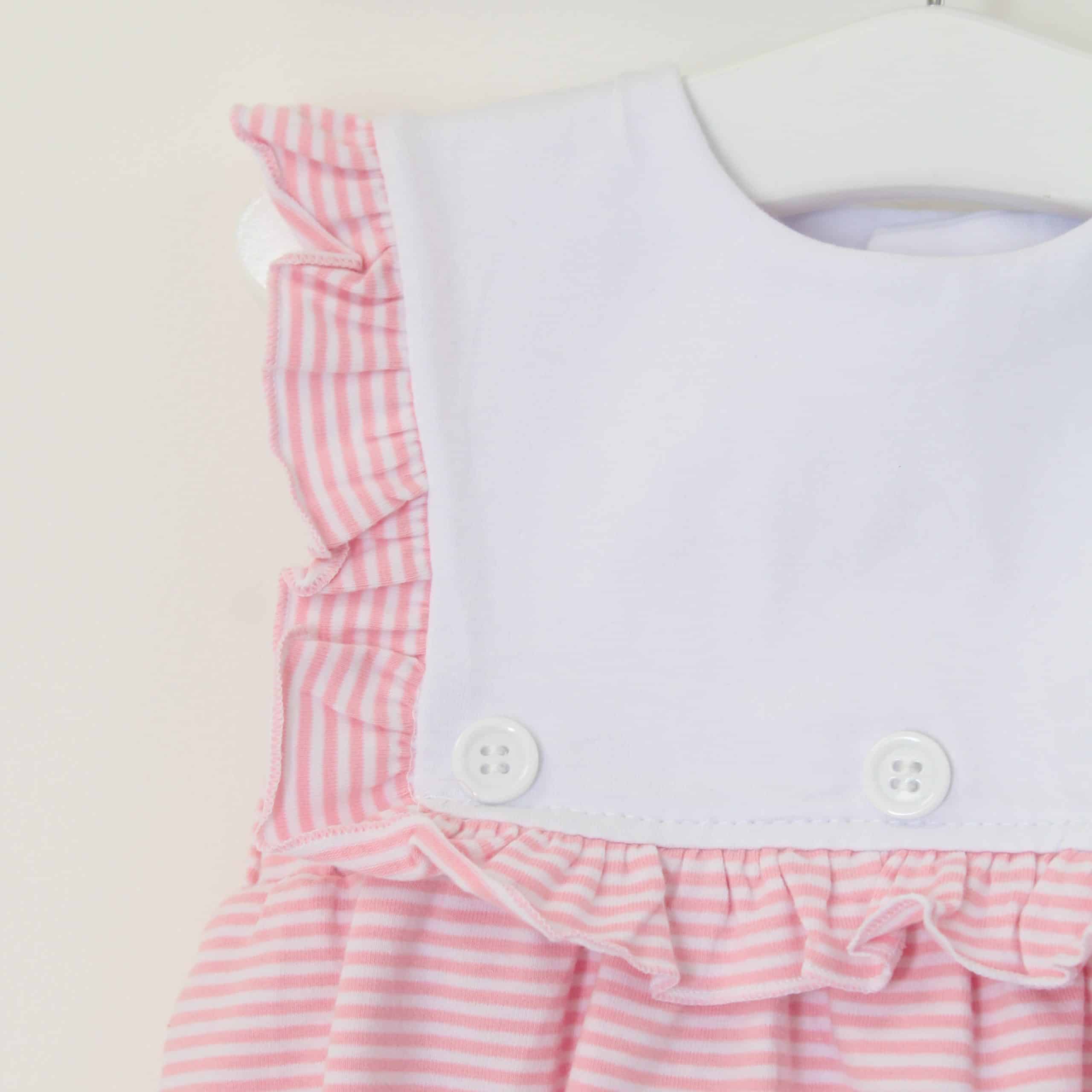 Dress your little one in timeless charm with our Baby Girls Sleeveless Pinstripe Romper from Perfect Little Thing. Crafted from 100% jersey cotton, this romper is as soft as it is stylish—perfect for delicate skin. The classic pinstripe print is complemented by a white frill panel at the front, creating an ideal space for personalized embroidery. Why not make it extra special with a name or monogram?