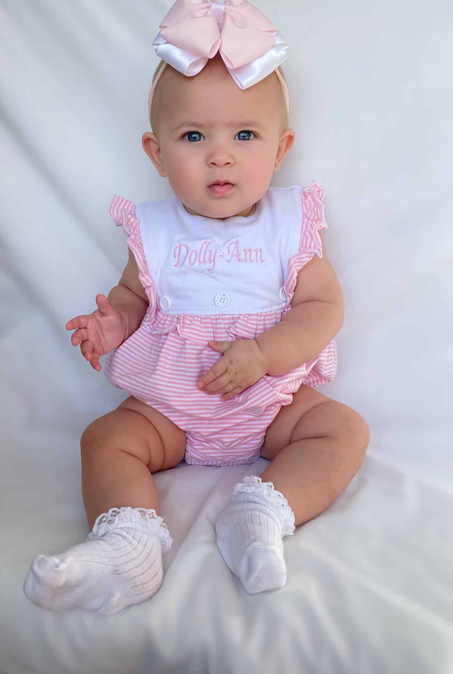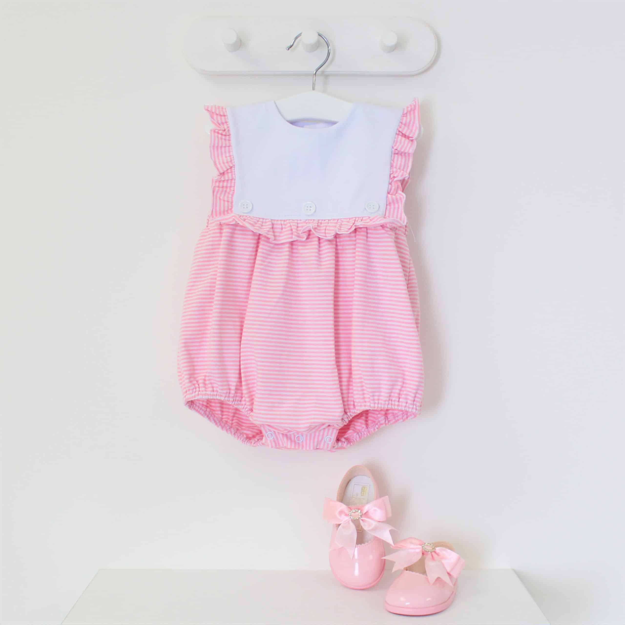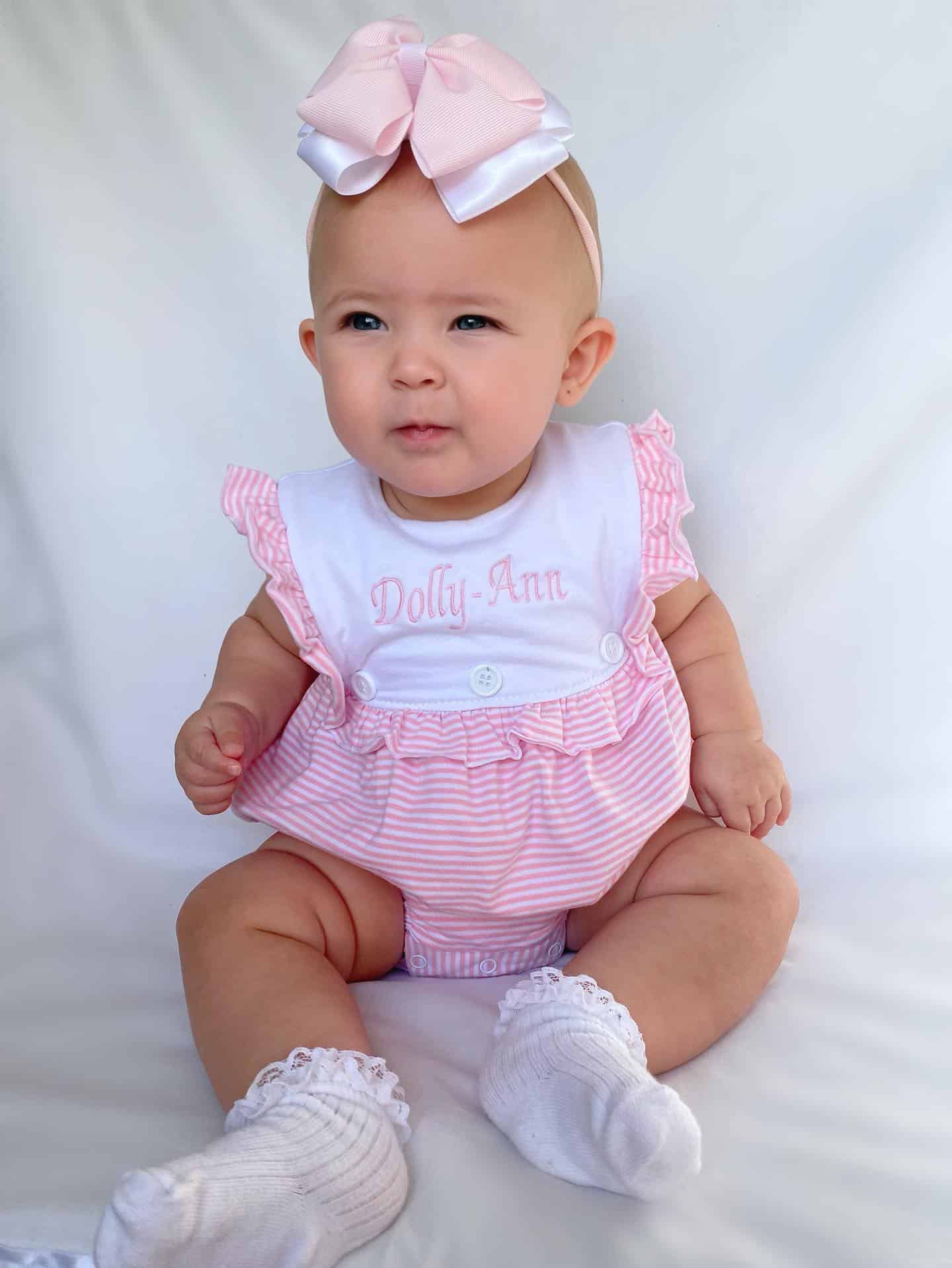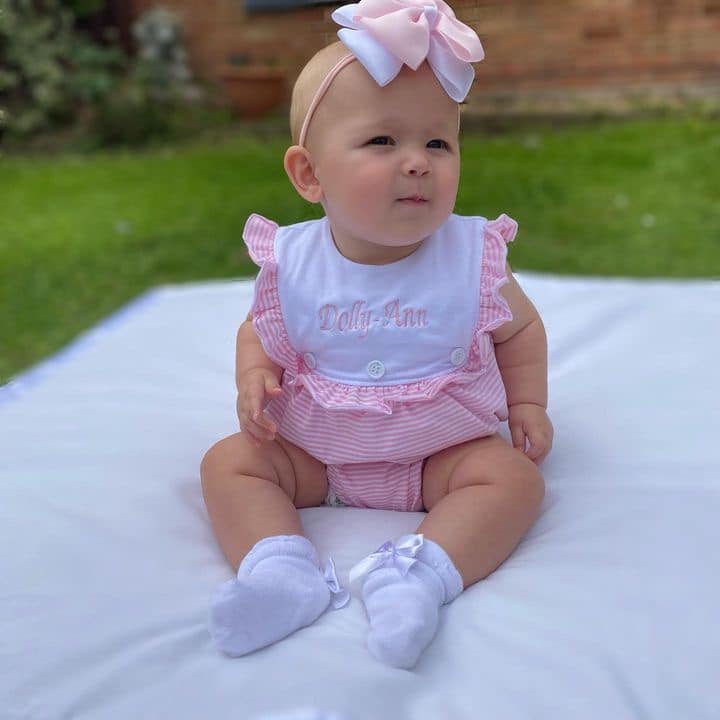 Dress your little one in timeless charm with our Baby Girls Sleeveless Pinstripe Romper from Perfect Little Thing. Crafted from 100% jersey cotton, this romper is as soft as it is stylish—perfect for delicate skin. The classic pinstripe print is complemented by a white frill panel at the front, creating an ideal space for personalized embroidery. Why not make it extra special with a name or monogram?
