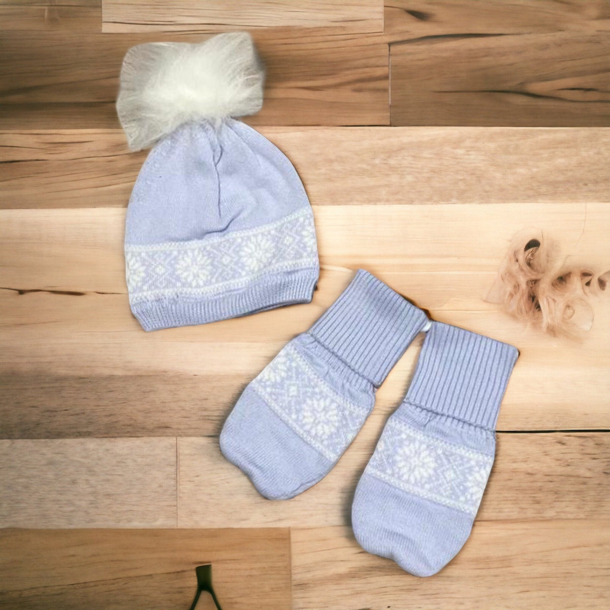 Caramelo Kids Fairisle mittens and hat set - stretchy knit hat with faux fur pom pom and matching mittens, with soft jersey lining. Warm and cozy.