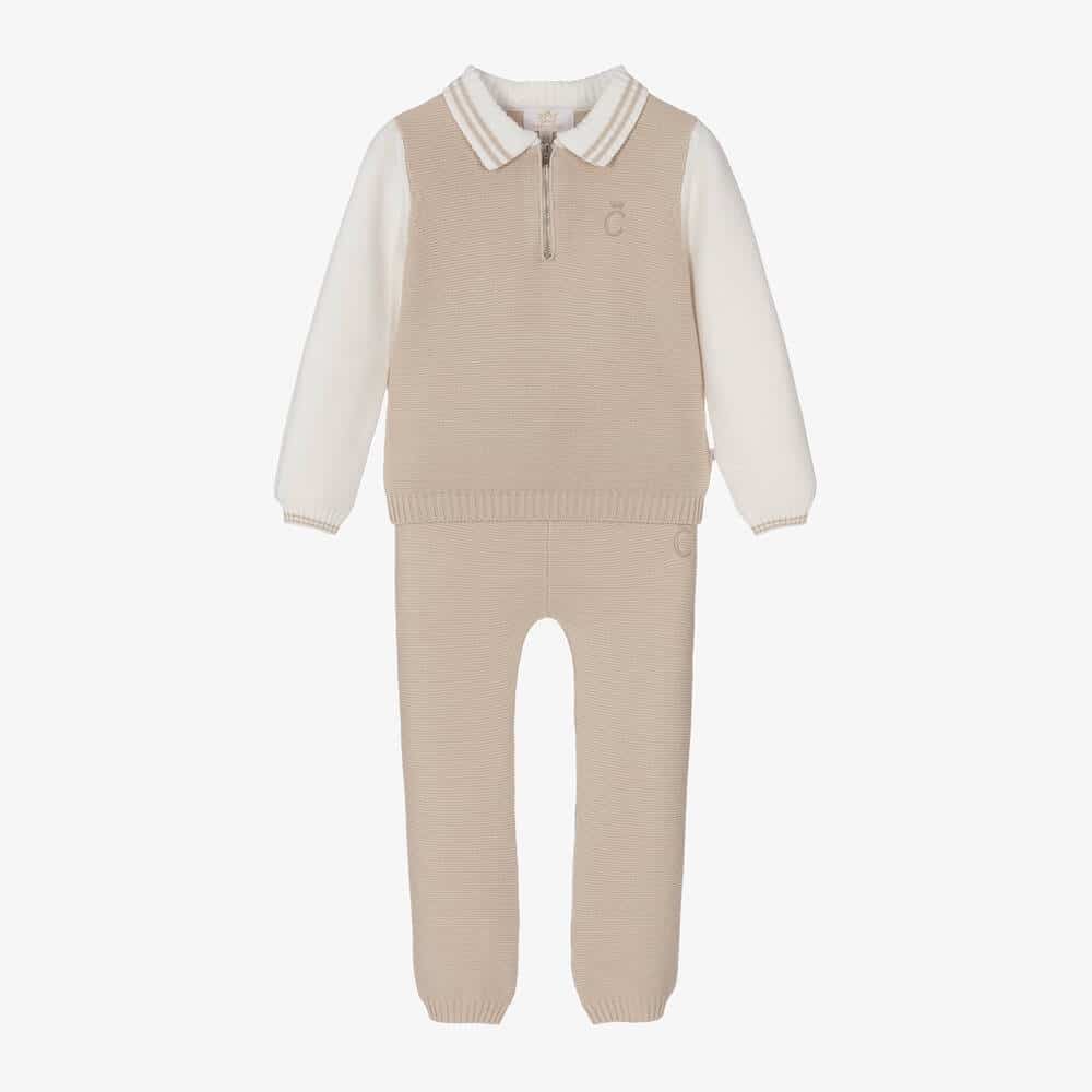 Casual beige trouser set for boys by British brand Caramelo Kids, made in a lightweight knit with embroidered monogram logos and ribbed trims on both pieces. In the style of a polo shirt, the long-sleeved top has beige stripes on the ivory collar and a half-zip fastening. The trousers have a drawstring waist, with gold eyelets, for a great fit and useful front pockets.