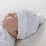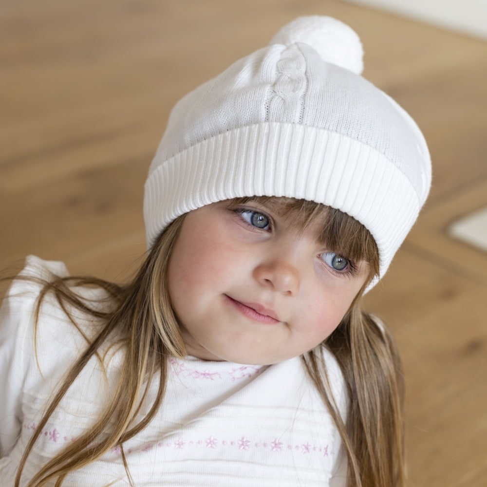 In bright white this baby bobble hat is a favourite winter hat for boys or girls. Perfect for chilly winter days this knitted hat has a turn-back rib.