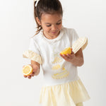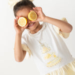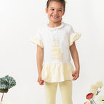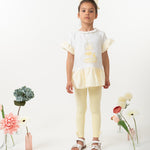 Pretty white and Lemon leggings set for girls by Caramelo Kids, made in soft jersey. The top has lovely layered cotton sleeves and a tiered cotton hem. The front features a sweet ballerina shoes design with pink tulle bows, sparkly diamanté and pearl beads. The full length leggings have matching tulle trims around the ankles and an elasticated waistband for comfortable wear.