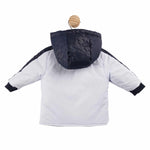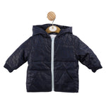 A lovely smooth reversible blue puffer jacket for boys by Mintini Baby. Softly padded for comfort and warmth, it fastens with a zip down the front. There are useful pockets on the front and the fixed hood.