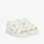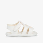 Charming first walker sandals for baby boys and girls by Early Days. Made in soft white faux leather, they have a lightly padded insole for comfort and fasten with a velcro strap for easy dressing. The non-slip rubber soles provide a sturdy grip and aid walking.