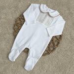 Keep your little one comfortable and stylish with this elegant white cotton sleepsuit. Made from soft, breathable fabric, it features a beautifully embroidered smocked panel on the chest for a traditional touch. The Peter Pan collar, finished with a delicate beige trim, adds classic charm. Designed with built-in feet for extra coziness and practical popper fastenings for easy changing, this sleepsuit is perfect for both everyday wear and special occasions.