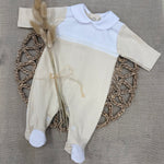 Keep your little one comfortable and stylish with this elegant white cotton sleepsuit. Made from soft, breathable fabric, it features a beautifully embroidered smocked panel on the chest for a traditional touch. The Peter Pan collar, finished with a delicate beige trim, adds classic charm. Designed with built-in feet for extra coziness and practical popper fastenings for easy changing, this sleepsuit is perfect for both everyday wear and special occasions.
