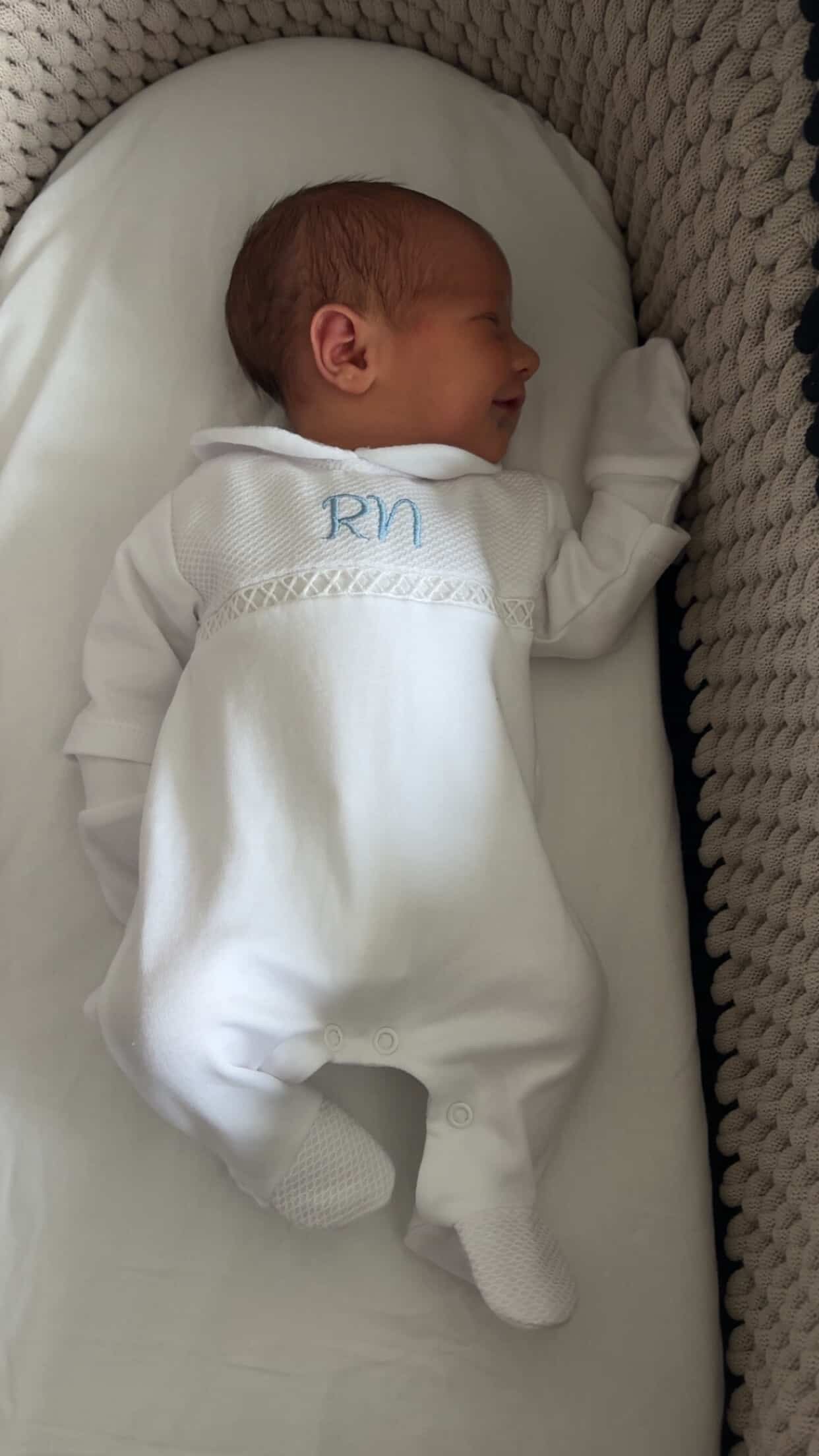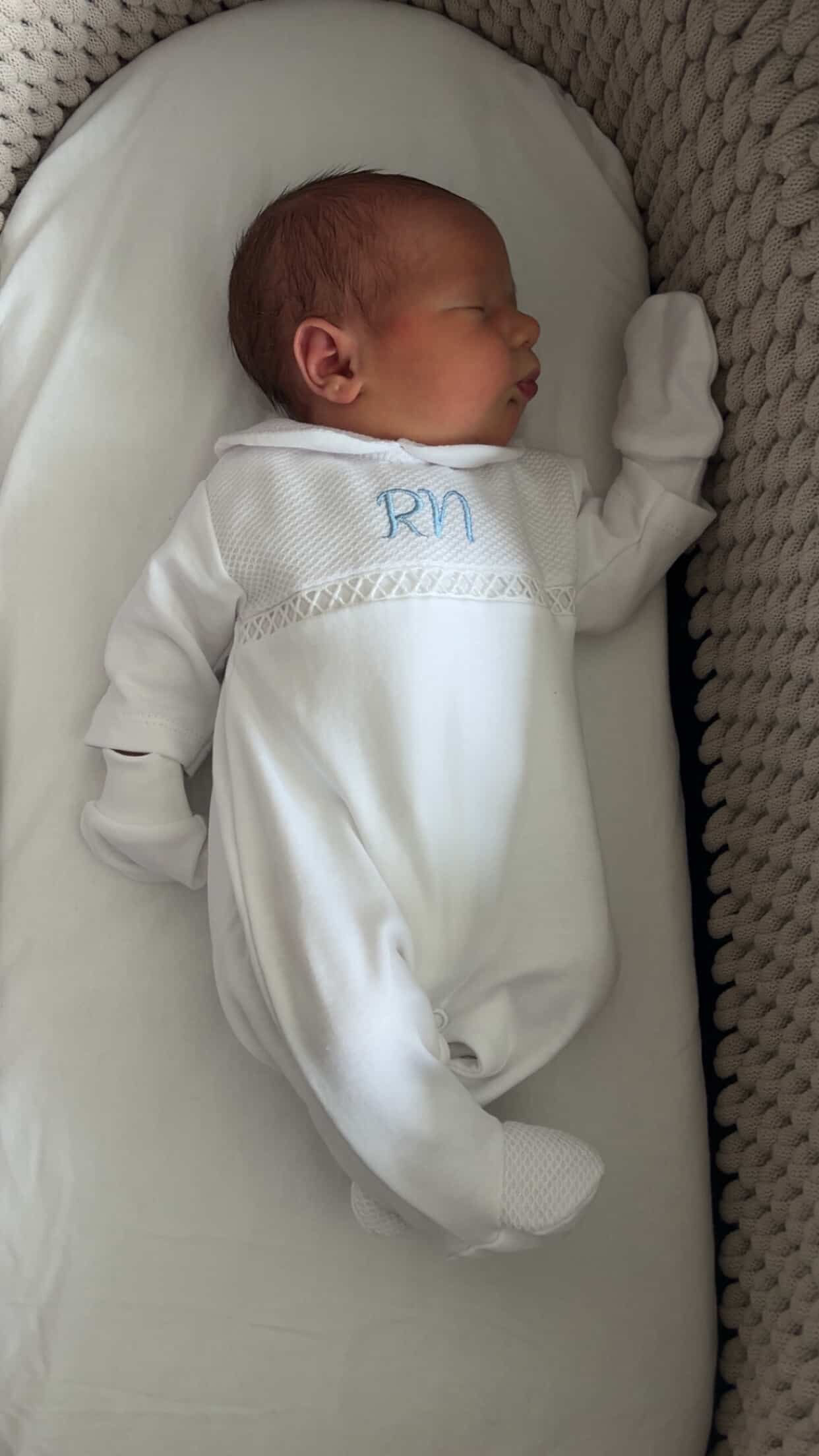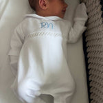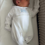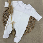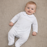 Keep your little one comfortable and stylish with this elegant white cotton sleepsuit. Made from soft, breathable fabric, it features a beautifully embroidered smocked panel on the chest for a traditional touch. The Peter Pan collar, finished with a delicate beige trim, adds classic charm. Designed with built-in feet for extra coziness and practical popper fastenings for easy changing, this sleepsuit is perfect for both everyday wear and special occasions.