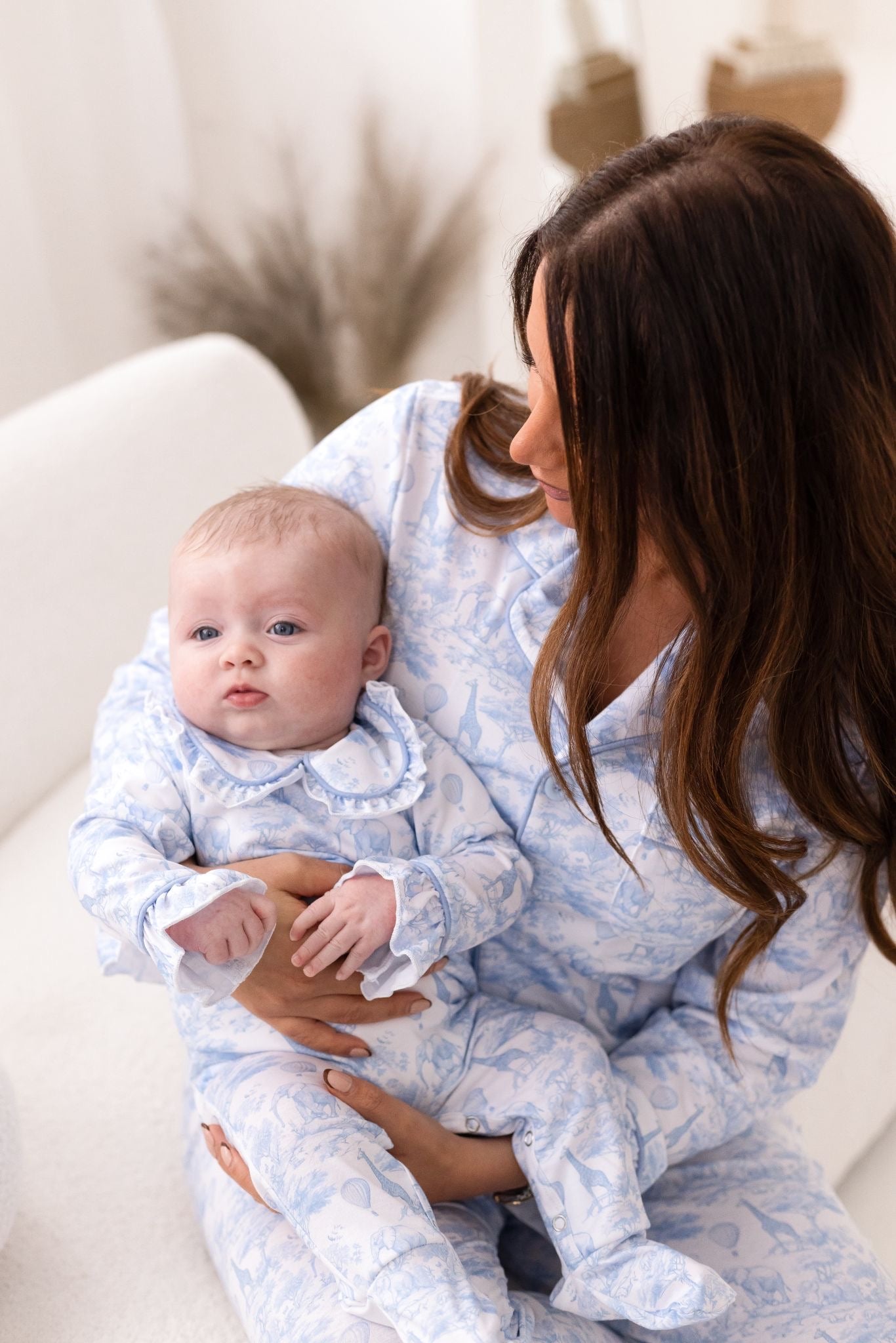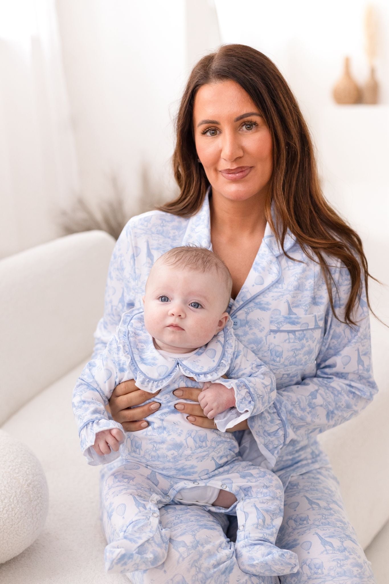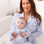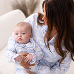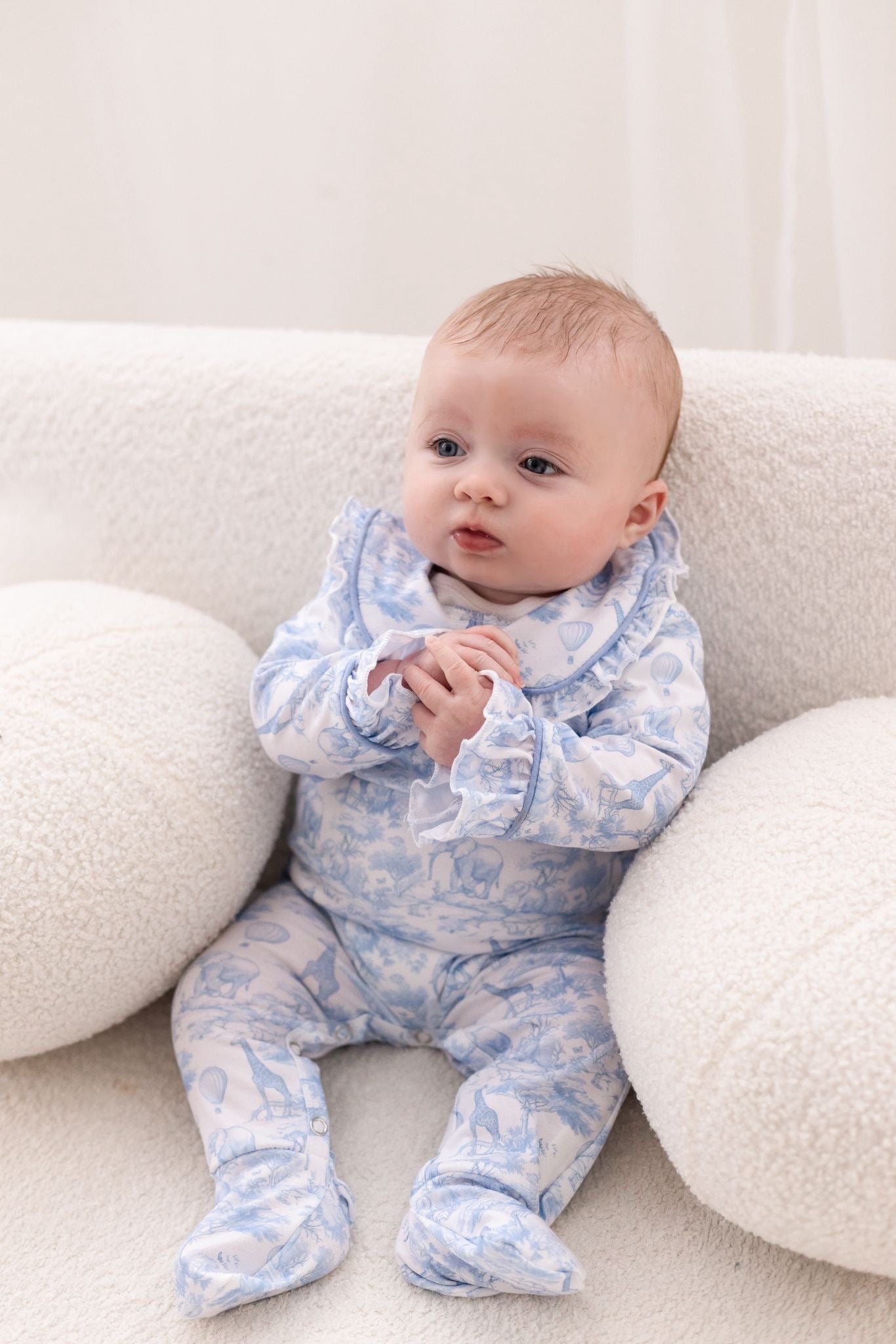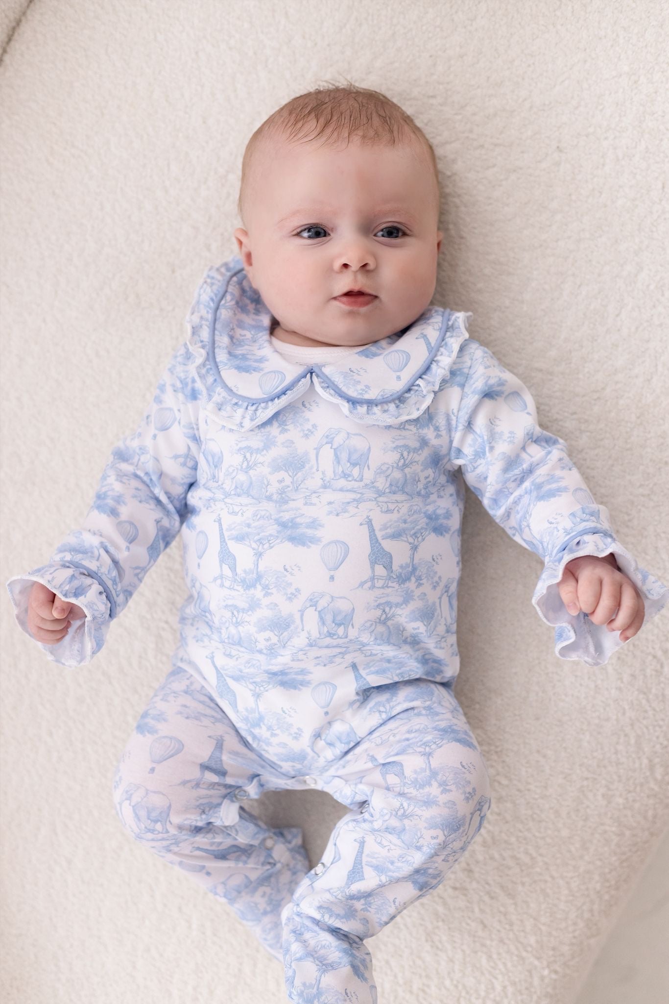 Meet our Baby Safari Toile Sleepsuit — a timeless, luxury essential for cosy nights and picture-perfect days. Designed in a beautiful soft blue safari toile print featuring adorable safari animals and hot air balloons, this sleepsuit brings classic style to everyday comfort.