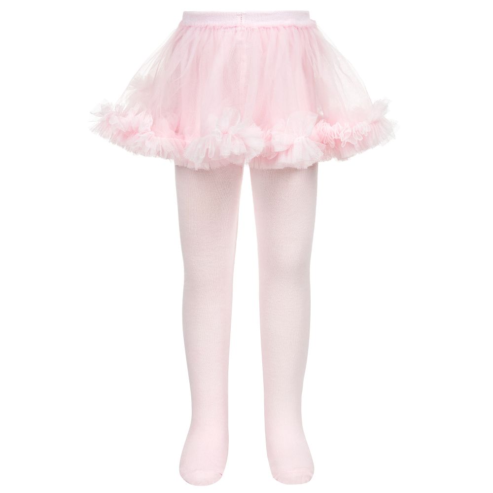 Younger girls pink tights with an attached tutu skirt by Caramelo Kids. Soft and comfortable, the tights are made in a stretchy cotton blend and the tulle skirt is gathered with a pretty ruffled trim.