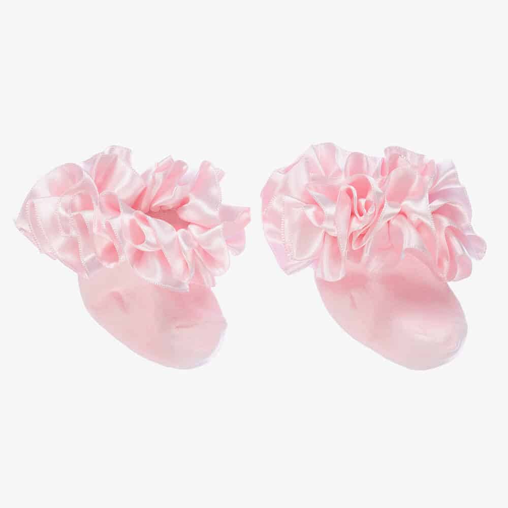 Girls pink ankle socks by Caramelo Kids, made in a soft and stretchy cotton blend with a ruffled satin ribbon around the top.