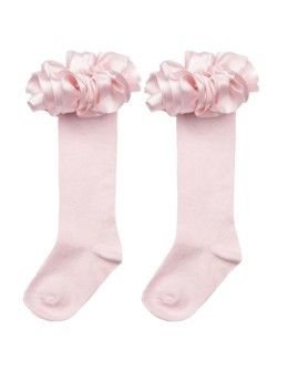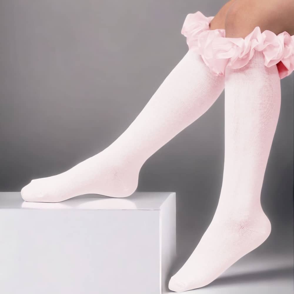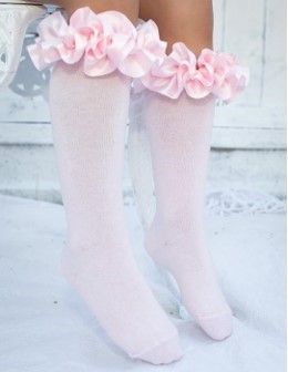 Girls White Knee socks by Caramelo Kids, made in a soft and stretchy cotton blend with a ruffled satin ribbon around the top.