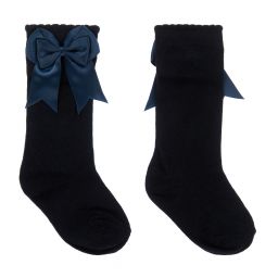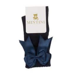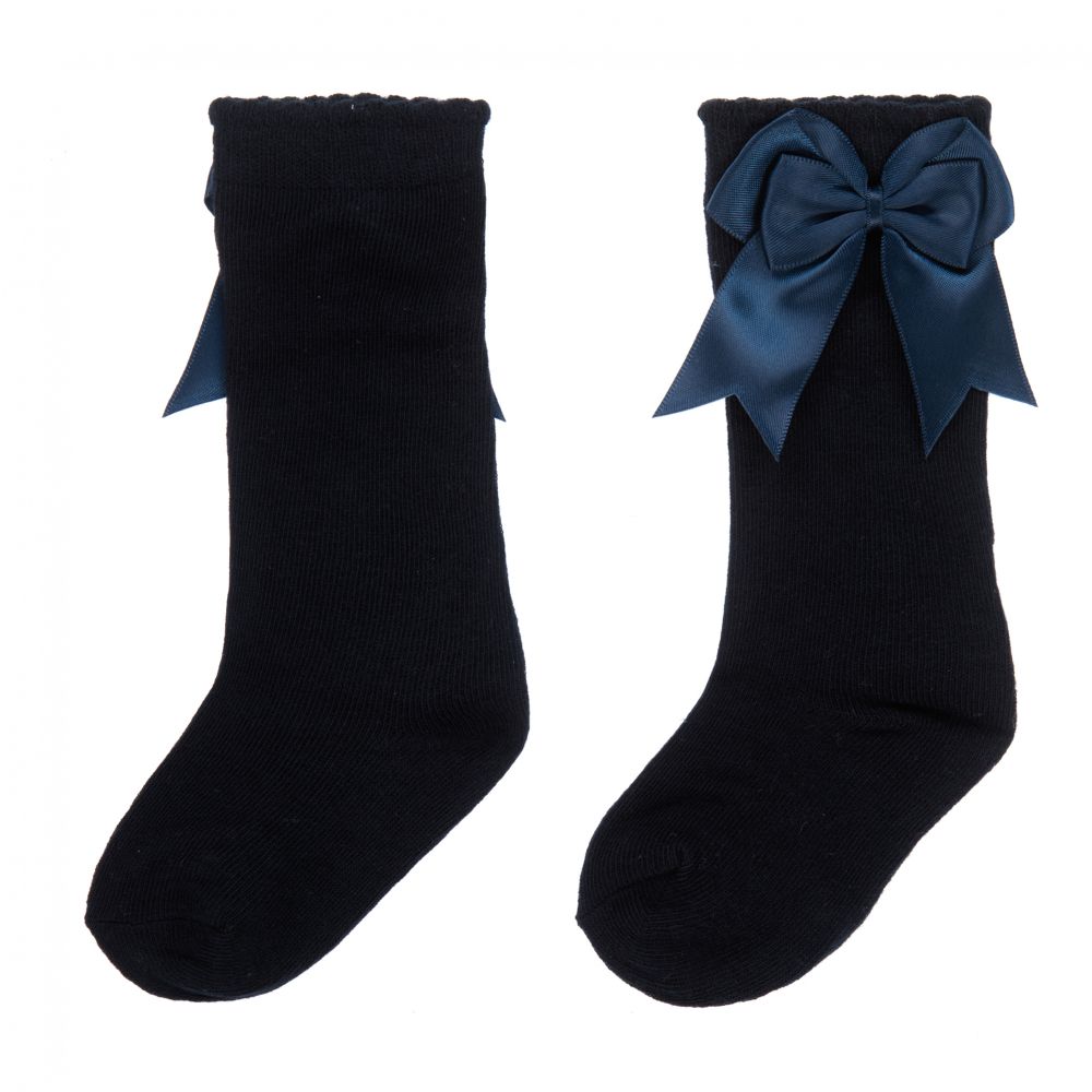 Navy blue socks for girls by Mintini Baby, made in soft and stretchy cotton. Each sock has a pretty satin ribbon bow at the side.
