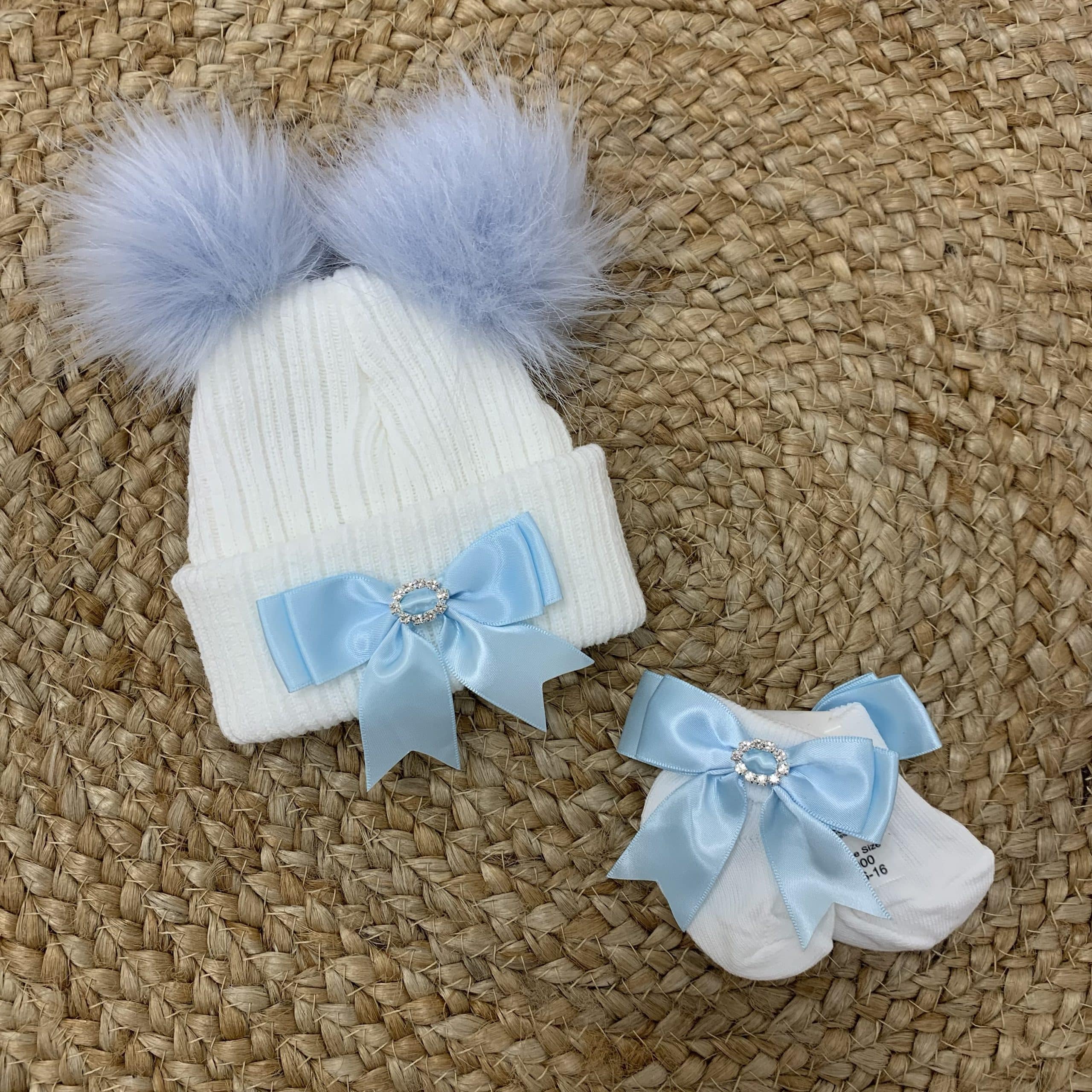 A gorgeous white wool beanie hat with blue fluffy poms featuring a blue diamond satin bow with socks to match
