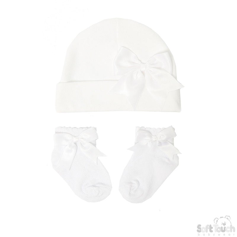 DESIGN/COLOUR: White Plain Colour Hat and Sock Set with bow